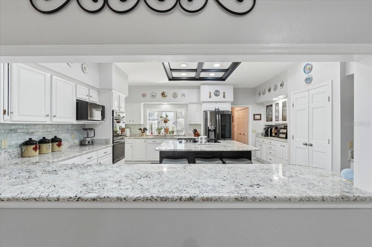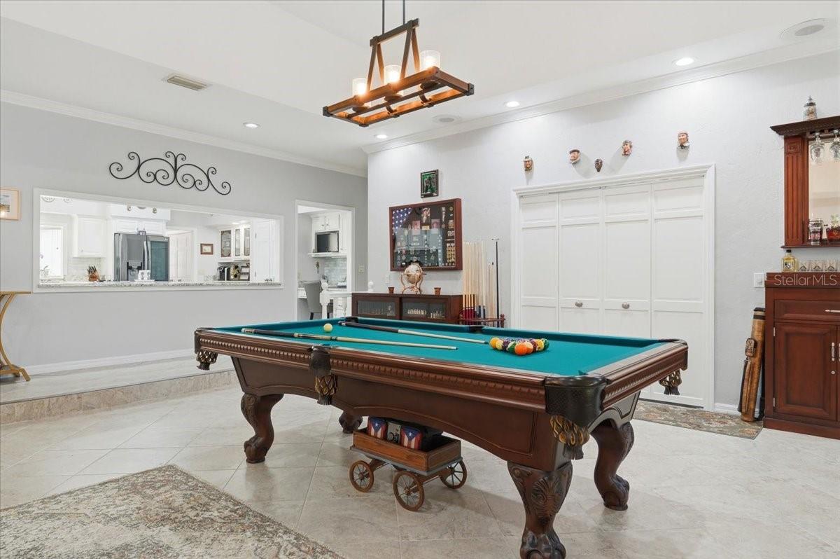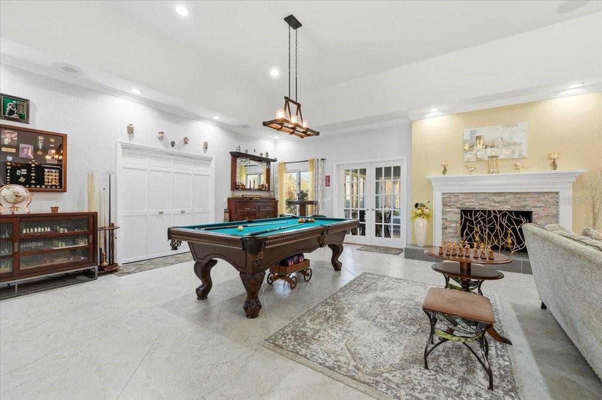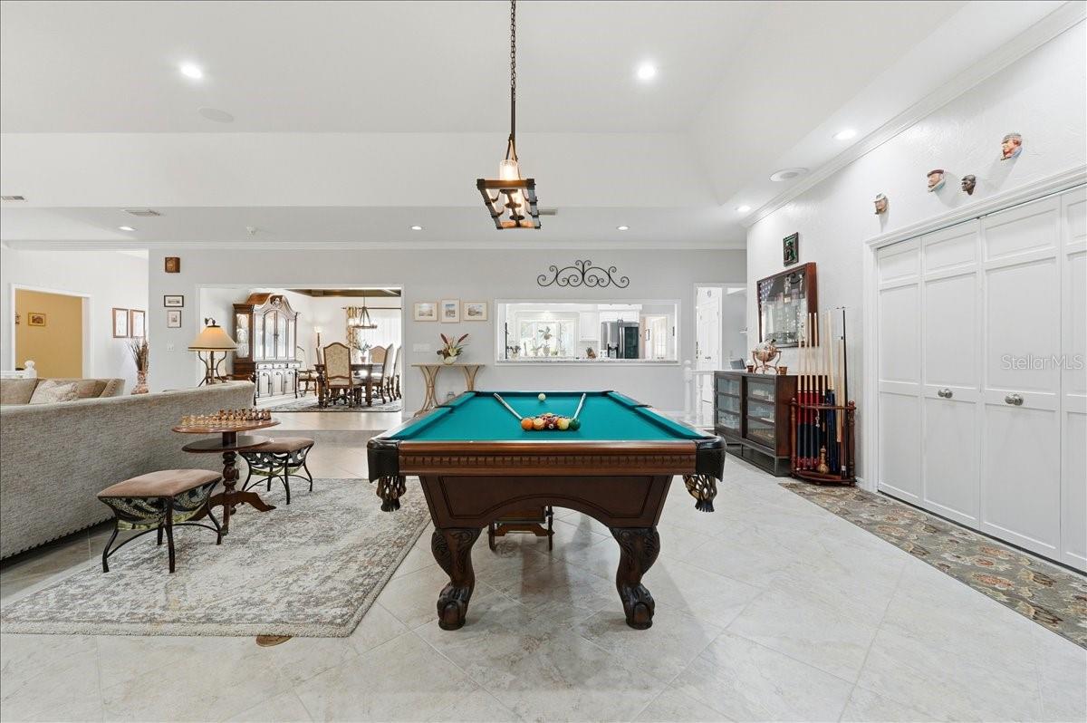 Built w/ intention & craftsmanship, this character-rich neighborhood reflects a time when homes were thoughtfully designed. Within this custom-community, sits your future home boasting ~4,000 H SqFt w/ 3BR, 3.5BA on nearly 1/2 an acre. W/ no req. HOA & no rear neighbors, this split-floorplan Home is designed for multi-generational comfort, where everyone has space w/out sacrificing connection. A newly stained front door welcomes you into an airy Foyer crowned by a dramatic tray ceiling w/ updated light-fixtures & sconces. Bose zone-able speakers provide customized audio in Main Areas & Pool, creating seamless ambiance for living & entertaining. Double-paned windows invite natural light while helping the home stay cool & serene. Beyond the entry, an expansive Great Room unfolds beneath soaring tray ceilings w/ refined fixtures & a wood-burning fireplace wrapped in updated stone. Dual sets of French doors fill the space w/ sunshine & create a timeless backdrop for entertaining. A new ½BA off the Great Room & between the Kitchen sits perfect for company. A granite wet bar w/ sink & wine fridge anchors the room, while the pool table stands ready for evenings that linger. The Formal Dining Room showcases an elegantly-painted coffered ceiling, updated light fixture, & oversized window: tailor-made for dinner parties or late-night rounds of poker/dominoes! The renovated kitchen blends thoughtful design & functionality. Real wood cabinetry, granite countertops, double-ovens, built-in microwave, recessed lighting, passthrough bar, & 2 pantries make it a Cook’s dream! The enormous island w/ a built-in downdraft cooktop offers bar seating: perfect for guests to gather & watch the evening’s signature dish come to life. A bay window over the sink overlooks the front yard, turning dishwashing into a quiet moment w/ pleasant view. The Kitchen also features an under-lit workspace for homework or planning. The adjacent Laundry Room includes granite counters, sink, & pull-down ironing board. Connected by double-glass French doors, the Florida Room is wrapped in windows that flood the space w/ golden-hour light, creating seamless indoor/outdoor living w/ a classic Old Florida feel. The Primary BR is a haven defined by a soaring tray ceiling, generous windows, built-in cabinetry, office nook, & 2 walk-in closets w/ built-ins. The renovated Primary BA features dual sinks & makeup vanity area w/ granite, modern tile, & glass shower: illuminated by an expansive skylight that cascades natural light. At night, the Jacuzzi soaking tub rests beneath the skylight, inviting you to unwind after a long day w/ a glass of wine as soft moonlight streams in. Each Secondary Bedroom is generously sized w/ en-suite BA, solid-surface counters & shower, offering privacy for family & guests. Outdoors, the Covered Patio & Heated Pool sit beneath an elevated screened enclosure w/ frame lighting for glowing evenings. The uniquely shaped Pool is accented by a tiled waterfall whose steady sound creates a peaceful backdrop. Freshly mulched beds & settled gardens frame the yard, overlooking a boundless oasis. In addition to the 2-car garage is an additional golf-cart garage! Updates include 5-tone tile roof(Jan'26) & upgraded screened-gutters('22), pool pump & heater ('22), Water Water ('22) & triple-zone AC systems[2 units (~’23)]. Centrally located between Orlando & Tampa, this property offers a country-feel w/ seclusion & mastercraft rarely found today. All measurements approx