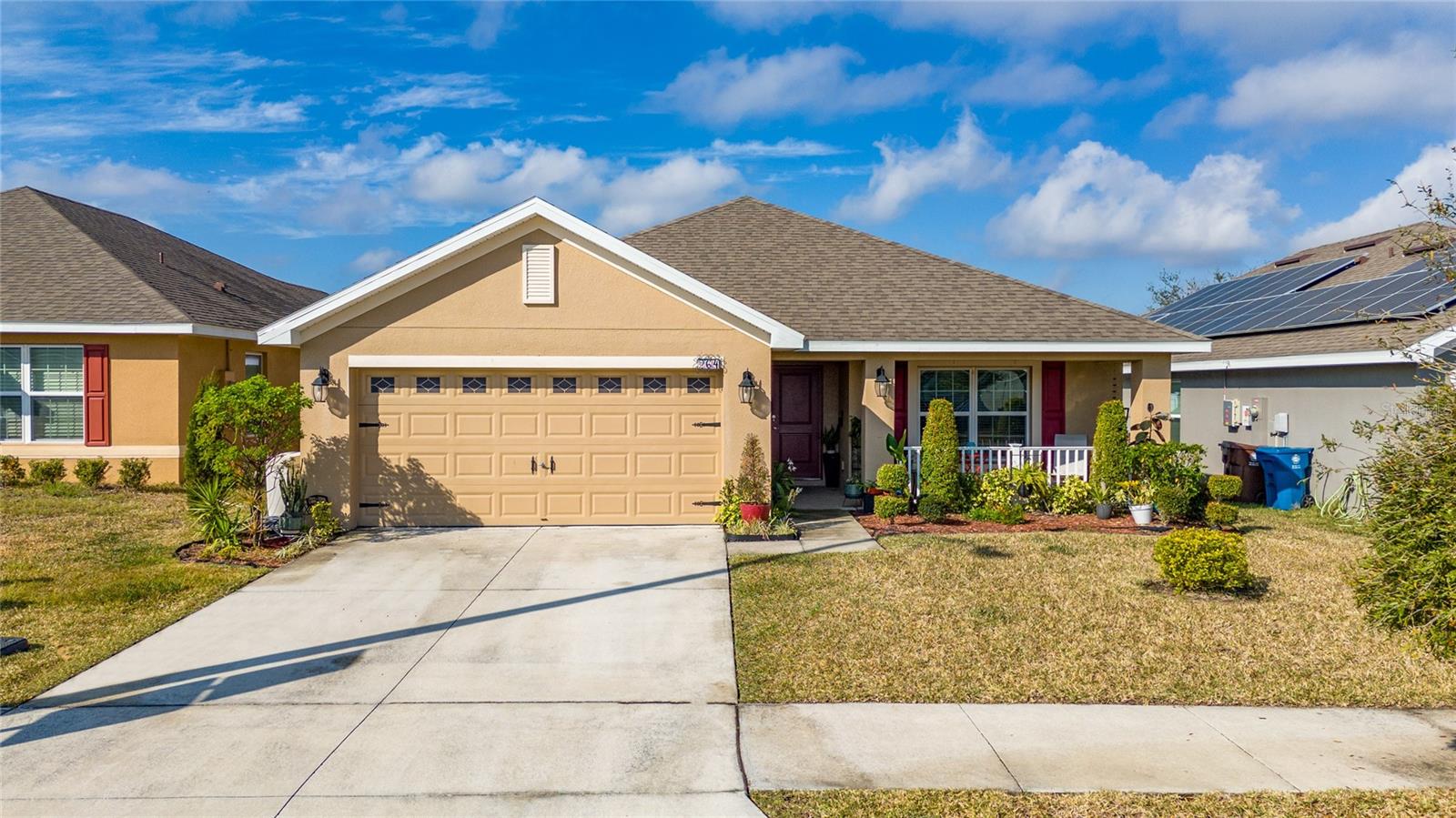Beautiful (Newer) 3 Bedrooms, 2 Bathrooms home in Ridge at Highland Meadows Community. The home offers a covered porch, Foyer, spacious kitchen with custom made wood cabinets, granite counter tops and oversized island. Large living room and formal dining room with plenty of lightning. Tile throughout except bedrooms. The Primary bedroom features a tray ceiling, a large walk-in closet with a Primary bathroom that offers plenty of space with double vanities, soak-in tub and a separate enclosed shower. Indoor Laundry room with storage and exit to a two car garage. The backyard is enclosed by a vinyl fence and a covered spacious Lanai. Other features include electricity saving *Solar Panels and Water Softener. The Community features a pool, park, playground and walking trails. The property is very close to schools and near the Central Florida attractions.