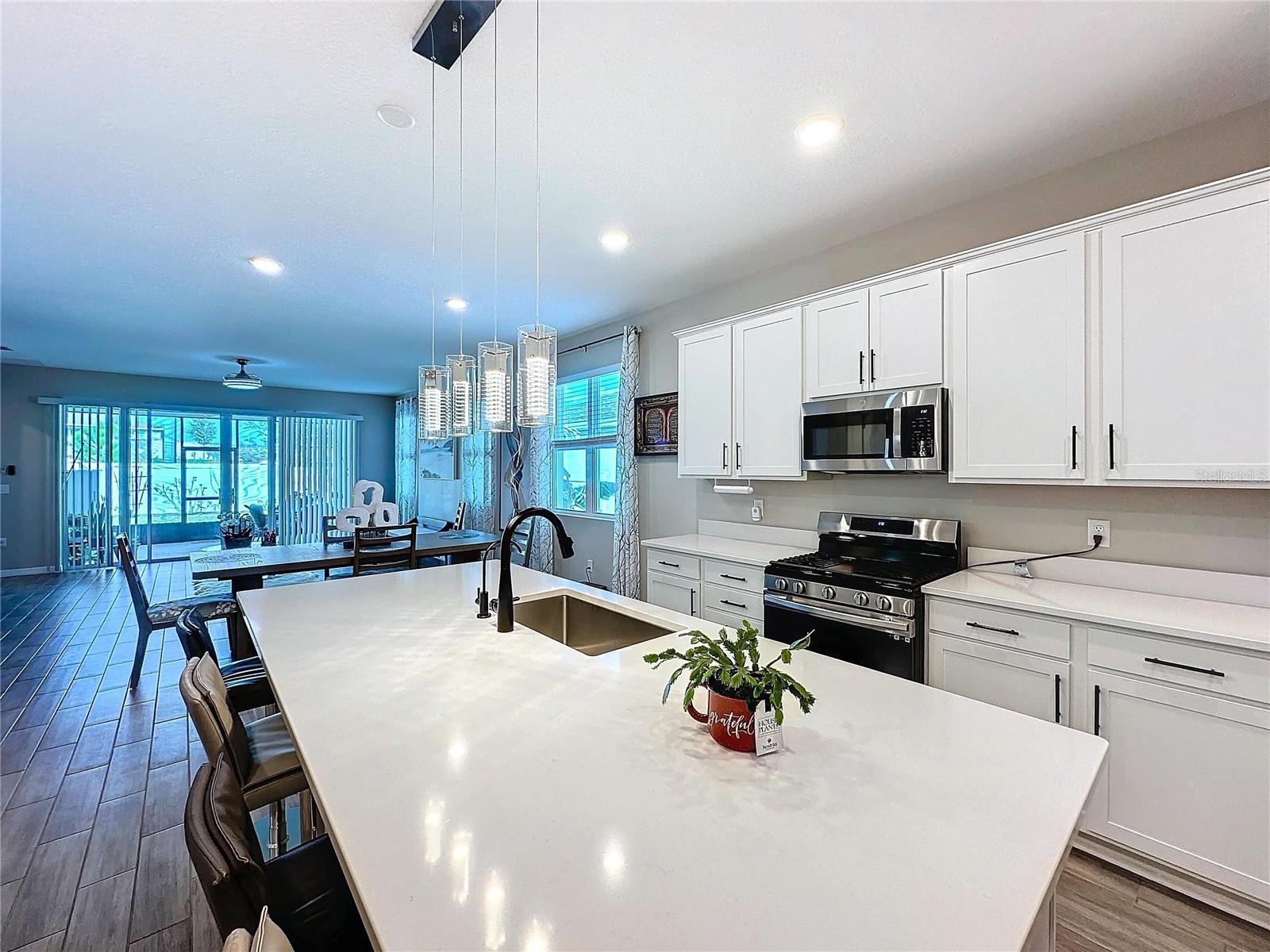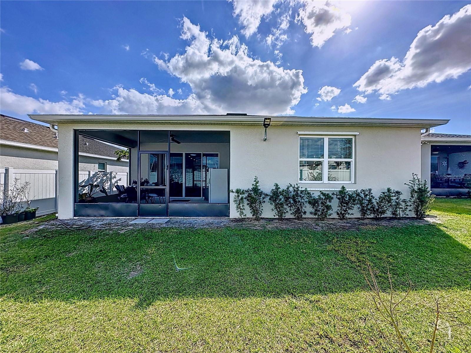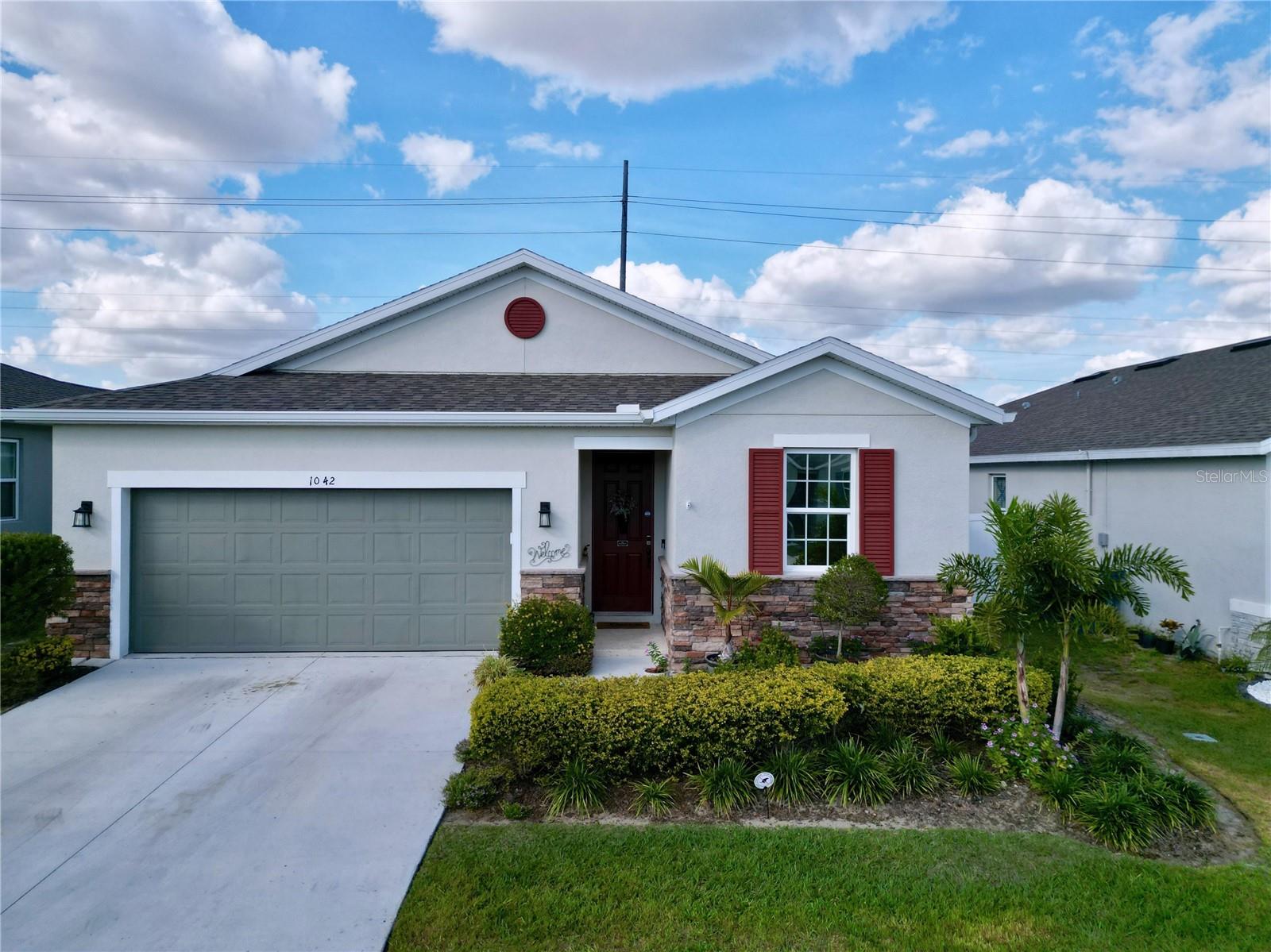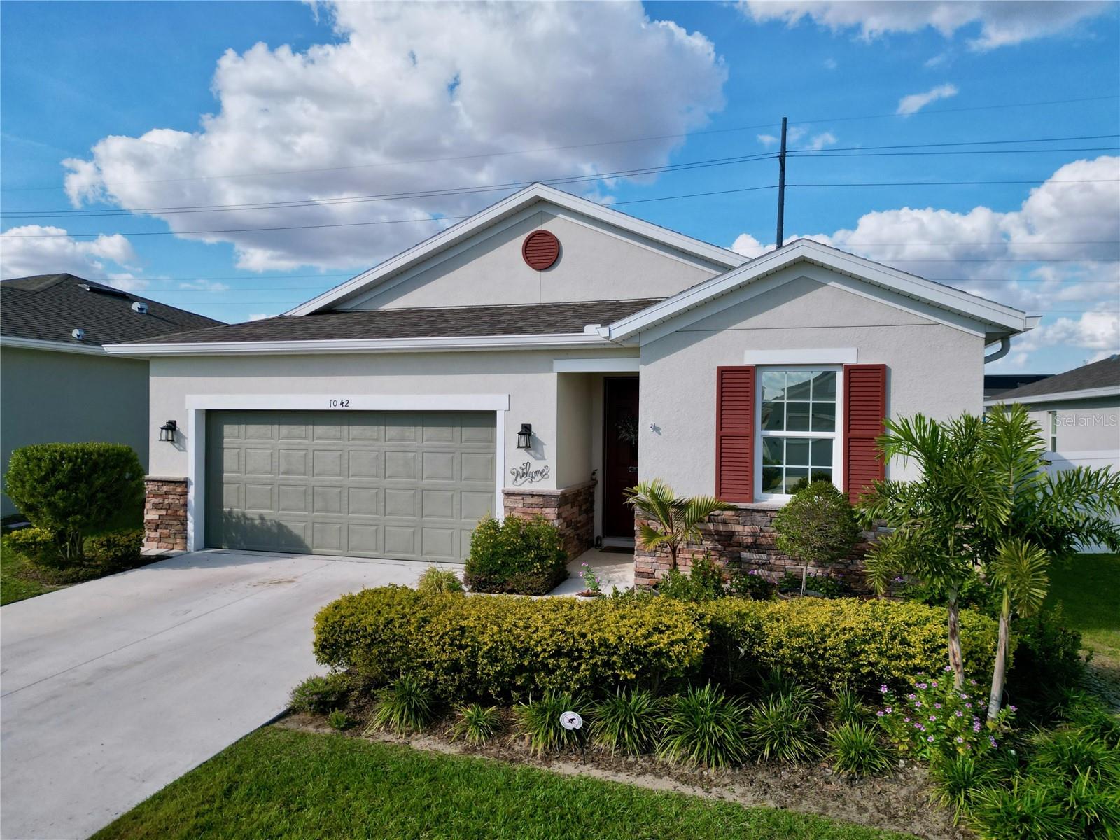 Welcome, you can't miss this great opportunity, This beautiful home has contemporary tile floors that flow seamlessly through the main hallway, dining room, kitchen, and great room. The luxury-style kitchen is a chef's dream, with sleek quartz countertops, 42" cabinets, and high-end GE stainless steel appliances. Imagine coming home from a long day and unwinding on a spacious screened-in lanai, offering privacy with no rear neighbors and a premium lot for added peace of mind. The spacious master suite offers a retreat-like experience, complete with an en-suite bathroom with a gorgeous tiled shower stall and double vanity. This home is packed with elegant upgrades, from the sleek stone facade and custom closet organizer in the master bedroom to the gas stove and upgraded central air conditioning with UV light. Additional details that make this property extraordinary include gutters a covered porch for outdoor enjoyment, and a ladder in the garage for extra storage so you don't have to pay for storage anymore. There are ceiling fans in the living room and lanai for added comfort. Beautiful lighting under the kitchen counters, blinds on every window for privacy, and a water filtration system with UV technology for the entire home. The landscaped backyard is a tropical paradise, with fruit trees such as soursop, avocado, acerola, grapefruit, fig, prunes, mango, papaya, and pennyroyal. Don't miss this incredible opportunity to own a home with luxurious finishes and practical amenities.