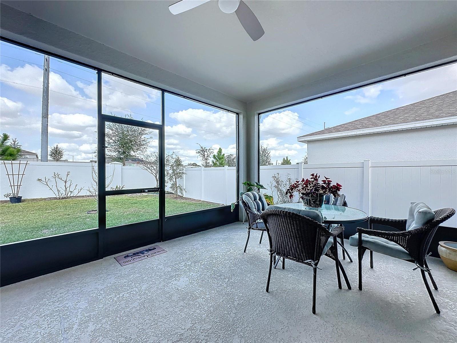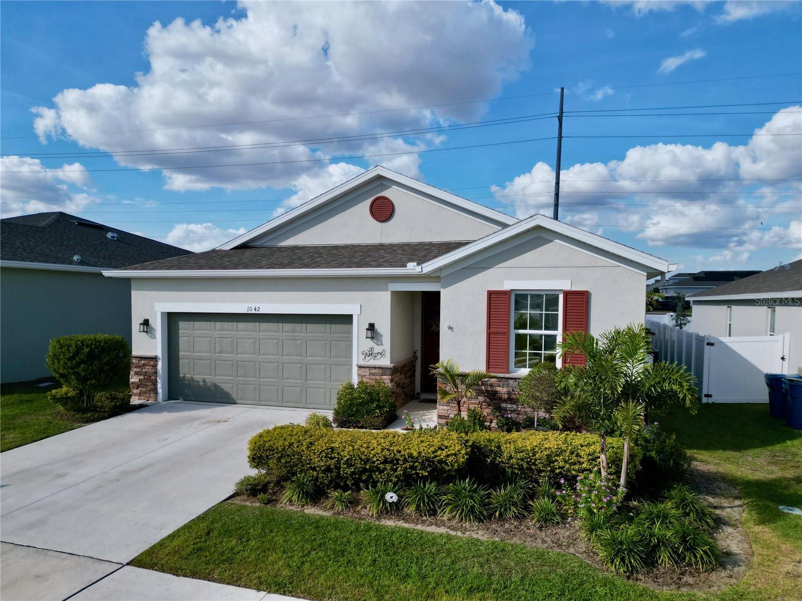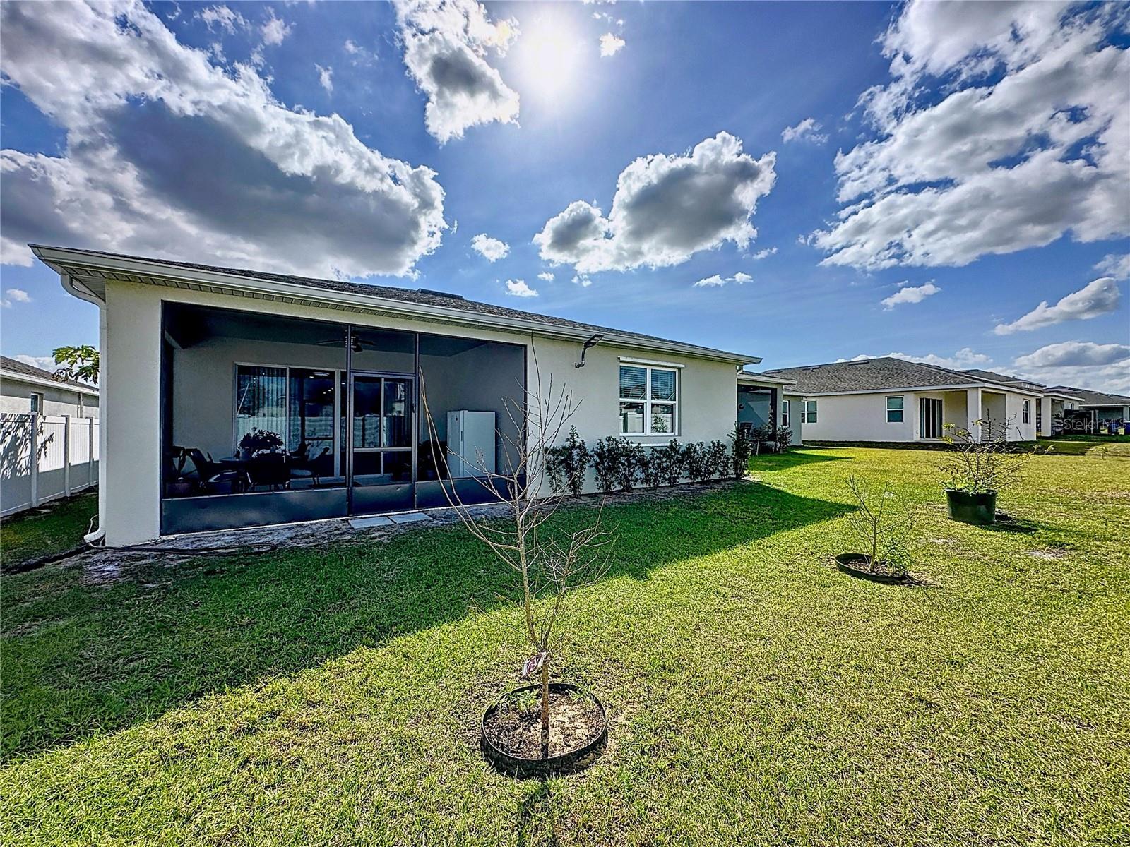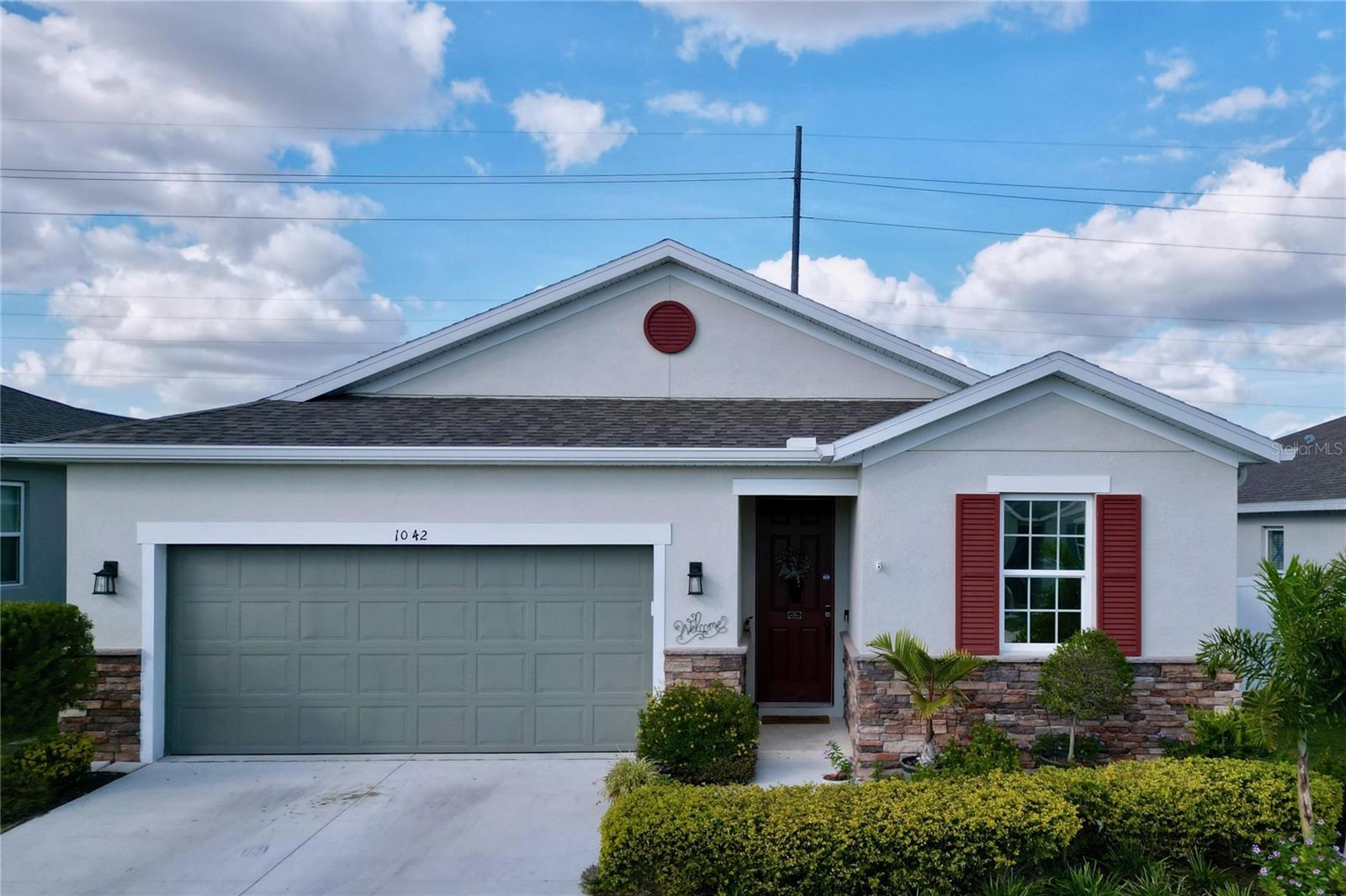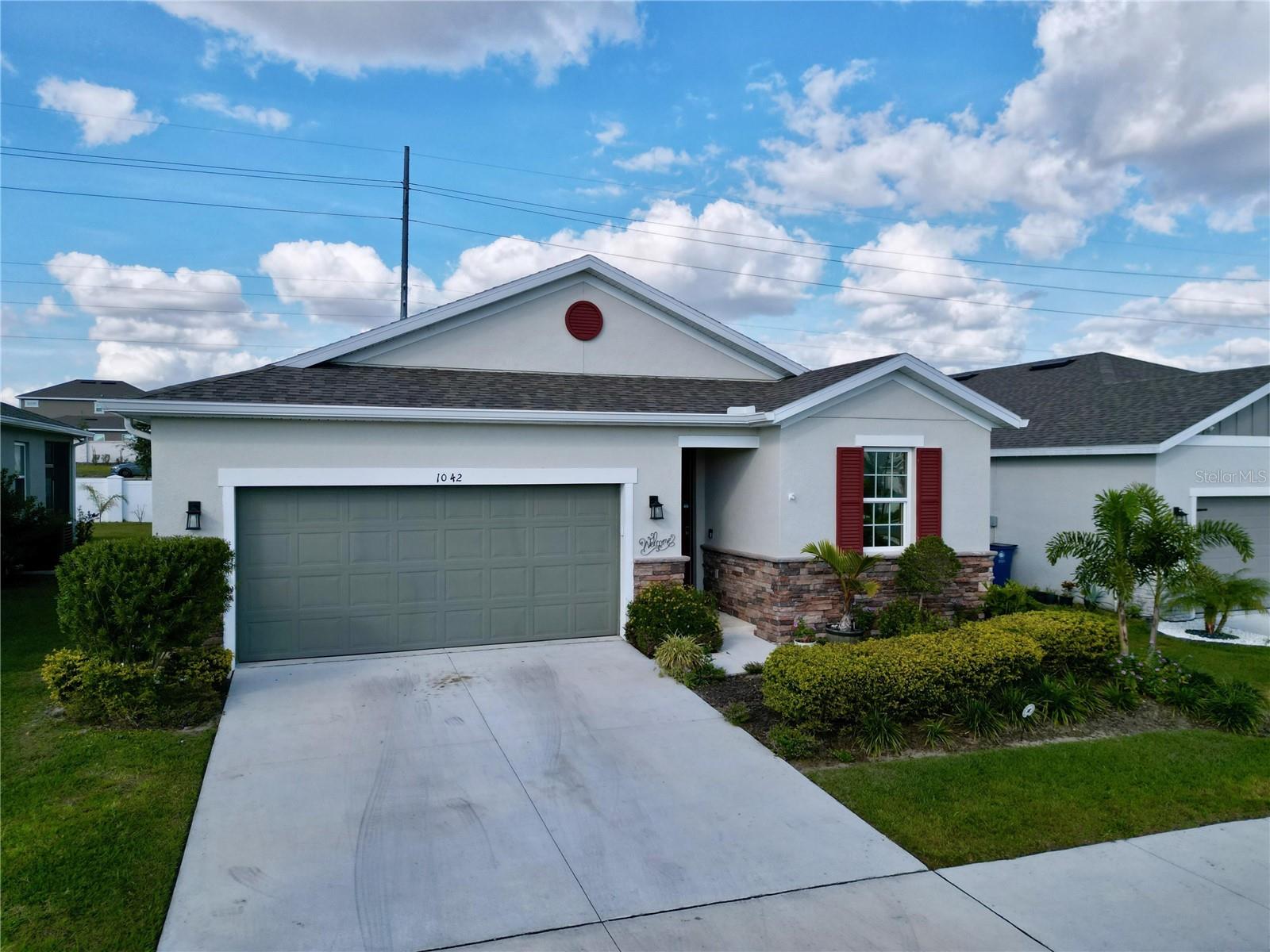 Welcome, you can't miss this great opportunity, This beautiful home has contemporary tile floors that flow seamlessly through the main hallway, dining room, kitchen, and great room. The luxury-style kitchen is a chef's dream, with sleek quartz countertops, 42" cabinets, and high-end GE stainless steel appliances. Imagine coming home from a long day and unwinding on a spacious screened-in lanai, offering privacy with no rear neighbors and a premium lot for added peace of mind. The spacious master suite offers a retreat-like experience, complete with an en-suite bathroom with a gorgeous tiled shower stall and double vanity. This home is packed with elegant upgrades, from the sleek stone facade and custom closet organizer in the master bedroom to the gas stove and upgraded central air conditioning with UV light. Additional details that make this property extraordinary include gutters a covered porch for outdoor enjoyment, and a ladder in the garage for extra storage so you don't have to pay for storage anymore. There are ceiling fans in the living room and lanai for added comfort. Beautiful lighting under the kitchen counters, blinds on every window for privacy, and a water filtration system with UV technology for the entire home. The landscaped backyard is a tropical paradise, with fruit trees such as soursop, avocado, acerola, grapefruit, fig, prunes, mango, papaya, and pennyroyal. Don't miss this incredible opportunity to own a home with luxurious finishes and practical amenities.