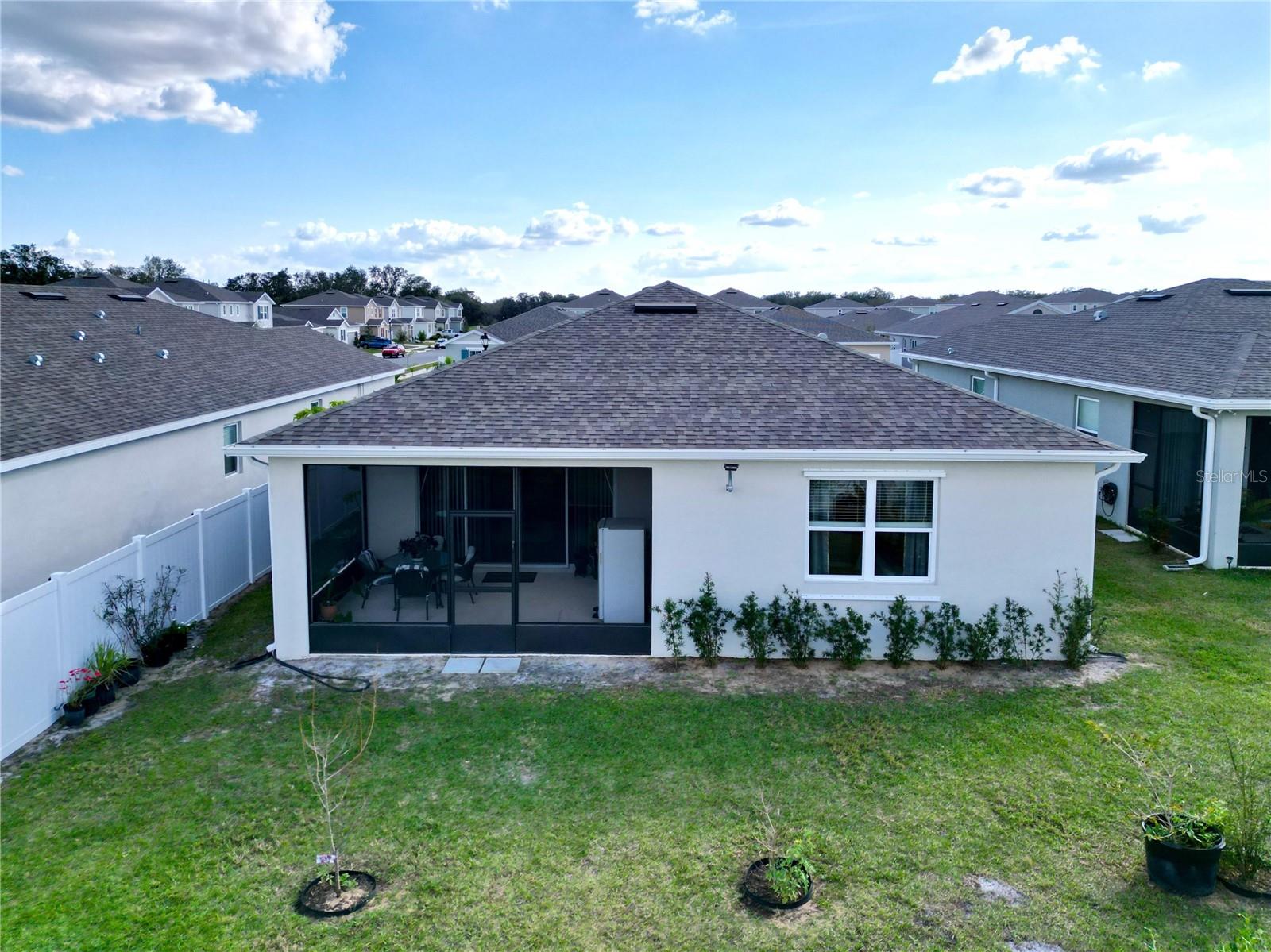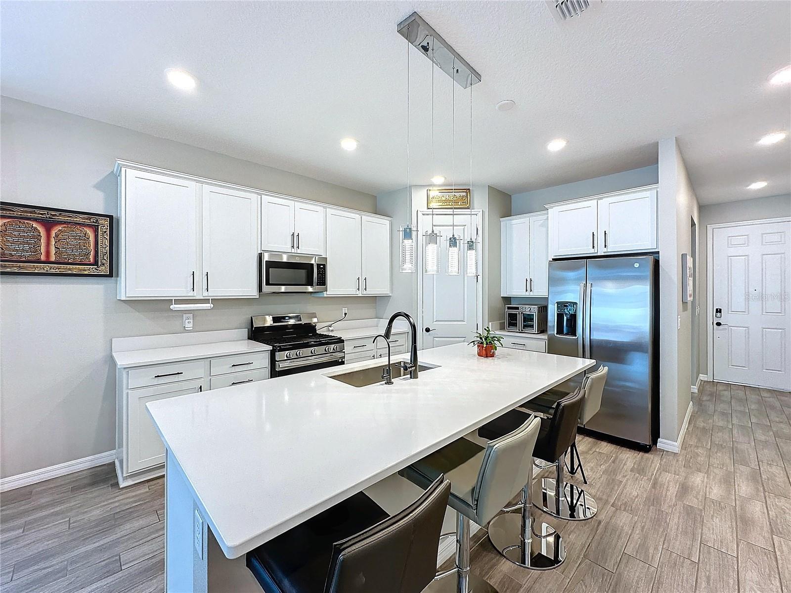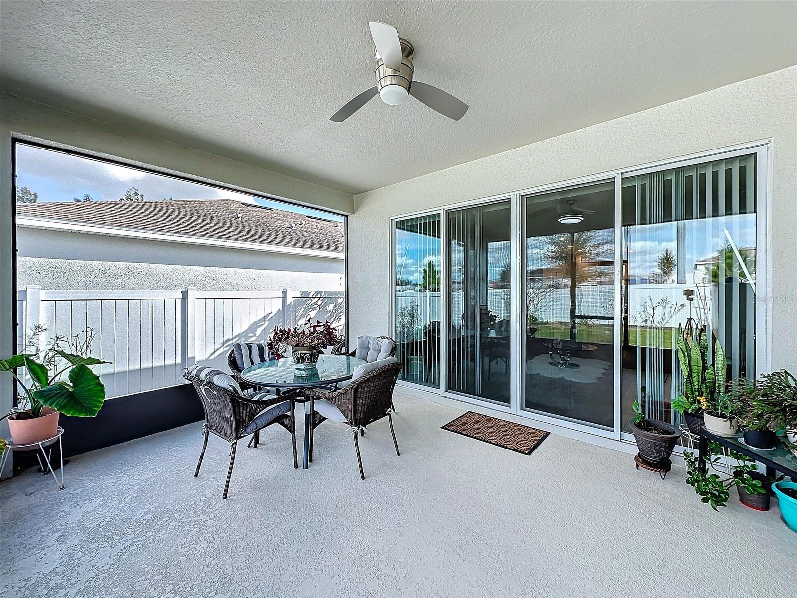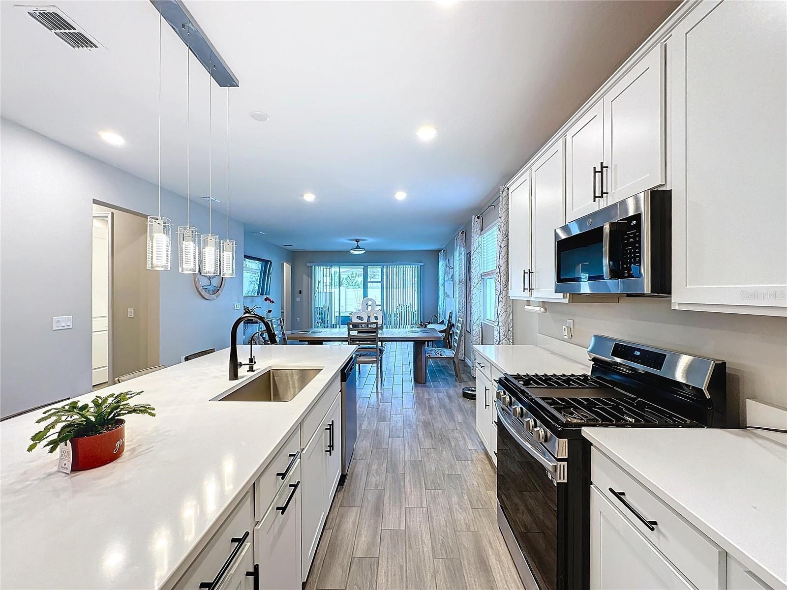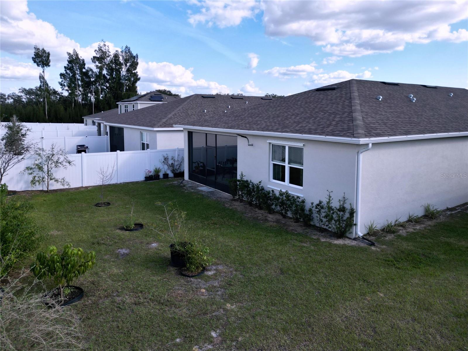 Welcome, you can't miss this great opportunity, This beautiful home has contemporary tile floors that flow seamlessly through the main hallway, dining room, kitchen, and great room. The luxury-style kitchen is a chef's dream, with sleek quartz countertops, 42" cabinets, and high-end GE stainless steel appliances. Imagine coming home from a long day and unwinding on a spacious screened-in lanai, offering privacy with no rear neighbors and a premium lot for added peace of mind. The spacious master suite offers a retreat-like experience, complete with an en-suite bathroom with a gorgeous tiled shower stall and double vanity. This home is packed with elegant upgrades, from the sleek stone facade and custom closet organizer in the master bedroom to the gas stove and upgraded central air conditioning with UV light. Additional details that make this property extraordinary include gutters a covered porch for outdoor enjoyment, and a ladder in the garage for extra storage so you don't have to pay for storage anymore. There are ceiling fans in the living room and lanai for added comfort. Beautiful lighting under the kitchen counters, blinds on every window for privacy, and a water filtration system with UV technology for the entire home. The landscaped backyard is a tropical paradise, with fruit trees such as soursop, avocado, acerola, grapefruit, fig, prunes, mango, papaya, and pennyroyal. Don't miss this incredible opportunity to own a home with luxurious finishes and practical amenities.