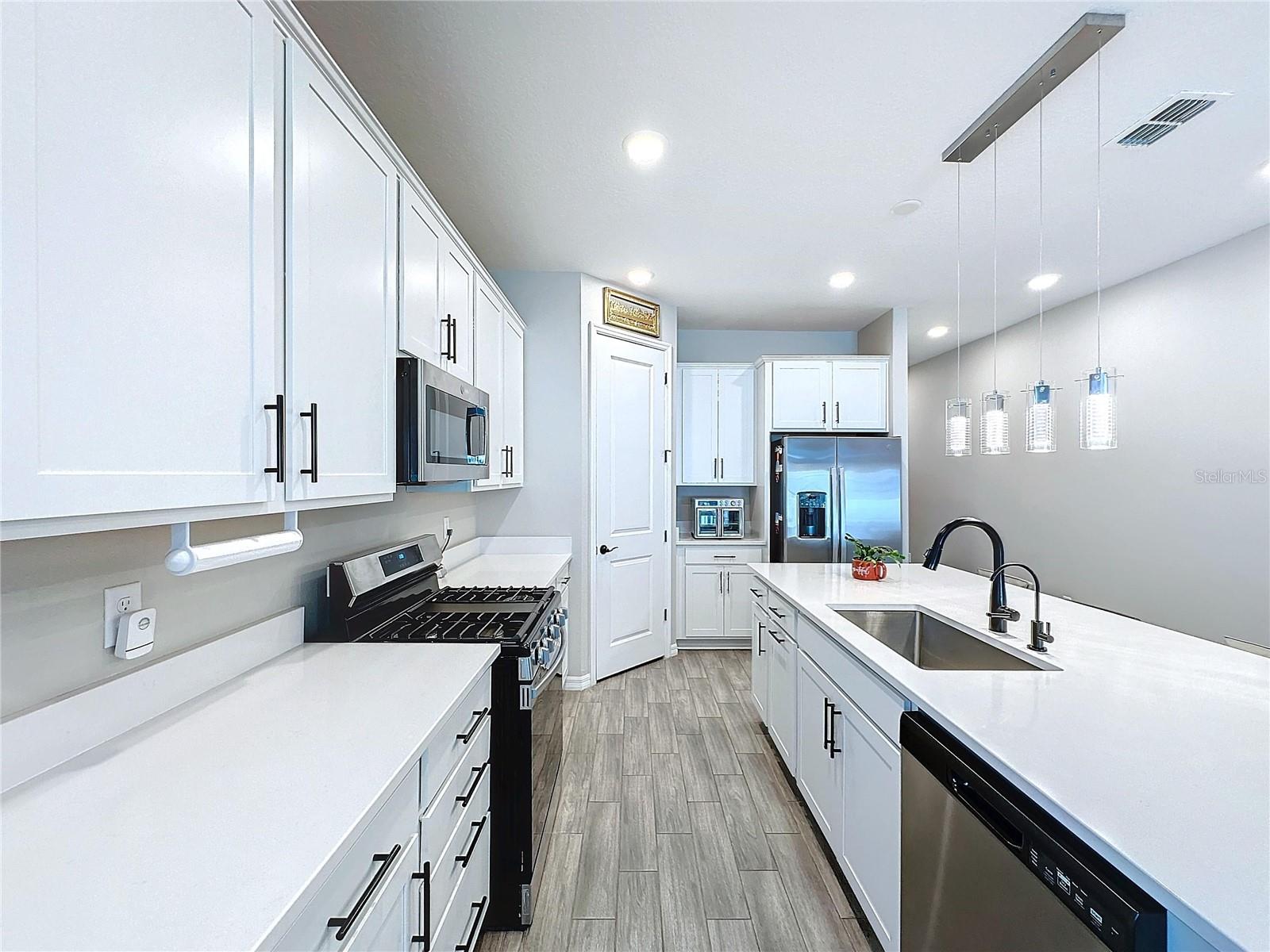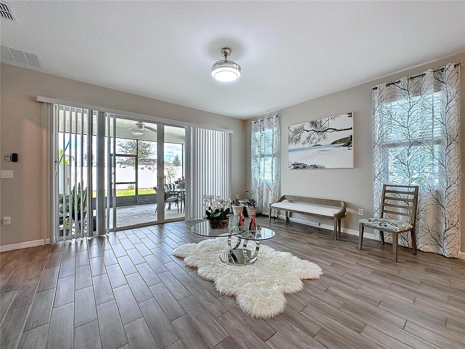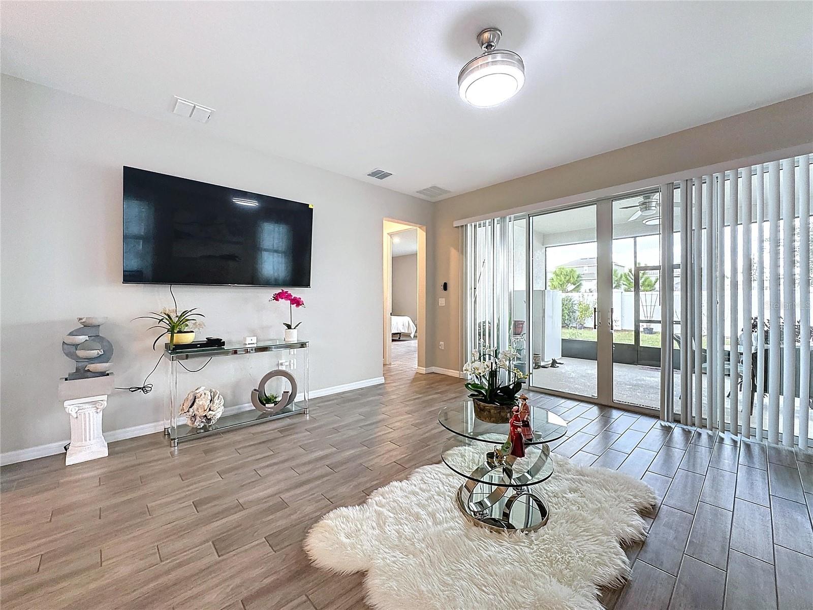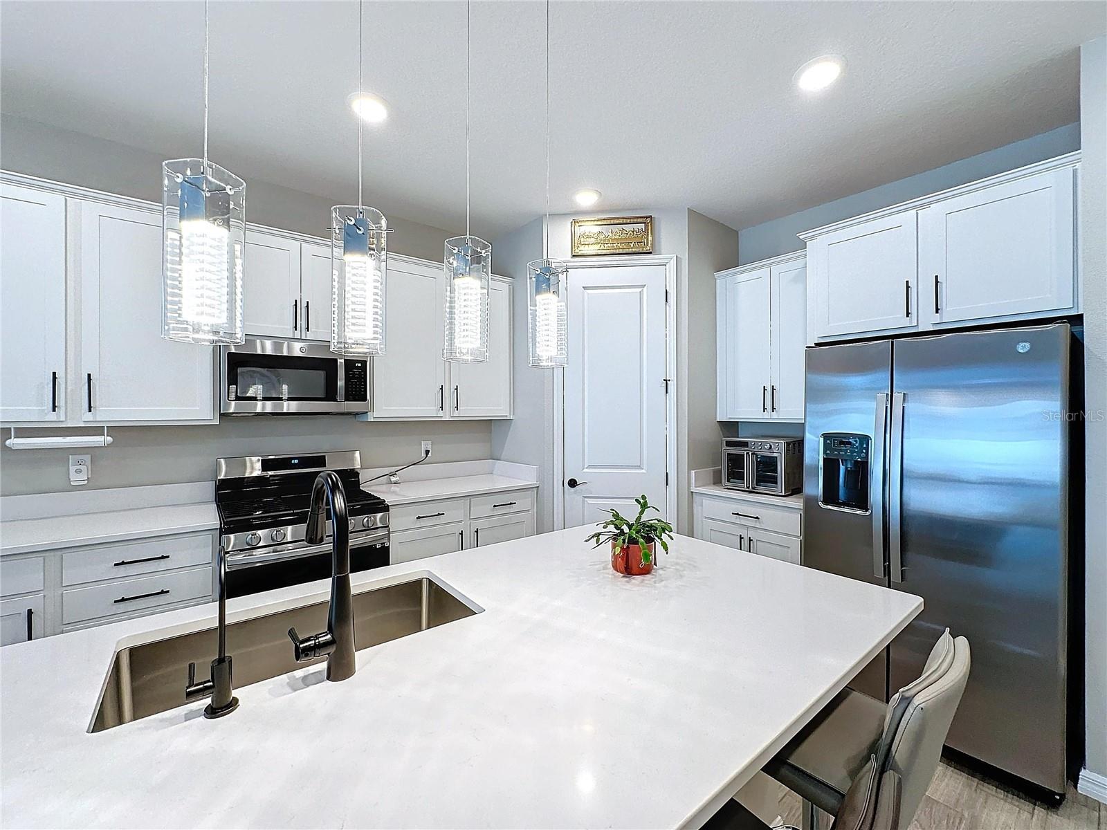 Welcome, you can't miss this great opportunity, This beautiful home has contemporary tile floors that flow seamlessly through the main hallway, dining room, kitchen, and great room. The luxury-style kitchen is a chef's dream, with sleek quartz countertops, 42" cabinets, and high-end GE stainless steel appliances. Imagine coming home from a long day and unwinding on a spacious screened-in lanai, offering privacy with no rear neighbors and a premium lot for added peace of mind. The spacious master suite offers a retreat-like experience, complete with an en-suite bathroom with a gorgeous tiled shower stall and double vanity. This home is packed with elegant upgrades, from the sleek stone facade and custom closet organizer in the master bedroom to the gas stove and upgraded central air conditioning with UV light. Additional details that make this property extraordinary include gutters a covered porch for outdoor enjoyment, and a ladder in the garage for extra storage so you don't have to pay for storage anymore. There are ceiling fans in the living room and lanai for added comfort. Beautiful lighting under the kitchen counters, blinds on every window for privacy, and a water filtration system with UV technology for the entire home. The landscaped backyard is a tropical paradise, with fruit trees such as soursop, avocado, acerola, grapefruit, fig, prunes, mango, papaya, and pennyroyal. Don't miss this incredible opportunity to own a home with luxurious finishes and practical amenities.