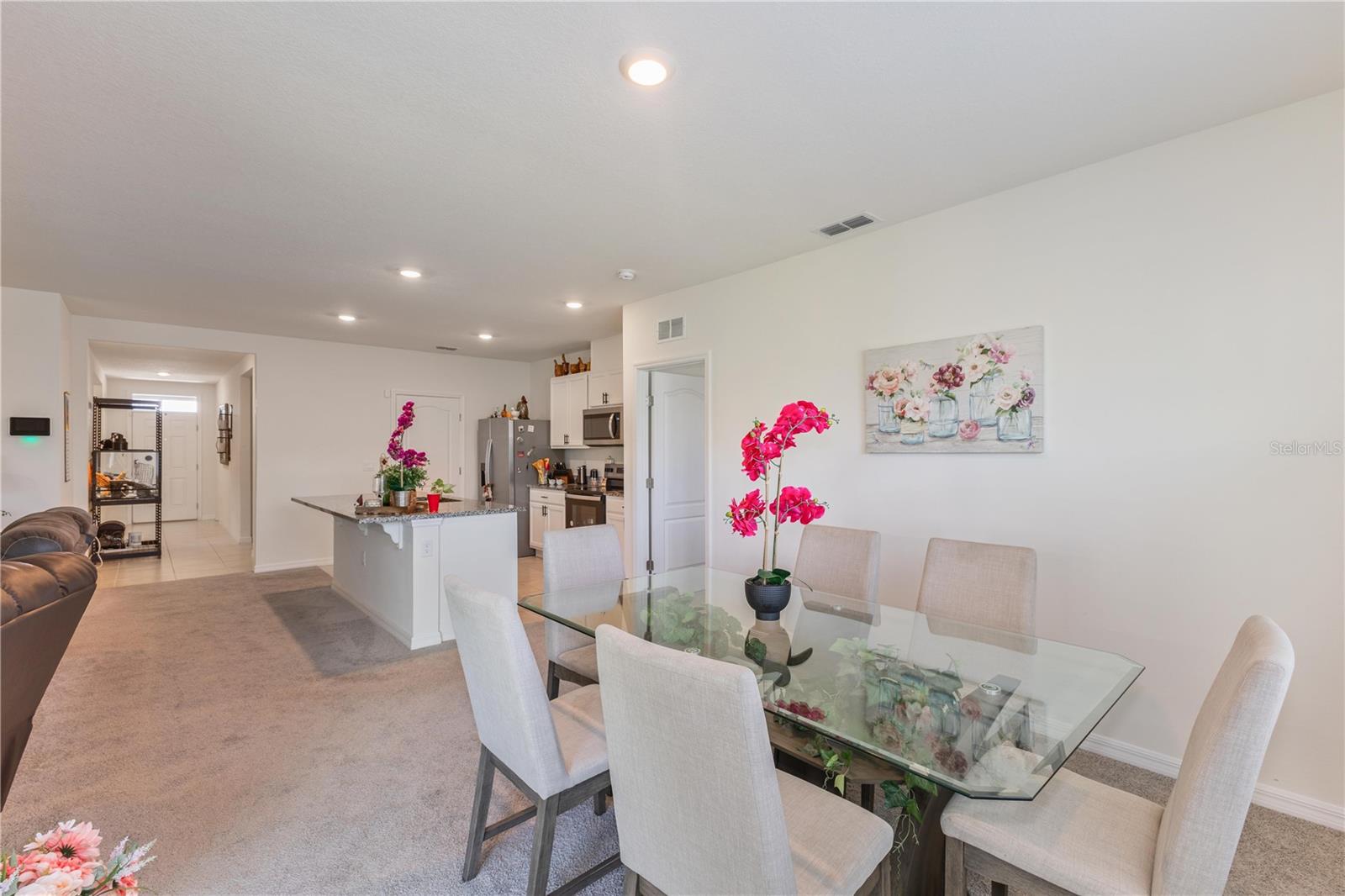 Why wait to build when you can own this just 1-year-new home today! This one-story residence offers a bright and open floor plan designed for modern living. The spacious kitchen is a chefs dream featuring stainless steel appliances, a large island perfect for meal prep or casual dining, and a walk-in pantry for all your storage needs. The open-concept layout seamlessly connects the kitchen to the living and dining areas, making it ideal for entertaining family and friends. Step outside to your covered lanai perfect for relaxing or hosting gatherings. This energy-efficient home also includes solar panels and a whole-house water filtration system, adding long-term value and savings. Don't miss this incredible opportunity to own a move-in ready home that combines comfort, style, and sustainability!