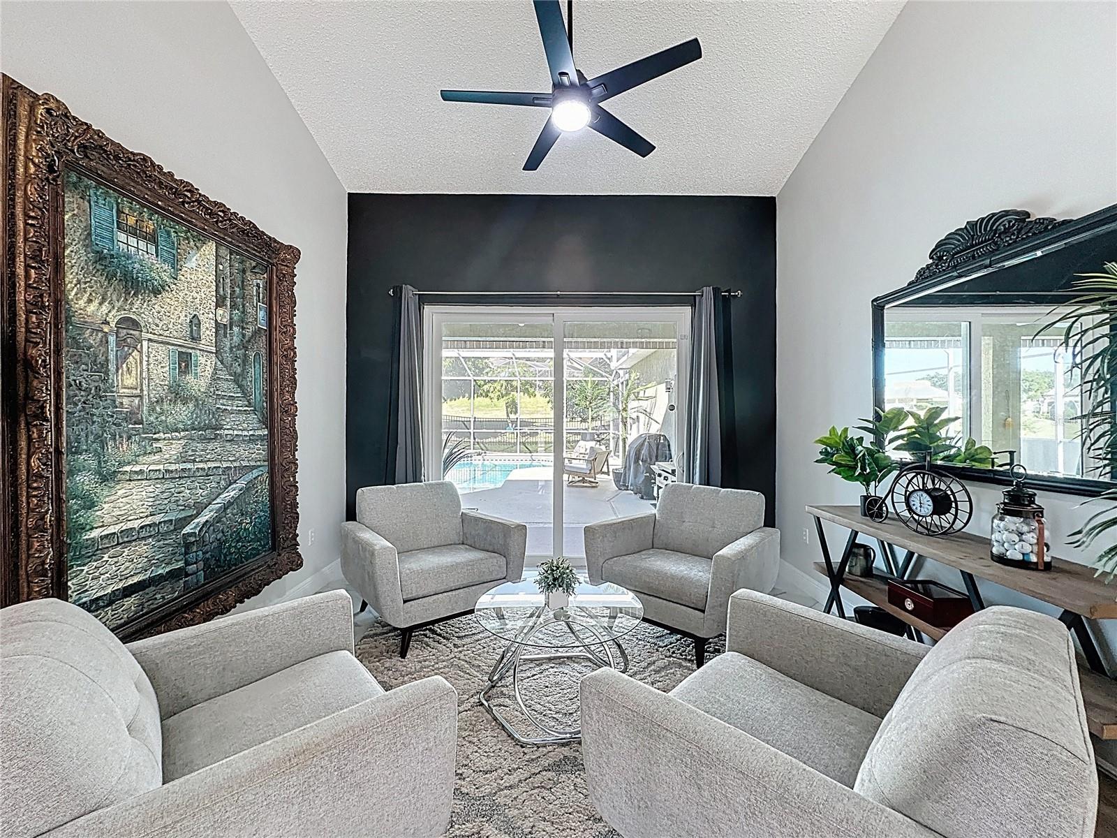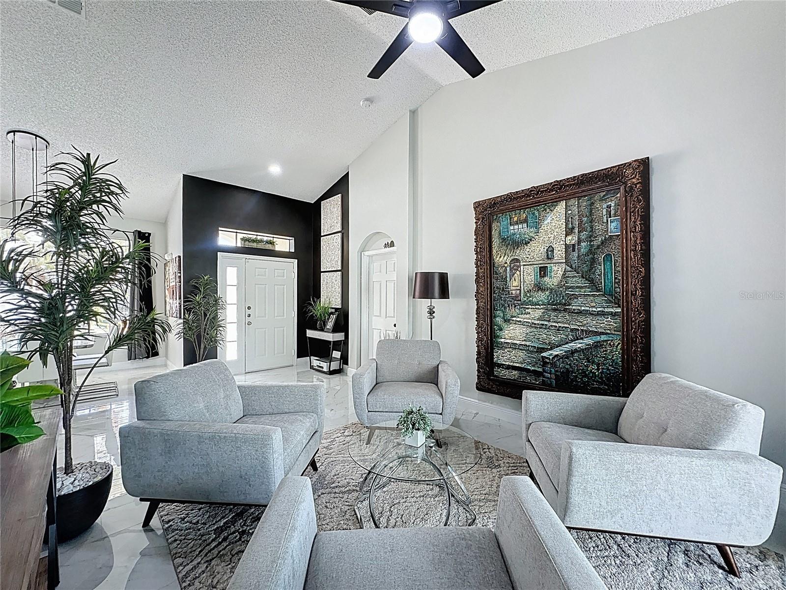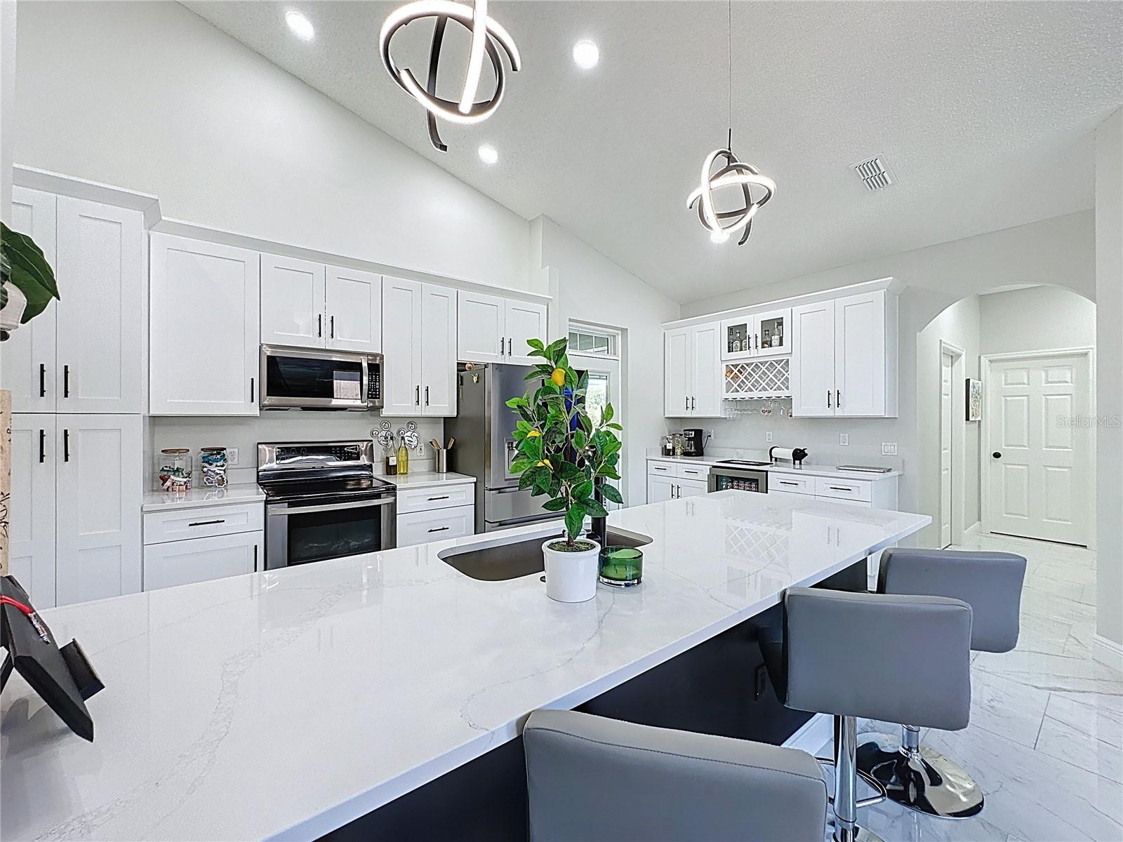 Affordable luxury meets rare, high-end upgrades in Southern Dunes. This custom-built home offers over 2,000 square feet of refined Florida living with finishes that truly stand out for the neighborhood, including quartz countertops, gorgeous marble tile floors, and sleek, contemporary bathrooms. Offered for sale furnished for complete convenience & designed for versatility, it’s equally well-suited as a full-time residence, a winter retreat, or a short-term rental, thanks to its smart, private split floor plan and beautiful indoor-outdoor flow. The spacious primary suite is tucked away on its own side of the home and features a stunning ensuite, along with a custom closet, while the guest bedrooms and additional baths(with pool access)are positioned separately to maximize comfort and privacy for family and visitors. From the airy, elegant foyer, the home opens to formal living and dining spaces framed by tranquil views of the pool and lanai. At the heart of the home is a large, open, contemporary kitchen that connects seamlessly to the informal great room, complete with high-end appliances and a coffee/wine bar with direct access to the outdoor living area, making entertaining effortless. Outside, the covered lanai features a charming hand-painted ceiling, custom electric shades/awnings for added comfort, and a large private pool with an in-ground spa, all overlooking peaceful green space. 2018 ROOF, 2020 PROPANE TANK FOR POOL HEAT. There is the added benefit of a fully fenced back yard(completed in 2025), perfect for pets and young families. A two-car garage and WHOLE HOUSE GENERATOR add the kind of everyday convenience and peace of mind that’s hard to find. This is a rare opportunity to own one of Southern Dunes’ premier upgraded homes, where every detail has been thoughtfully curated for lifestyle, comfort, and long-term value.