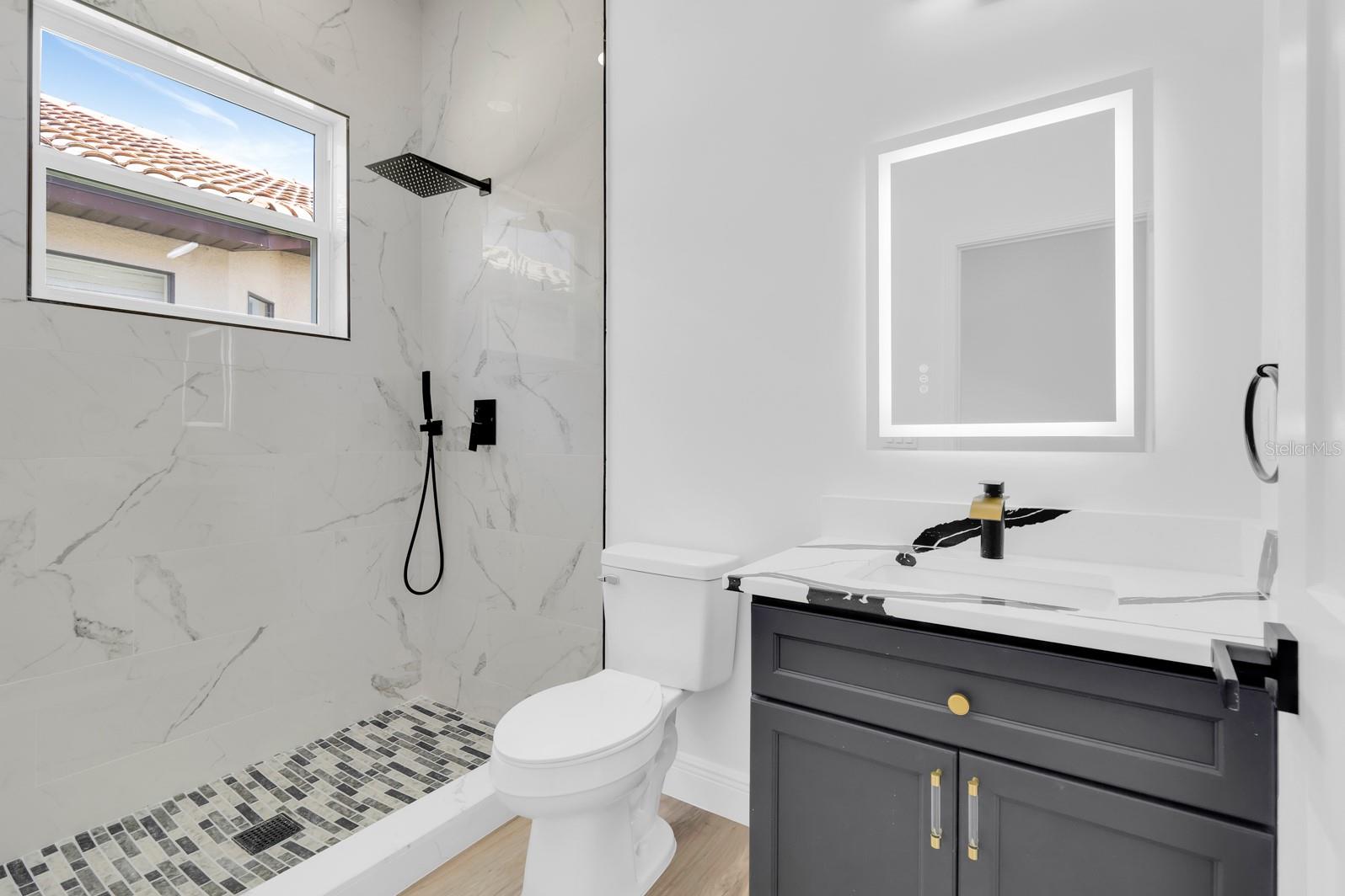 Stunning New Custom Built Home! This 4-bedroom, 3.5-bathroom pool home is located on a corner lot in the beautiful community of Villa Sorrento. Designed with modern luxury and energy efficiency in mind, this home boasts 5” spray foam insulation on the attic ceiling of the entire house and garage, an energy-efficient Carrier HVAC system, digital hot water heater with WiFi and double-pane windows and sliding glass doors. This builder has spared no expense when it comes to the custom details in this home. Inside, you will find upgraded 22 millimeter wear layer, waterproof luxury vinyl plank flooring, complemented by 5 1/4" baseboards. Calacatta two tone granite countertops and full backsplash along with navy blue cabinets and gold handles were used in the kitchen and bathrooms. The walls and ceilings feature a level 5 smooth finish with upgraded paint package throughout, adding to the home’s sleek, high-end aesthetic. The open floorplan this home offers make it perfect for entertaining. This home features high ceilings and a spacious indoor laundry room. All bathroom feature backlit mirrors. The en suite master bathroom boasts a freestanding soaking tub, walk-in shower and dual vanities. The sliding glass doors in the living room lead to the covered porch and screened pool area. The 33'x12' pool features travertine coping, a Caribbean Blue finish and LED lights with a designer brown 3 paver decorative patio. There is a private half bath with access from the pool area for added convenience. The insulated and drywalled garage includes a Rust-Oleum Epoxy Shield-coated floor and a LiftMaster garage door opener with MyQ technology and built-in camera. Outside, a six-station irrigation system ensures effortless lawn maintenance, while the Mediterranean tile roof enhances the home’s curb appeal. Close to schools, shopping, restaurants and major highways. Experience the perfect blend of elegance, comfort, and energy efficiency in this brand-new custom home. Schedule your private showing today!