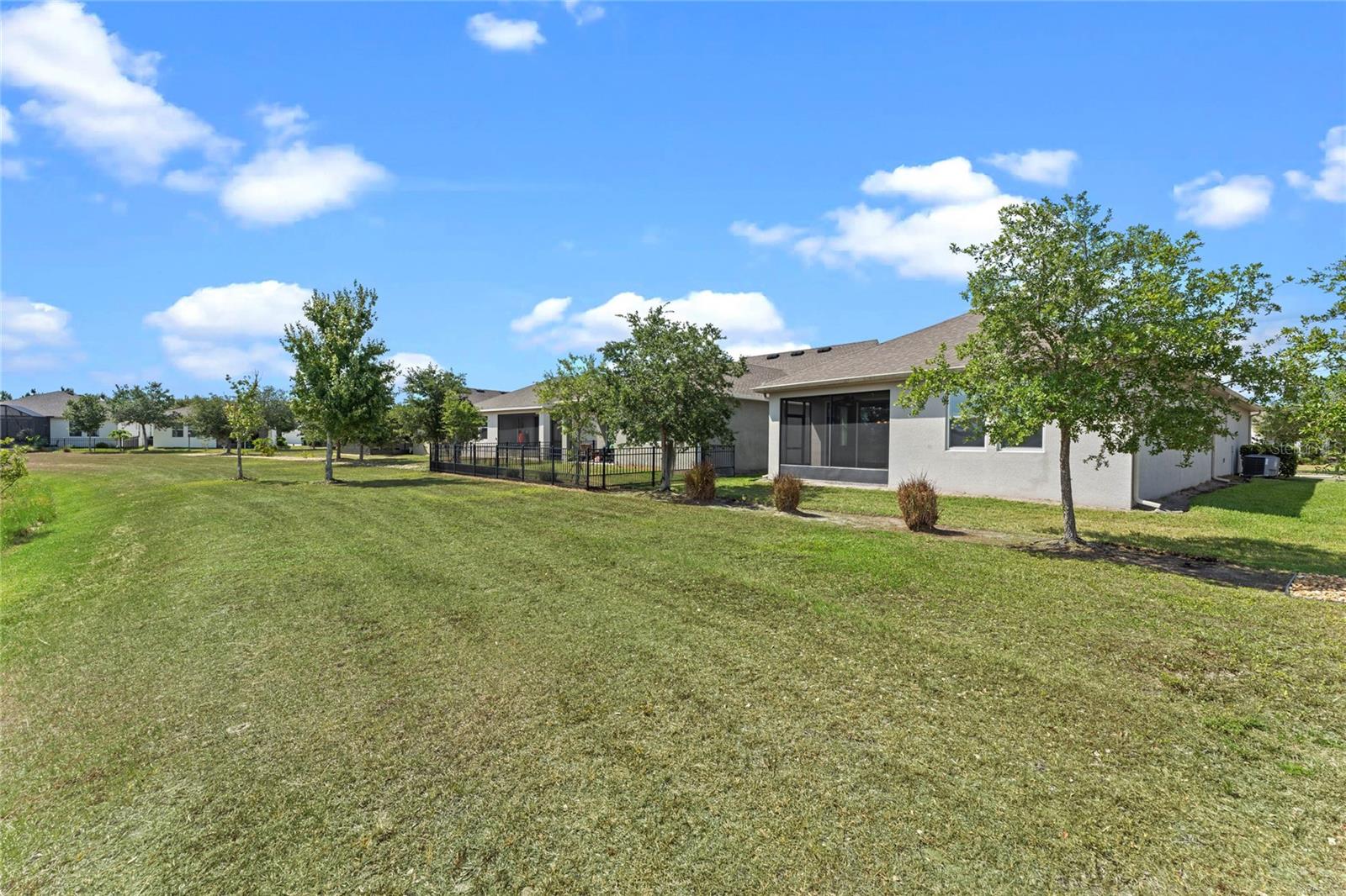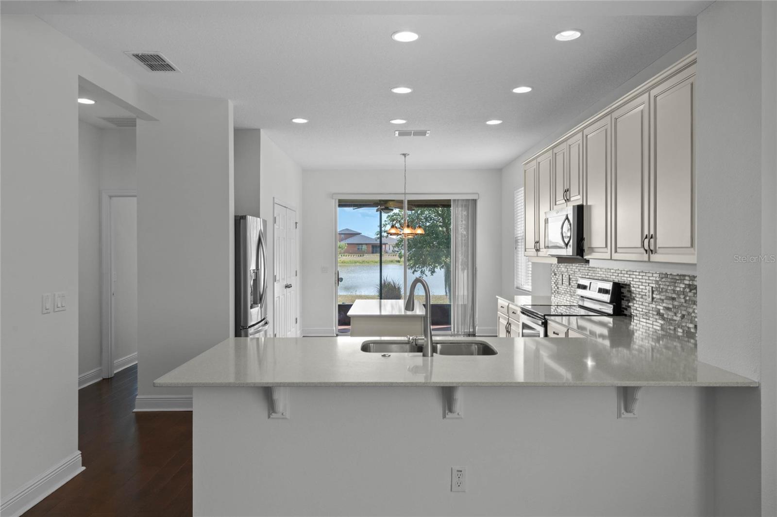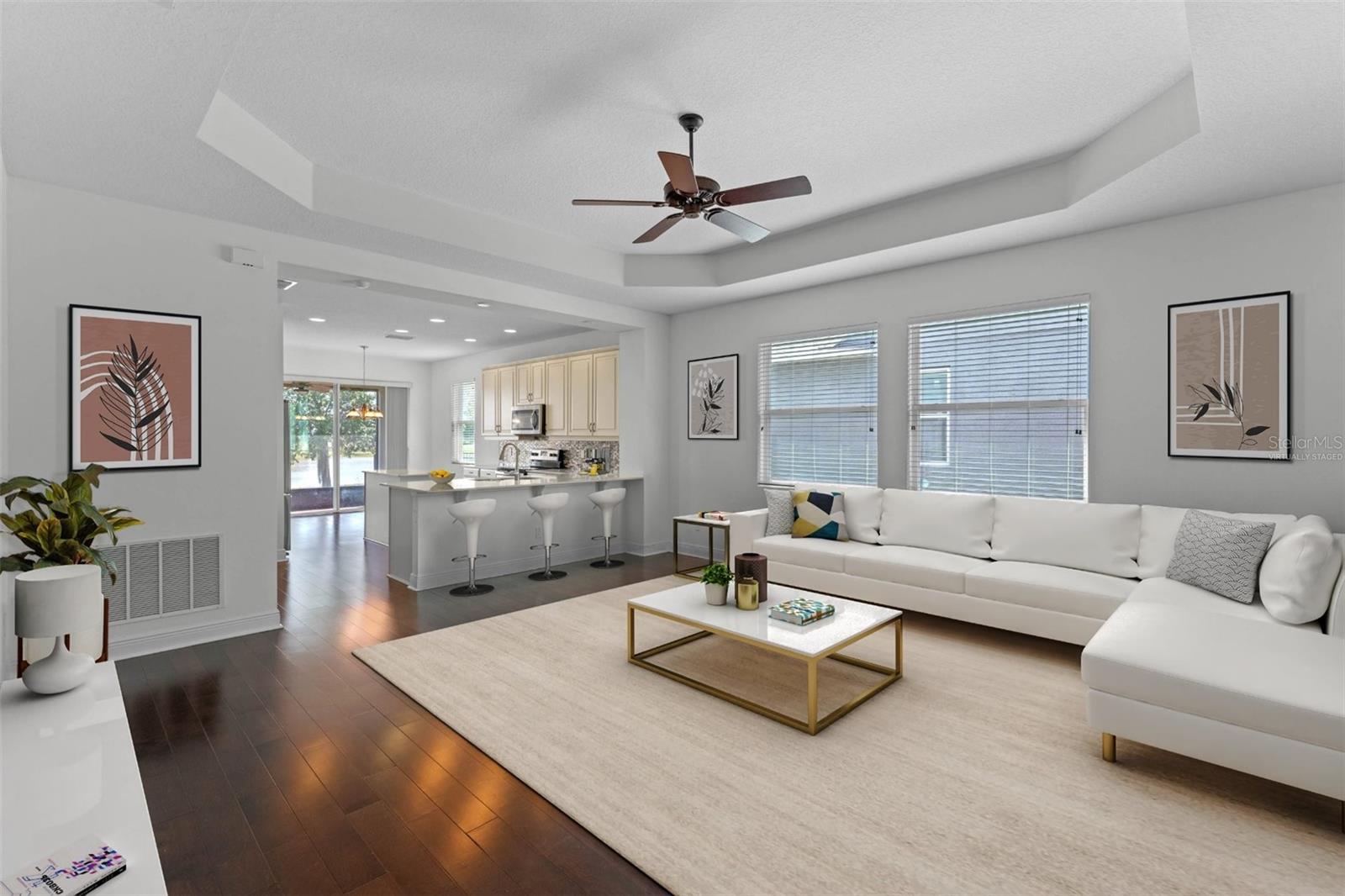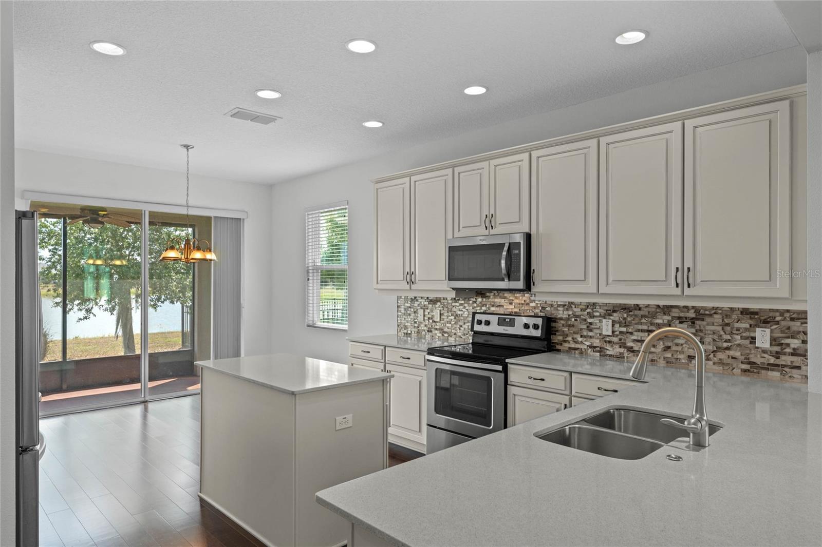 One or more photo(s) has been virtually staged. FULL 3 BEDROOM MODERN HOME with TRANQUIL LAKE VIEWS in a GATED 55+ COMMUNITY! TOUR THE HOUSE WITH THE VIRTUAL TOUR and VIDEO WALK THROUGH LINKS. As you enter your new home you’ll find elegant HARDWOOD FLOORING throughout. The OPEN CONCEPT living room and kitchen will become the heart of your home. Enjoy preparing meals among ample Silestone QUARTZ countertops, stainless steel appliances, beautiful 42”wood cabinetry with crown molding, dashing tile backsplash, and a LARGE CLOSET PANTRY. Serve meals and snacks at the breakfast bar, dinette area, or even out on your SCREENED PATIO, which will become your favorite spot for your morning coffee as you take in the calming water views and listen to chirping birds. The PRIMARY SUITE is a retreat at the rear of the house, with a bedroom spacious enough for your KING SIZE bedroom set, a WALK-IN CLOSET, DUAL SINK VANITY, separate water closet, and an elegant OVERSIZED STEP-IN TILE SHOWER with MULTIPLE SHOWERHEADS. Two other spacious secondary bedrooms and a full bath are found on the opposite side of the house, and can be closed off with a hidden pocket door, giving visiting guests some additional privacy. Other features found throughout the home include tray ceilings, ceiling fans, separate laundry room, and radiant barrier roof, to name a few. Prepare to spend your days meeting up with friendly neighbors at the clubhouse that houses a fitness center and activity room always busy with various events like mahjong, Zumba, yoga, book club, game night, canasta, and other seasonal activities throughout the year. Neighborhood amenities also include a ZERO-ENTRY RESORT STYLE POOL, outdoor sitting/entertainment area, PICKLEBALL/TENNIS courts, miles of walking trails, and more. Or maybe you’ll go out for a round of golf on the 18-hole Johnny Miller golf course, boating on Buck Lake, or shopping with a bite to eat at the Harmony marketplace. If you’re looking for a 2nd home or are making a long-distance move, this is the one for you! (House includes washer and dryer. Plus the house is located in a USDA Loan Eligibility Zone, where you might qualify to purchase for 0% down.) The HOA makes living easy here and takes care of lawn maintenance so you have more time to…….visit local beaches, theme parks, Lake Nona Medical City, or the Orlando International Airport, all within reach…..or relax and enjoy the sweet life. After all, you earned it!
