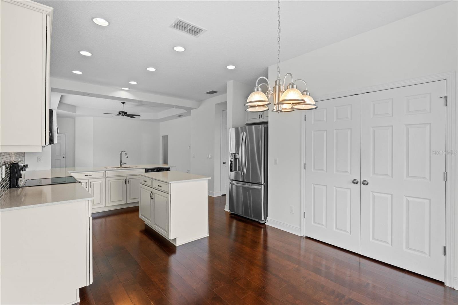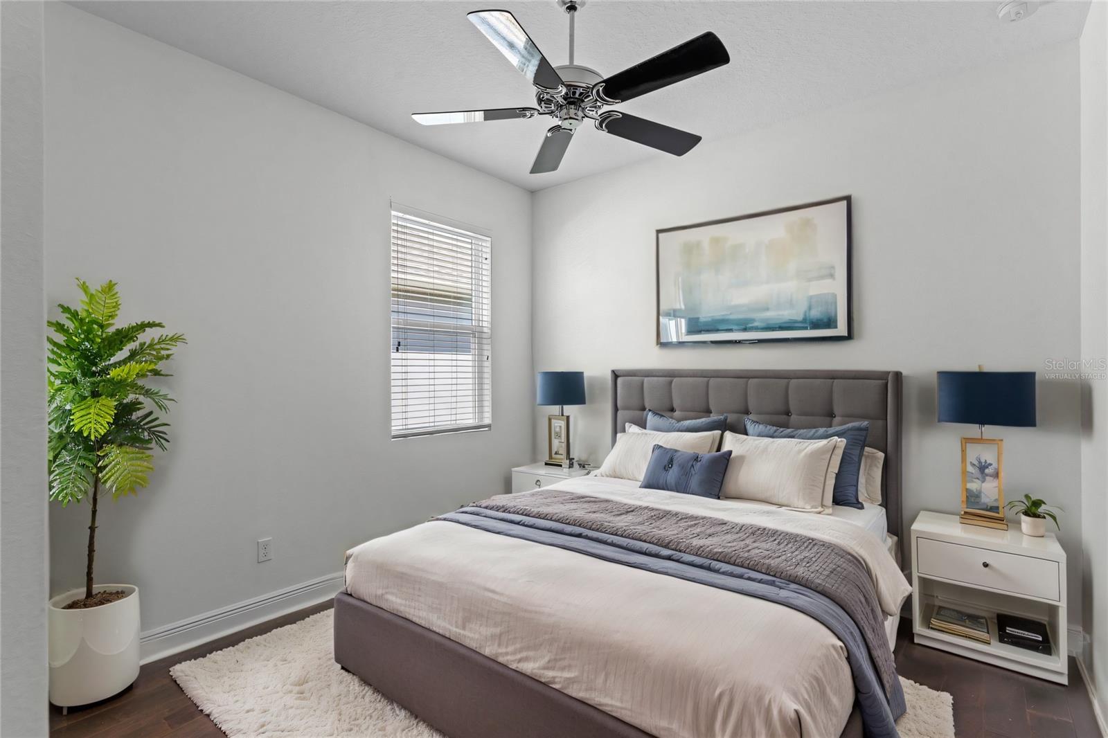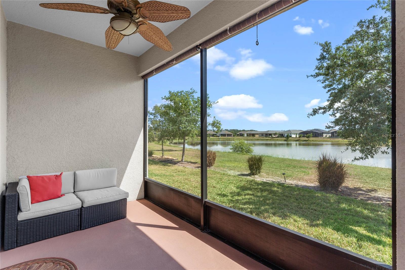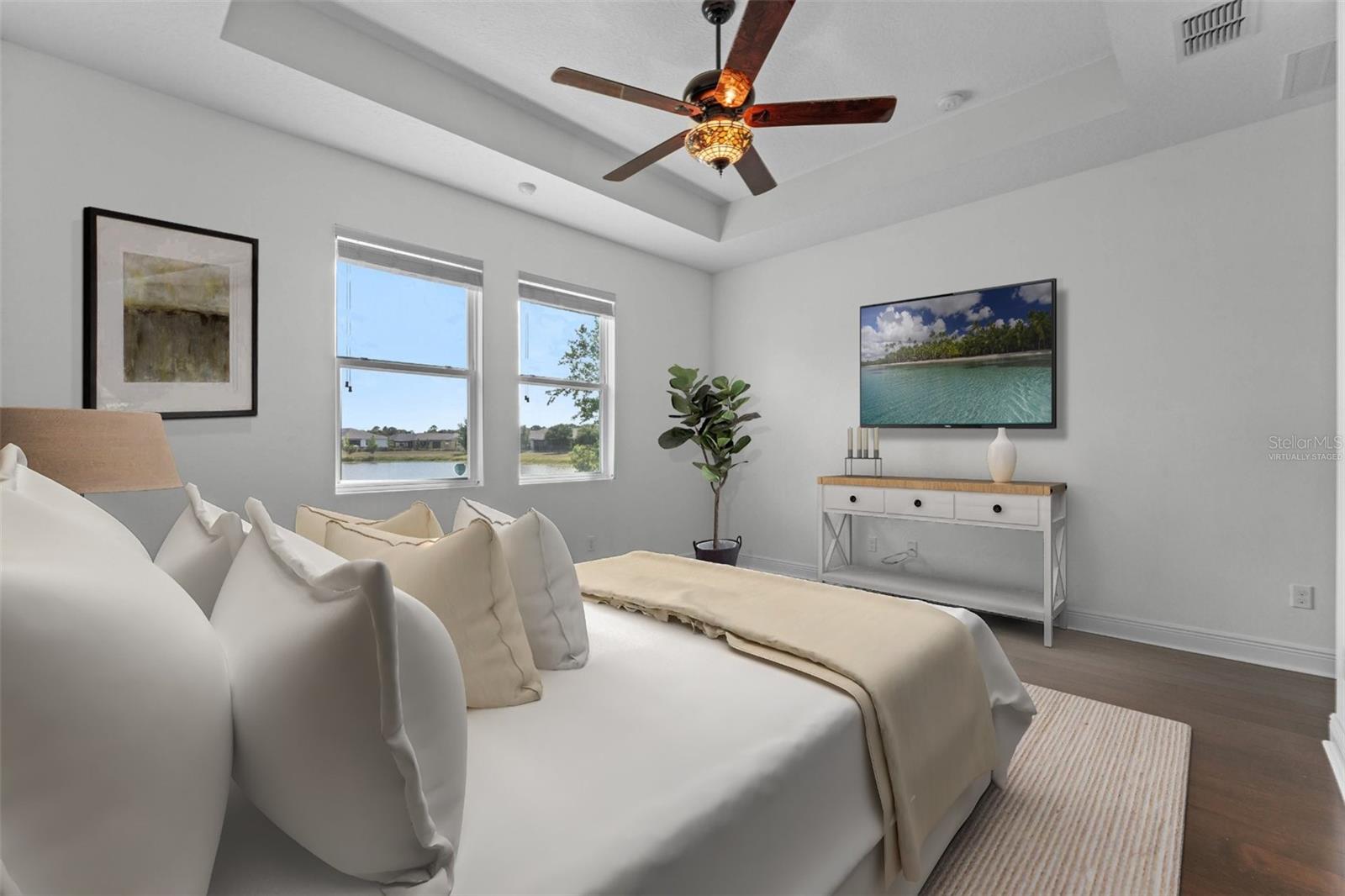 One or more photo(s) has been virtually staged. FULL 3 BEDROOM MODERN HOME with TRANQUIL LAKE VIEWS in a GATED 55+ COMMUNITY! TOUR THE HOUSE WITH THE VIRTUAL TOUR and VIDEO WALK THROUGH LINKS. As you enter your new home you’ll find elegant HARDWOOD FLOORING throughout. The OPEN CONCEPT living room and kitchen will become the heart of your home. Enjoy preparing meals among ample Silestone QUARTZ countertops, stainless steel appliances, beautiful 42”wood cabinetry with crown molding, dashing tile backsplash, and a LARGE CLOSET PANTRY. Serve meals and snacks at the breakfast bar, dinette area, or even out on your SCREENED PATIO, which will become your favorite spot for your morning coffee as you take in the calming water views and listen to chirping birds. The PRIMARY SUITE is a retreat at the rear of the house, with a bedroom spacious enough for your KING SIZE bedroom set, a WALK-IN CLOSET, DUAL SINK VANITY, separate water closet, and an elegant OVERSIZED STEP-IN TILE SHOWER with MULTIPLE SHOWERHEADS. Two other spacious secondary bedrooms and a full bath are found on the opposite side of the house, and can be closed off with a hidden pocket door, giving visiting guests some additional privacy. Other features found throughout the home include tray ceilings, ceiling fans, separate laundry room, and radiant barrier roof, to name a few. Prepare to spend your days meeting up with friendly neighbors at the clubhouse that houses a fitness center and activity room always busy with various events like mahjong, Zumba, yoga, book club, game night, canasta, and other seasonal activities throughout the year. Neighborhood amenities also include a ZERO-ENTRY RESORT STYLE POOL, outdoor sitting/entertainment area, PICKLEBALL/TENNIS courts, miles of walking trails, and more. Or maybe you’ll go out for a round of golf on the 18-hole Johnny Miller golf course, boating on Buck Lake, or shopping with a bite to eat at the Harmony marketplace. If you’re looking for a 2nd home or are making a long-distance move, this is the one for you! (House includes washer and dryer. Plus the house is located in a USDA Loan Eligibility Zone, where you might qualify to purchase for 0% down.) The HOA makes living easy here and takes care of lawn maintenance so you have more time to…….visit local beaches, theme parks, Lake Nona Medical City, or the Orlando International Airport, all within reach…..or relax and enjoy the sweet life. After all, you earned it!