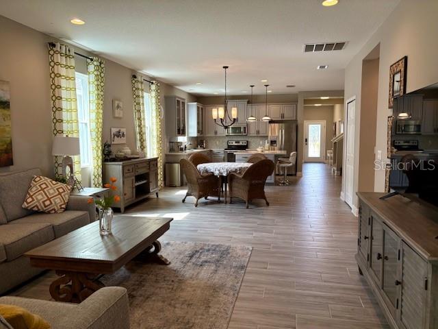 ATTENTION 55+ active adults looking for the perfect home and community to retire at! Look no more! Come see this beautiful former model home, built by Cal-Atlantic, located in the fun-loving Harmony South Lakes neighborhood. Enjoy the open floor plan with glass sliders leading out to the roomy screened in lanai with tranquil views of the pond and golf course beyond. The kitchen, centrally located, with its granite countertops, stainless steel appliances and a prepping island is open to the family room providing a comfortable hosting experience when entertaining. This model home boasts a huge bonus room at the top of the stairway showcasing brick veneer walls and granite countertops, perfect for a home office, craft room or fourth bedroom, plus there is a full bathroom up there too. The second bonus room is located between two guest rooms, giving your guests their own private parlor if they are needing a little quiet time of their own. Living at the Lakes of Harmony gives you the opportunity to get out and have some fun at the private clubhouse with its gorgeous pool, gym, courts and recreation/gathering areas where you're sure to meet some friends to go play a round of golf on the Harmony championship golf course or to take part in one of the many Harmony Lakes active adult activities each month. Harmony is in a fantastic location! Just approximately a 30-minute drive east to I-95 at Melbourne or drive 15 more minutes and arrive at the Melbourne Beaches where you can enjoy the sand and surf! When driving West from Harmony you are approximately 20 minutes to the FL. Turnpike and Kissimmee. Drive north for 30 minutes and you will find the renowned Lake Nona and the Medical City. Orlando International Airport is approximately 40-45 minutes northwest of Harmony as well. This is a beautiful hidden Jem of a neighborhood! Make your viewing appointment today!