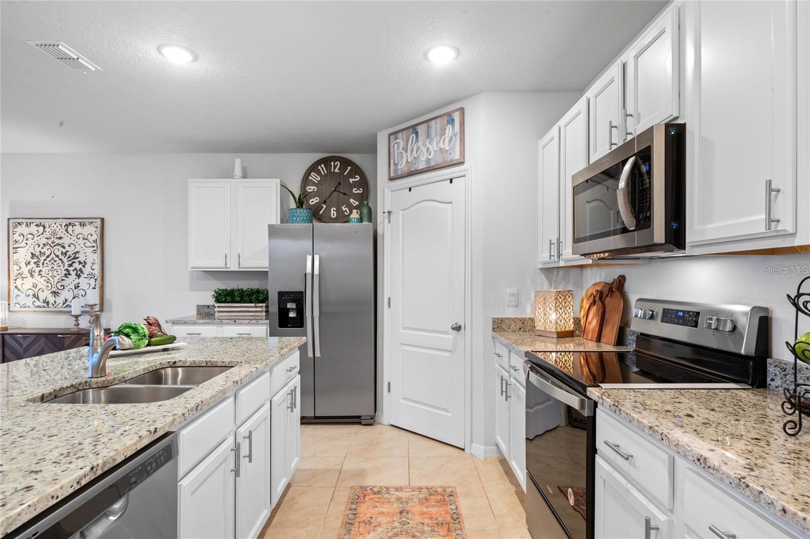 $3000.00 seller credit.....Seller is motivated.......This one story four bedroom, two bath home with SOLAR PANELS for a low electric bill and a WATER VIEW! As you walk into the entryway of this gorgeous 2021 home you will see two bedrooms sharing a bathroom to your right. As you continue to journey through the entryway you will see an additional bedroom with the closet to your left and another door that leads into your laundry room which includes an ENERGY EFFICIENT washer and dryer. Your entry hallway leads you to your open kitchen and family room that features 42-inch WOOD CABINETS, STONE COUNTERTOPS, STAINLESS STEEL APPLIANCES and a walk-in pantry. From the kitchen you will love the openness of the family and dining room. Off of the dining room is your COVERED SCREENED LANAI that overlooks your backyard which features many fruit trees including avocado, passion fruit, mango, papaya, and plantain! The backyard includes an IRON FENCE, EXTENDED PAVERS with a FIREPIT that doubles as a grill for all your outdoor entertainment needs! This all overlooks a gorgeous water view! Off the family room is your spacious primary suite which includes a large bathroom with DUAL SINKS, GRANTIRE COUNTERTOPS, walk-in shower, separate water closet, large linen closet, with a separate LARGE WALK_IN CLOSET. Residents of Harmony West enjoy access to incredible community amenities, including: 5,000 sq. ft. Resort-Style Pool with Sun Shelf, Splash Pad, Clubhouse with Covered Patio & Picnic Area, Fitness Center, and a Community Room with a Chef’s Kitchen. This home is conveniently located near walking trails, parks, and everyday conveniences such as ORLANDO AIRPORT, MEDICAL CENTER, and TOLL ROADS.