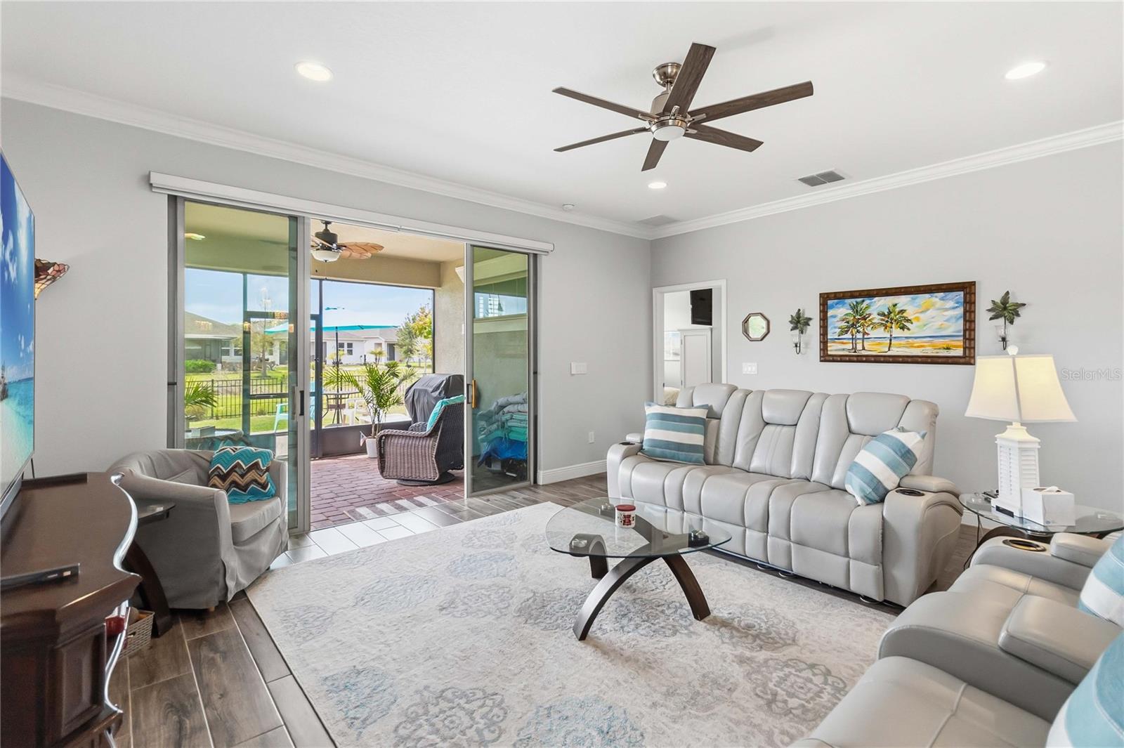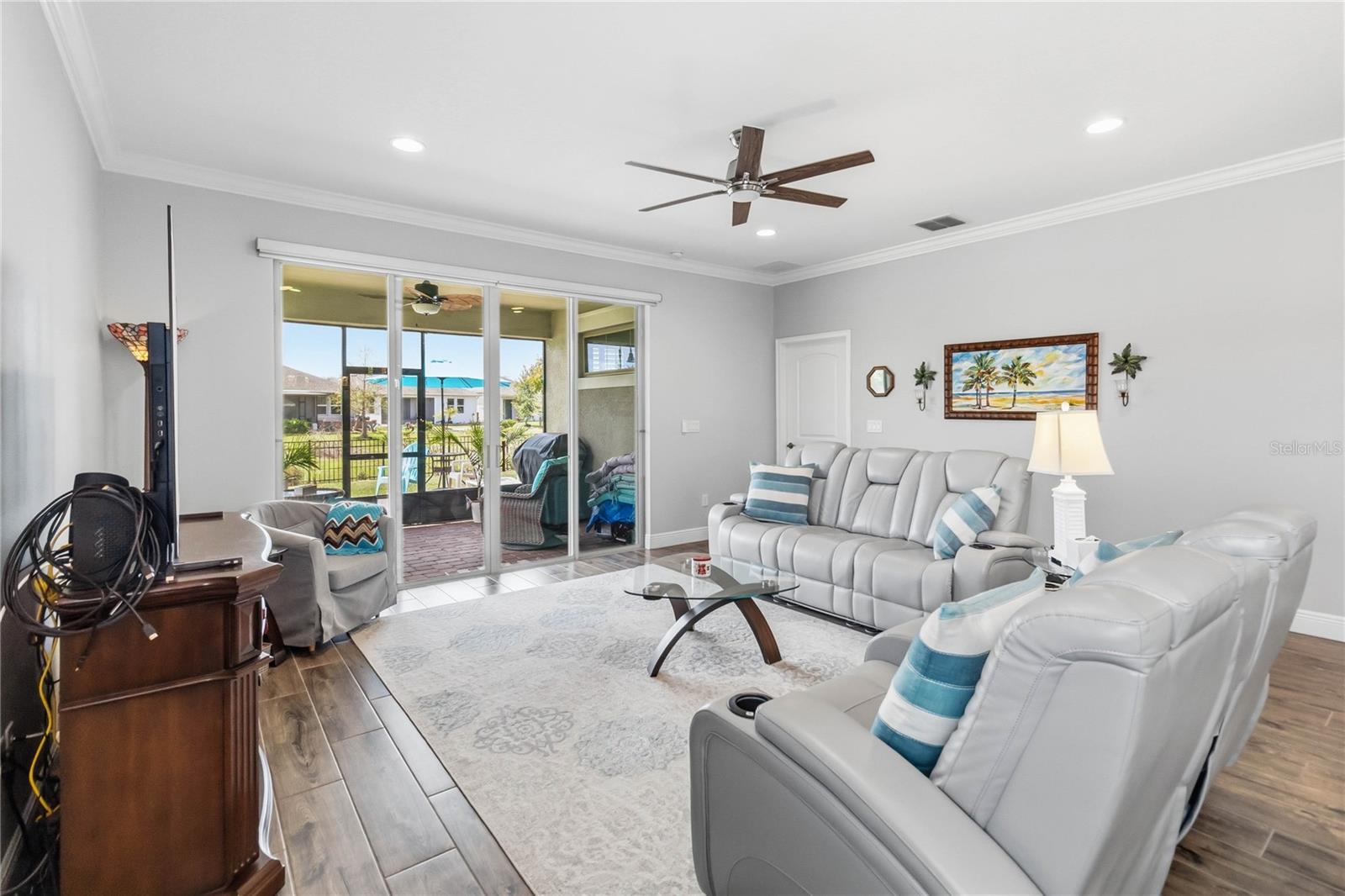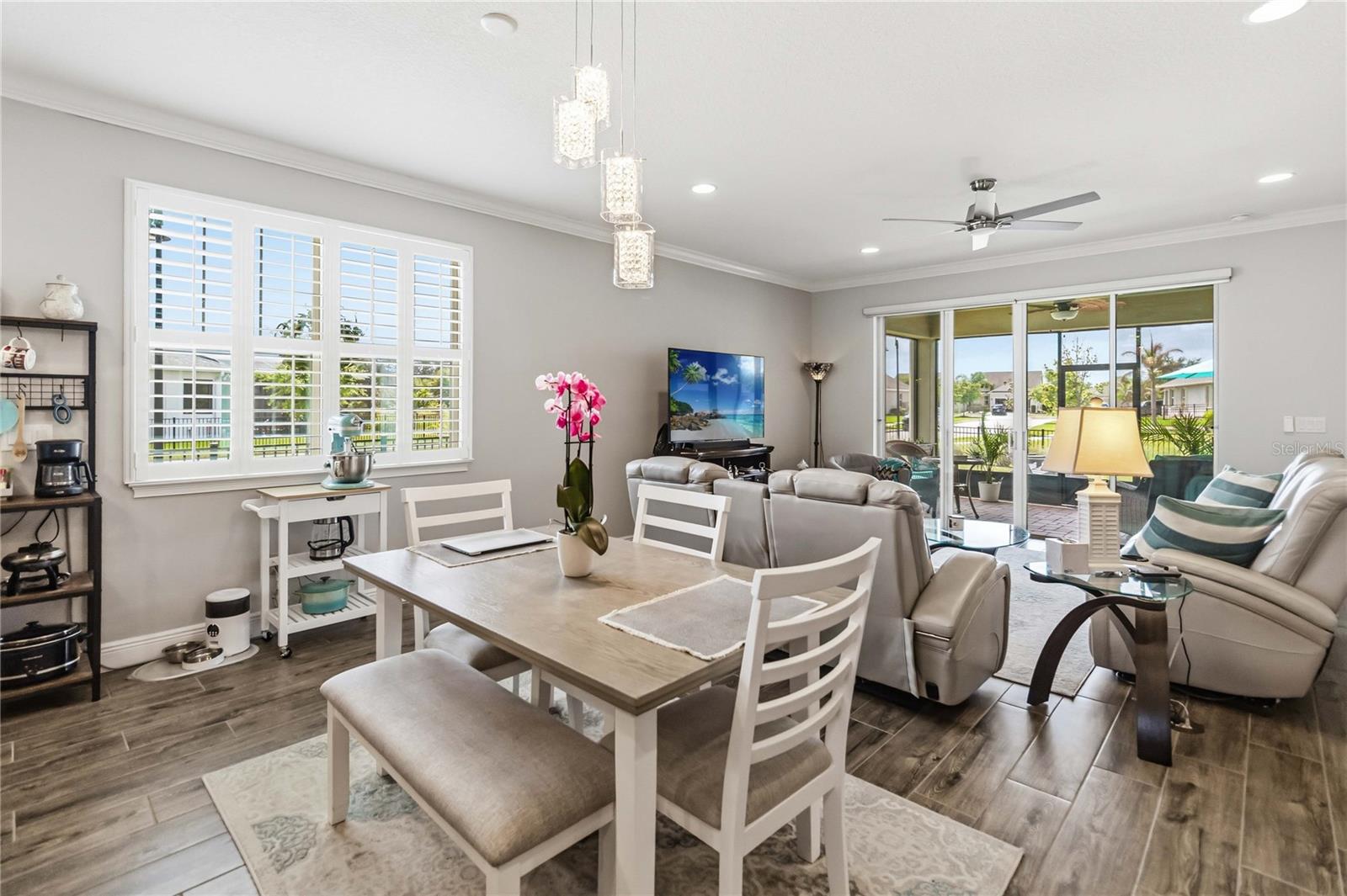One or more photo(s) has been virtually staged. This almost-new 2022 home is the ONLY OVER-SIZED CORNER LOT for sale in East Lake. This stunning home has 3 Bedrooms, 3 Baths and a Den. The GOURMET KITCHEN is fit for any chef, with beautiful QUARTZ countertops, a LARGE ISLAND, and SS Appliances. Featuring light and bright accents, this home exudes a coastal vibe with white shaker cabinets and a pop of color in the kitchen backsplash. Enjoy open concept living with CERAMIC TILE FLOORING throughout the common areas and Primary Bedroom. Elegant crown molding and custom PLANTATION SHUTTERS in all rooms. Enjoy a peaceful morning drink in the SCREENED LANAI and beautiful sunsets while barbecuing on the open PATIO in the evenings. Wildlife is frequently present to enjoy while overlooking the pond from the rear. The large fenced yard is ready for your fur babies to enjoy, including a puppy door in the lanai. This vibrant 55 plus active community offers activities for all levels of fitness. The streets are tree-lined with plenty of sidewalks and bike paths for enjoying the scenic Johnny Miller-designed golf course. Amenities include golfing, two heated swimming pools, two fitness centers, pickleball, tennis, game nights at the club house, and some day trips. The community also has a private lake offering pontoon boats, fishing boats, and kayaks for reservation at no additional charge. Fishing off the pier is also a favorite. There are food establishments and other services just one mile away at the town square. Whether you are an avid golfer or a peaceful nature lover, this is the community for you! Conveniently located between Kissimmee and Melbourne, about 1 hour to local East Coast beaches, as well as Orlando attractions, and airport. Don't miss this opportunity to own this upgraded, move-in ready gem!