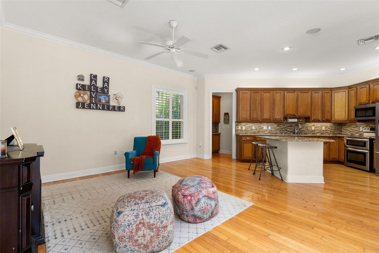 **SELLER MOTIVATED, PRICE DROP!! ROOF REPLACED IN 2024 WITH PAID OFF SOLAR PANELS!! $5000 IN CLOSING COST ASSISTANCE WITH A FULL PRICE OFFER!!** Step into this classic-designed, former model home, prominently featuring high ceilings, hardwood flooring, and an abundance of crown molding throughout. The airy, light-filled informal living room greets you at the entrance, providing the perfect spot to relax. The dining room, illuminated by a stunning chandelier, offers plenty of room for family feasts and dinner parties. The home opens into a spacious area that accommodates the kitchen and family room. The beautifully appointed kitchen boasts solid hardwood cabinetry, granite countertops, a stacked stone backsplash, and stainless steel appliances, adding to the impressive features of this home. Large windows and a set of French doors allow natural sunlight to flood the adjoining family room. The master bedroom suite features an elegant ensuite and a large walk-in closet. The modern ensuite bathroom, with high-quality finishes, fixtures, and fittings, includes separate vanities with raised bowl sinks, a garden bath, and a glass surround shower, inviting indulgence. A guest suite with its own full bath and walk-in shower, along with two additional bedrooms, can be found in this layout. Down the hall, you will find a pool bathroom with an oversized vanity and glass shower. Accessed via French doors off the kitchen and family room, the outdoor living space links to the pool and outdoor kitchen, creating a perfect area for family gatherings and play. Look no further - this delightful cottage-style home could be all yours! HVAC 2019