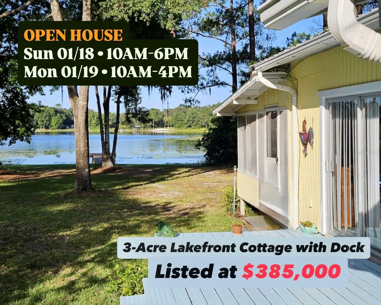 Crystal-clear waters of Lak-A-Wana Lake just a short drive from Gainesville/UF/Shands. This charming updated 2-bed, 1-bath cottage NOT IN A FLOOD ZONE offers breathtaking lake views, a peaceful shaded porch, and a spacious 3-acre lot. Metal roof, minisplit AC, septic, well, water filtration system, impact windows, flooring, wooden decks and cabinetry — all just 4 to 5 years old. Property includes a large chicken coop, two storage sheds, and even a golf cart for convenient rides around the grounds. Nature lovers will enjoy serene sunsets from the dock, abundant wildlife, and the fresh air of true lakeside living. Enjoy paved roads to your property & low Putnam County taxes. This property is perfect for gardening, raising chickens, goats, or simply going off the grid. Whether you're seeking a full-time residence or a weekend escape, this rare lakefront offering checks every box. Private lake access, separate meter for RV hookup, no HOA. REALTOR-FRIENDLY AND PRICED TO SELL!