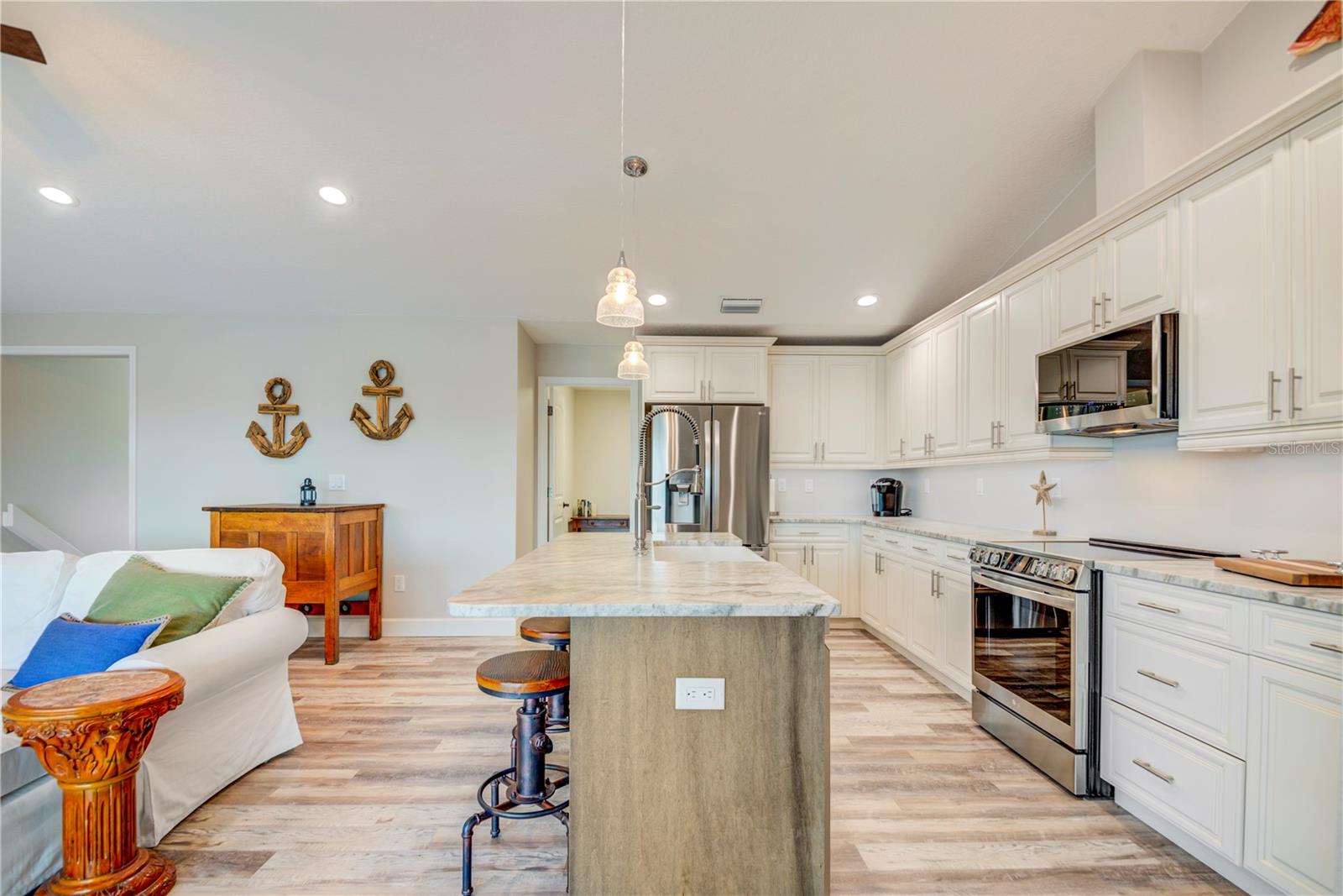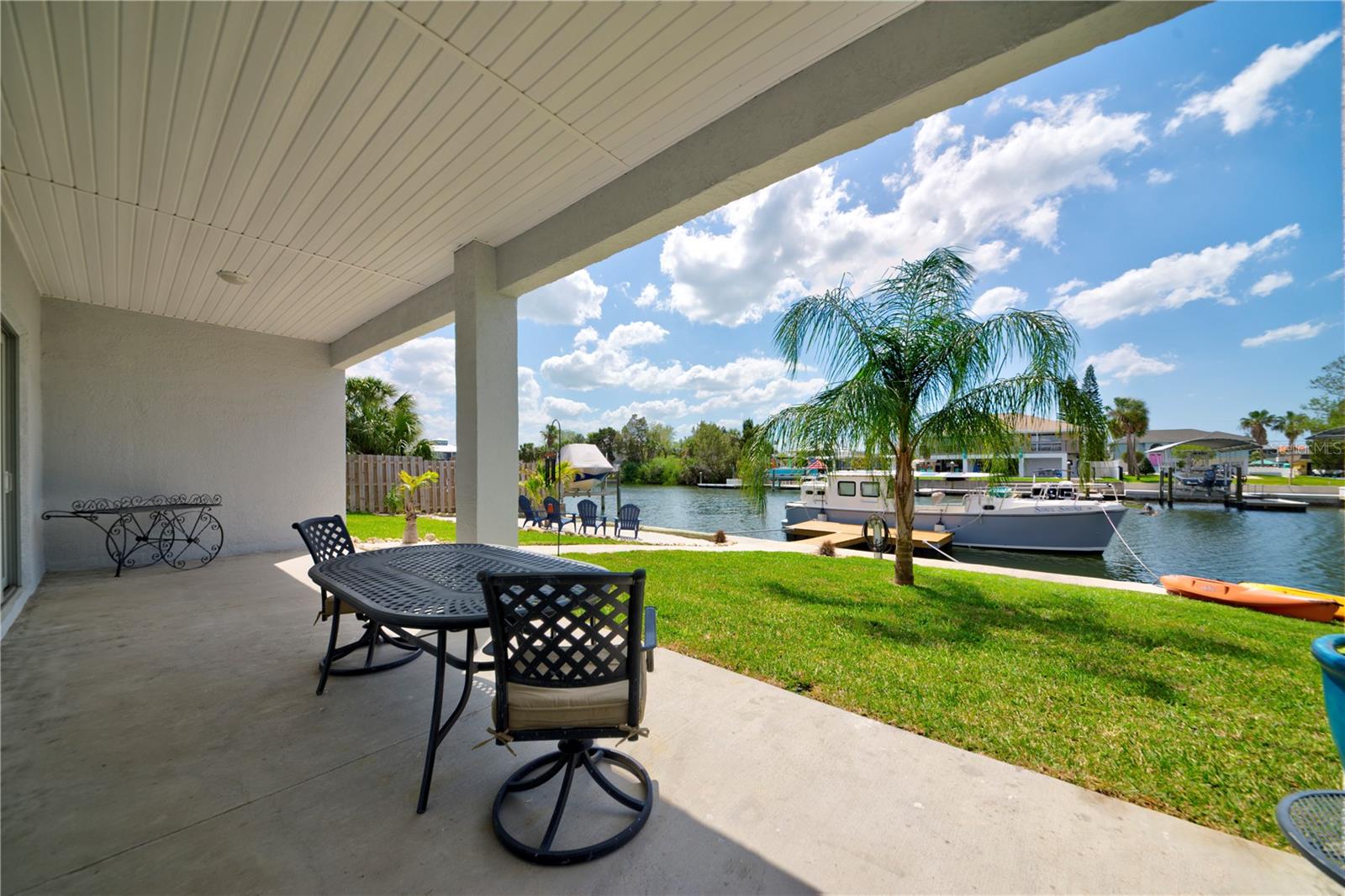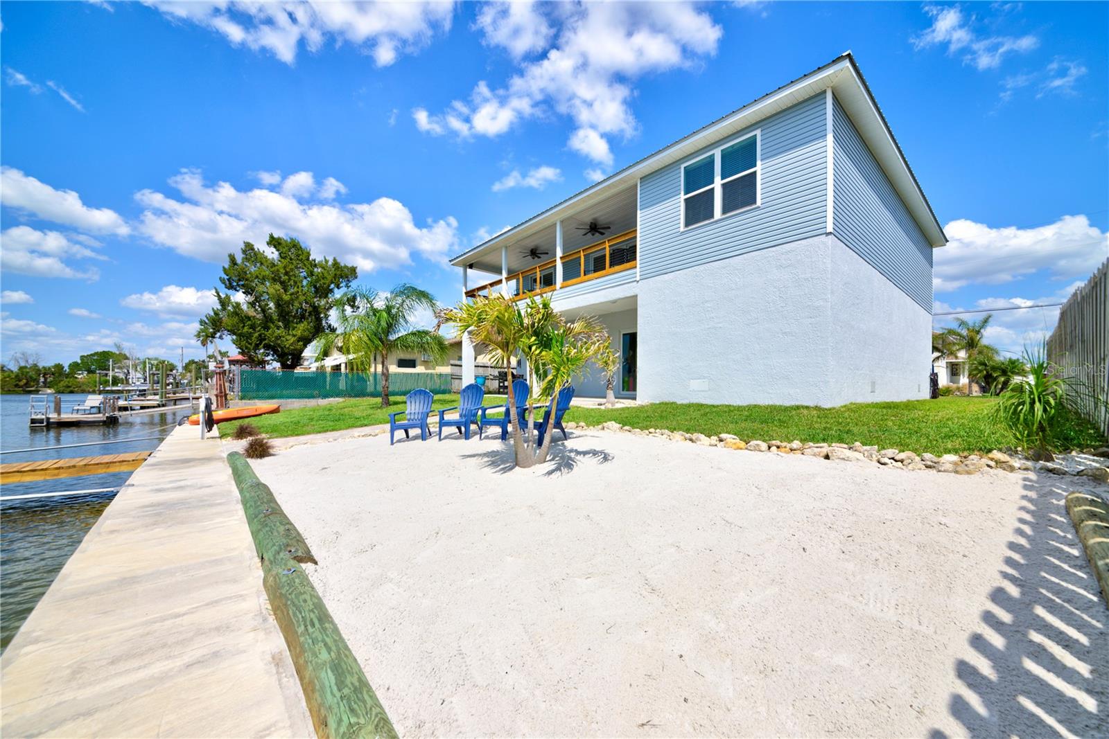 This elevated waterfront gem on a desirable lot in Hernando Beach North offers open access to the Gulf, world-class fishing, seasonal scalloping, and year-round boating from your own backyard. Living Space - With 1683 square feet of living space plus an additional 665 square feet of patio and porch, this home provides ample room to relax and entertain. The additional 1683 square feet of enclosed garage on the ground level has plenty of room for your cars, golf cart, kayaks, and toys. Construction and Design - This custom designed house was completed in June 2023. This home offers exceptional strength and energy efficiency as it is built to meet the 2022 wind shear and structural design criteria of the Florida Building Code. All impact-rated windows and garage doors provide top-tier storm protection, while a secondary water barrier under the metal roof adds an extra layer of defense. Ground-level flow-through vents are designed to reduce possible flood pressure, further protecting the home. With four major updates to the Florida Building Code since just 2010, this newer construction incorporates the latest advancements for greater resilience, lower insurance costs, and long-term peace of mind. As an added bonus, the house is built with an elevator shaft, ready for you to install a lift. Move-in with confidence, this home is built to last. Landscaping and Outdoor Features - The well-maintained landscape includes new sod with a full coverage sprinkler system, a variety of lush palm trees, and a stunning soft sand beach ringed by local limestone. The front entryway does not disappoint! Rising from an expanse of beach shells and bordered by decorative grasses, you will be proud to welcome guests. Interior Layout - This 3-bedroom, 2-bathroom home boasts wide open living space, chef’s kitchen, and 2 spacious bedrooms that open out to a large, desirable west-facing porch—perfect for taking in the sunset from every room! The 3rd smaller bedroom is currently utilized as a laundry room. Waterfront Amenities - Along the 67 feet of waterfront, a new wider seawall cap boasts a new floating dock, enhancing your waterfront living experience. Tie up your boat, launch your kayaks or soak up the sun on your own dock! Don't miss the chance to own this beautiful waterfront property to enjoy gorgeous sunsets and the tranquility of waterfront living. This home is ready for you to move in and start enjoying life on the beach.