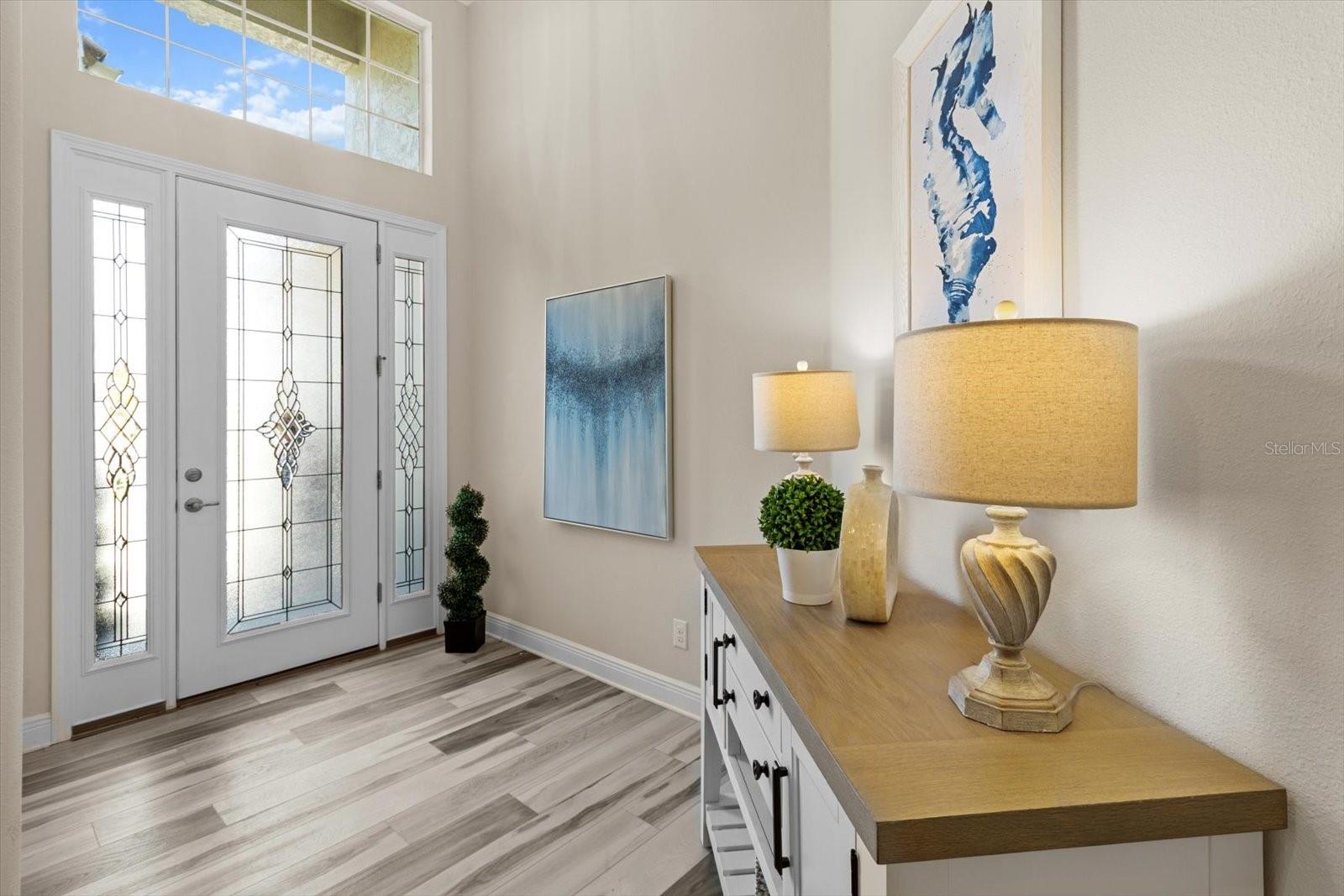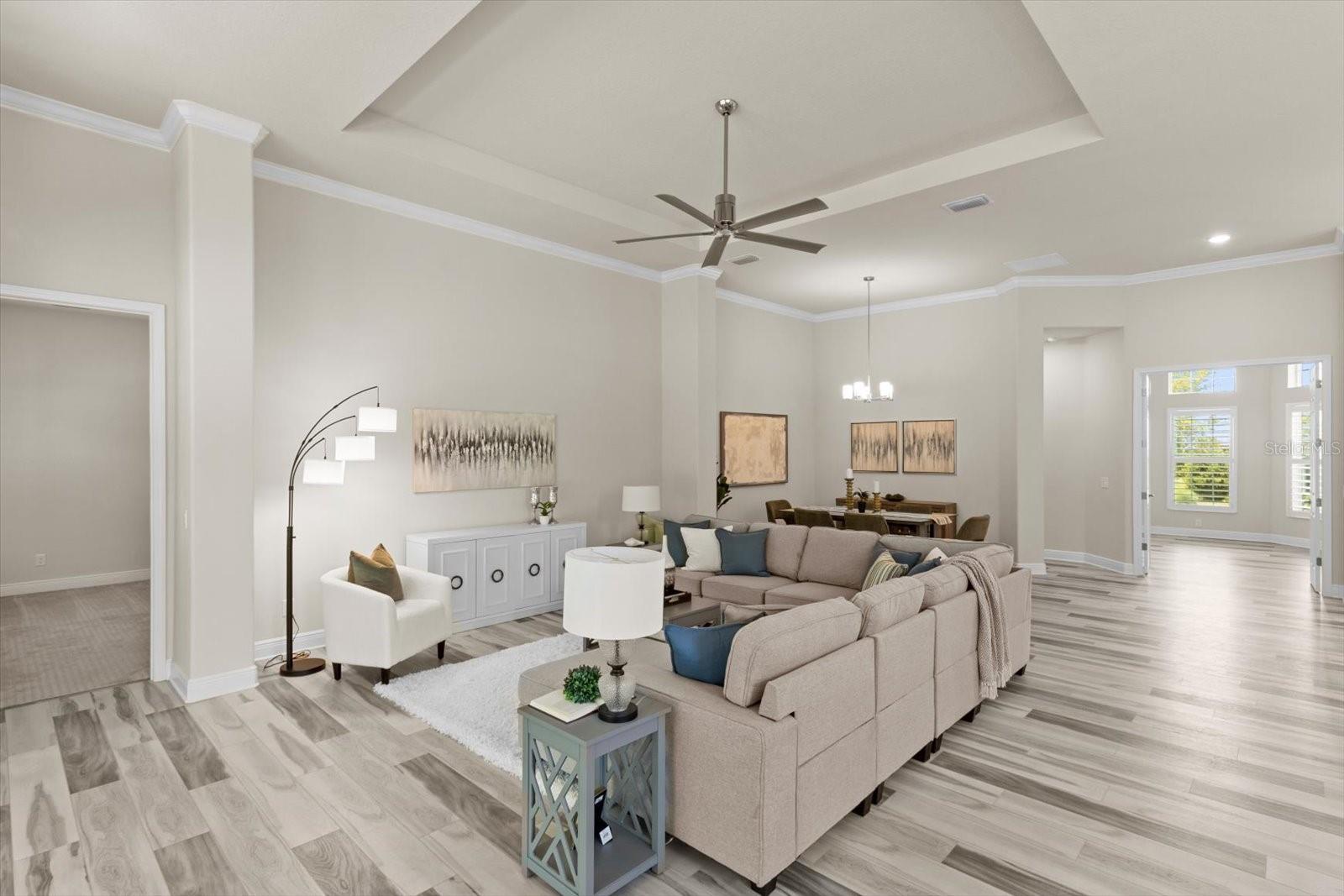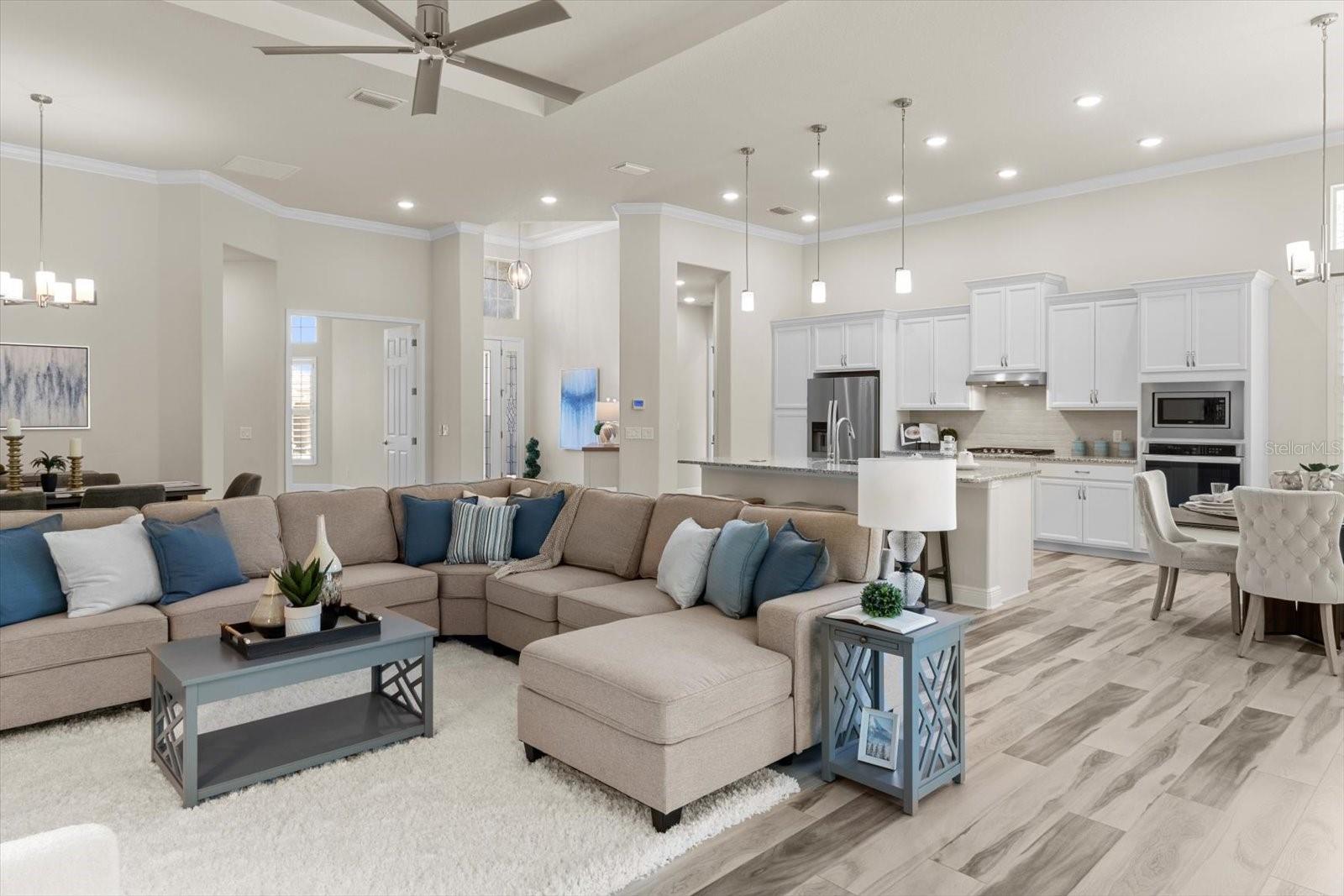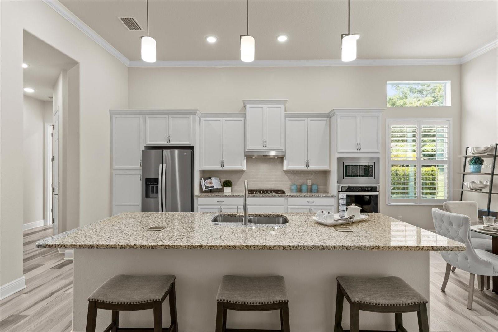 Enjoy incredible savings and move into a like-new home—without the wait of building! This stunning 2023 Waterford model with Southern exposure is located in the amenity-rich Terra Vista community, offering the ultimate Florida lifestyle. Sold partially furnished! Step inside and fall in love with the open floor plan, soft accent walls, and a calming, serene ambiance throughout. The gourmet kitchen features white shaker cabinets, stainless steel gas appliances, flush granite countertops, and a spacious walk-in pantry— great for any home chef. Luxury finishes include luxury vinyl plank flooring, tile, and plush carpet in the bedrooms. The oversized 2-car garage also includes an 8' x 8' golf cart bay- convenient for everyday living! Step through the triple sliding glass doors to the screened-in lanai, serene for outdoor relaxation and entertaining. The primary suite offers a huge walk-in closet, dual vanities, and a walk-in shower for a spa-like retreat. One additional bedroom and a full bath, plus a large flex room, provide ample space for guests, family, or a home office. Additional premium features include: 12-foot tray ceilings, Recessed LED lighting, Crown molding throughout, Programmable thermostat, an AO Smith tankless hot water heater, 50-year barrel tile roof with straps and SWR R-30 insulation, Rain Bird sprinkler system, High-end window treatments, Hidden floor outlets…and much more! Live your best life with easy access to shopping, dining, and entertainment. Meet new friends while enjoying pickleball, golf, tennis, the Tiki Bar, three restaurants, scenic walking trails, a dog park, pools, bocce ball, and a calendar full of fun events at Citrus Hills.