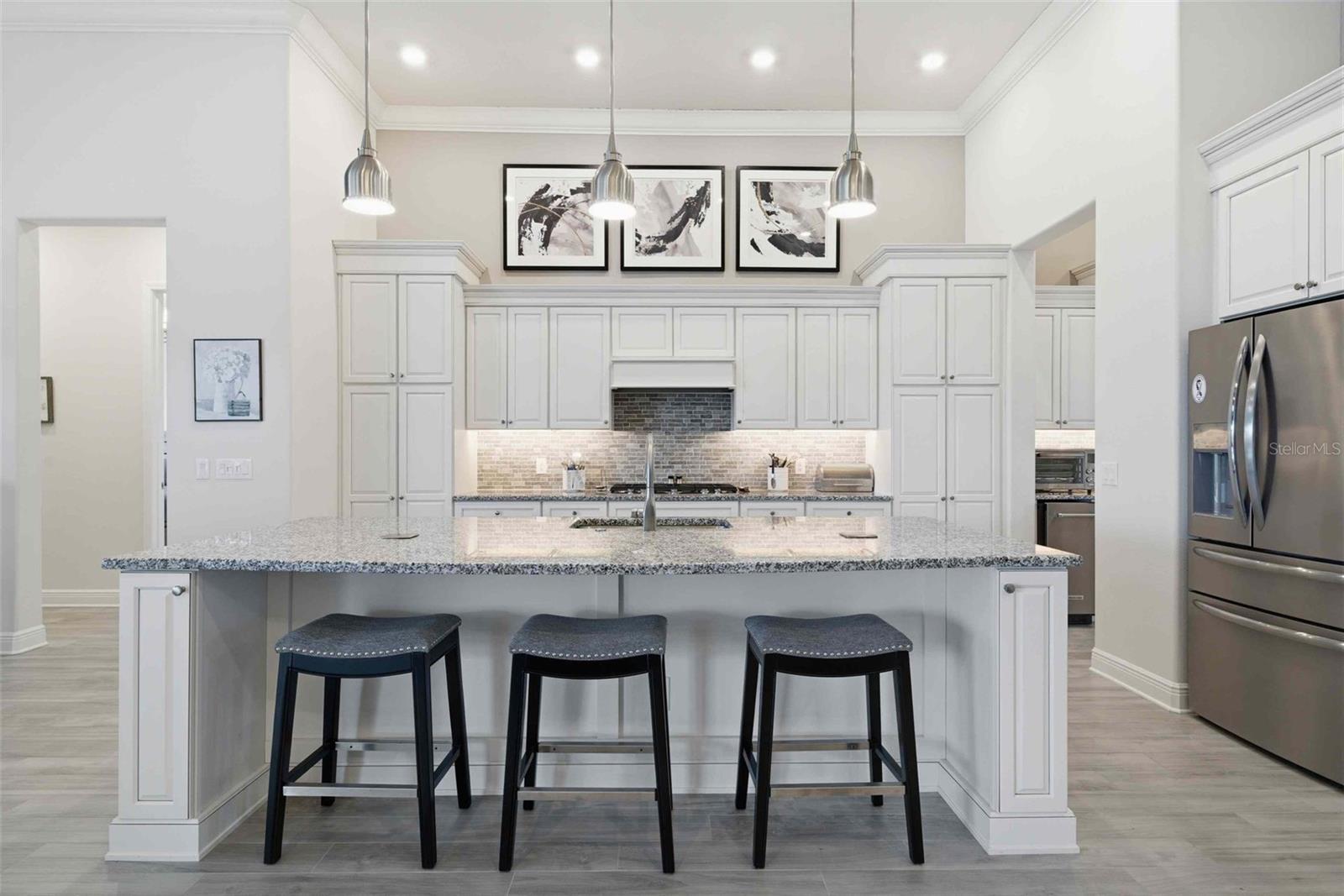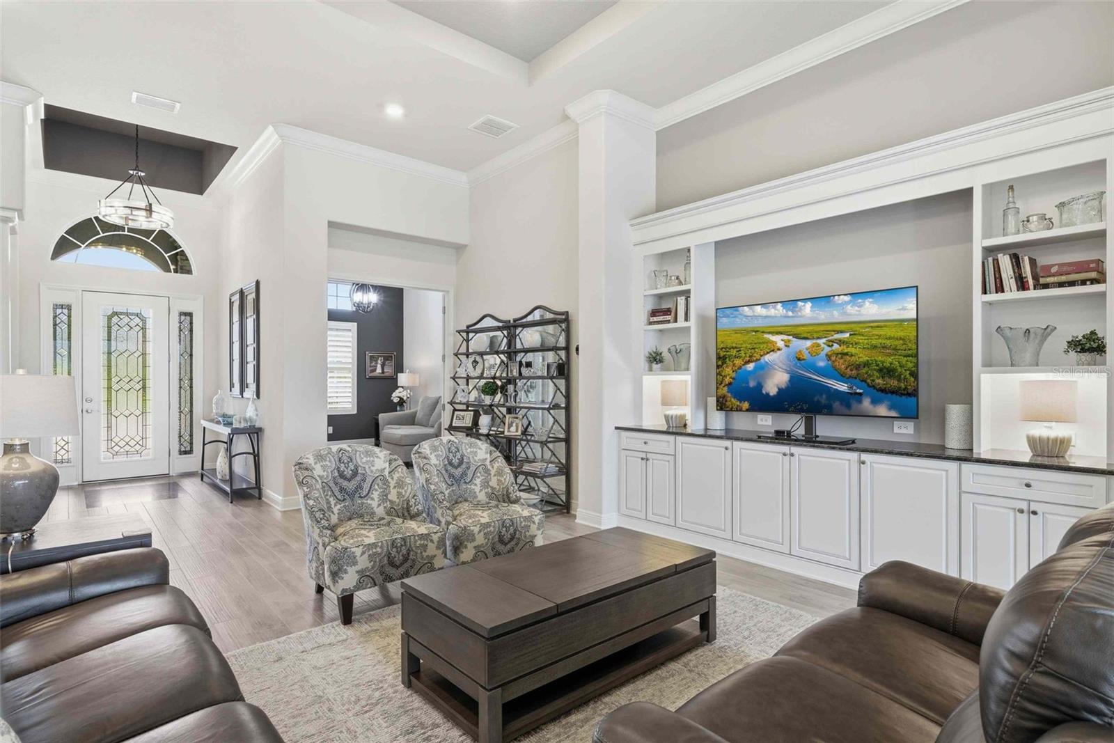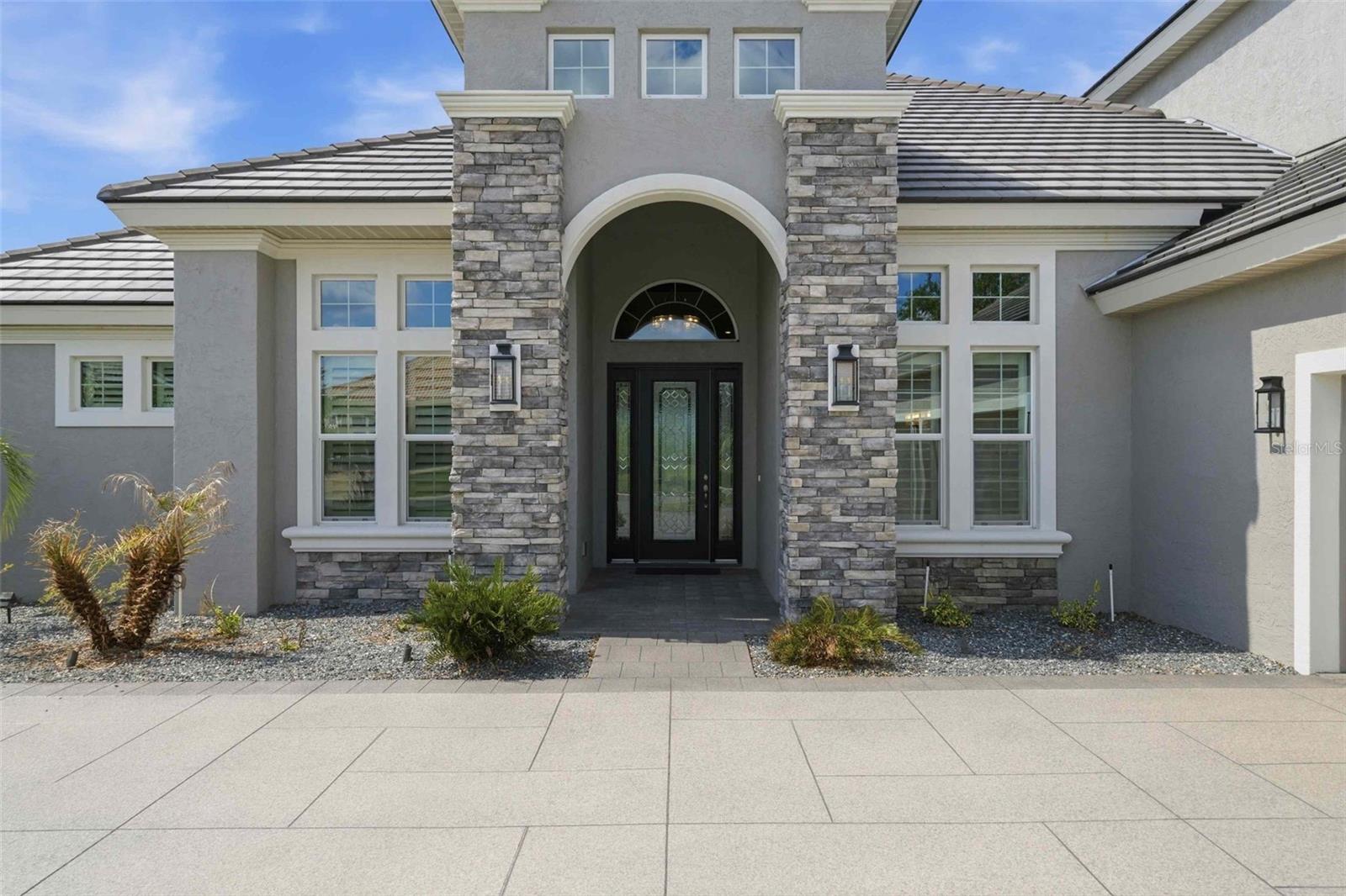 Welcome to an extraordinary residence in Terra Vista’s exclusive Roberts Ridge, where luxury, privacy, and sweeping golf course views define everyday living. This meticulously designed estate spans over 4,000 square feet, delivering a seamless blend of elegance and functionality. From the moment you arrive, the home’s architectural presence stands out—enhanced by stacked stone accents and a decorative architectural concrete driveway that sets the tone for what lies beyond. Inside, soaring ceilings and expansive living spaces create an open, airy feel, anchored by a stunning chef’s kitchen featuring quartz countertops, custom cabinetry, an oversized island, and a dedicated coffee bar/butler’s pantry. A large walk-in pantry and additional custom cabinetry ensure exceptional storage, while thoughtful design touches elevate every corner. The main-level owner’s suite offers a private retreat, while the upper level provides two spacious bedrooms, each with its own ensuite bath, ideal for guests seeking comfort and privacy. The fourth bedroom suite, also on the main level, offers dual sinks, a large walk in shower and large california closet. A formal dining room, spacious den and a dedicated office with a half bath make this home the perfect mix of effortless entertaning and ease for working from home. Step outisde to your personal esort style oasis. The expansive screened lanai features an outdoor kitchen and inground pool overlooking sweeping golf course views.