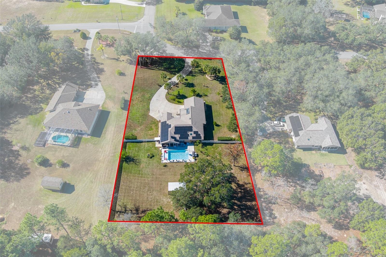 This is the trifecta of efficiency, space, and features to end your Florida home search. Efficiency from the solar electricity and solar water heater creating LOW LOW LOW electricity cost. Additionally you have a full house gas or propane (your choice) generator with transfer switch. Space starts with the long-paved driveway leading to your two car side entry garage. Plenty of parking space for those days and nights of entertaining. Inside the screened front porch the path is adorned with travertine tile guiding you to the two doors, the main entrance and the side "guest" entrance perfect for the parties and gatherings. This guest door opens into a huge flex room that is tastefully decorated with a custom shiplap wall and has french doors to a side patio area (could serve as a great in-law suite). The main home showcases 3 bed split floor plan with a unique design The kitchen has abundant counters and cabinets including the extra hall buffet and the coffee bar in the breakfast nook. The features include a crisp clear saltwater pool that has 2 waterfalls and 2 fountains for poolside ambiance. The pool has a sun deck where you can lounge underneath the large umbrella for comfort from the hot sun. The backyard is fully fenced in decorative vinyl fencing and has 2 spacious sheds plus a covered area for the golf cart or utility trailer. This property is chock full of everything your heart desires. If you are reading this then it's meant to be. Don't miss out, stake your claim NOW!