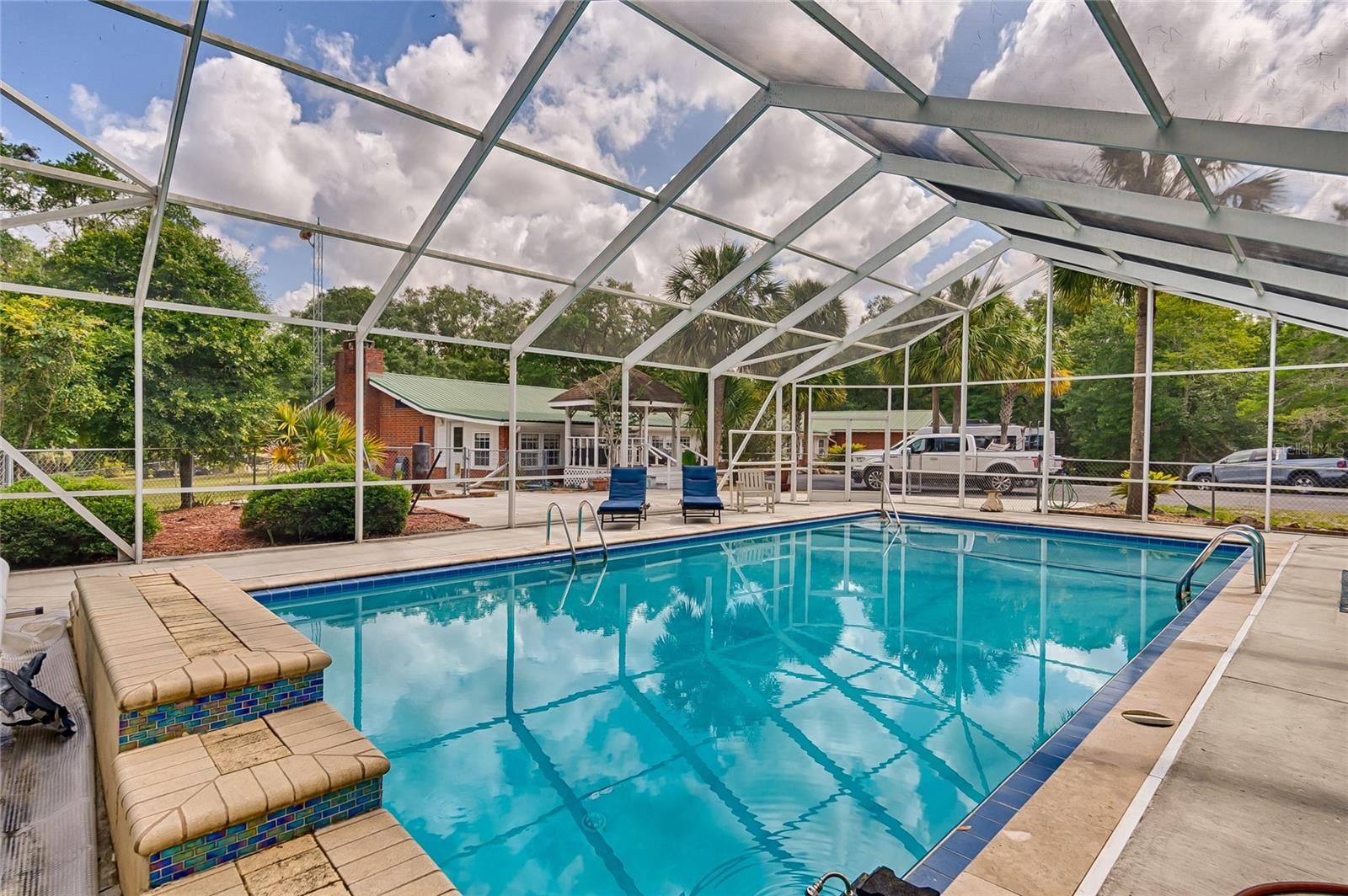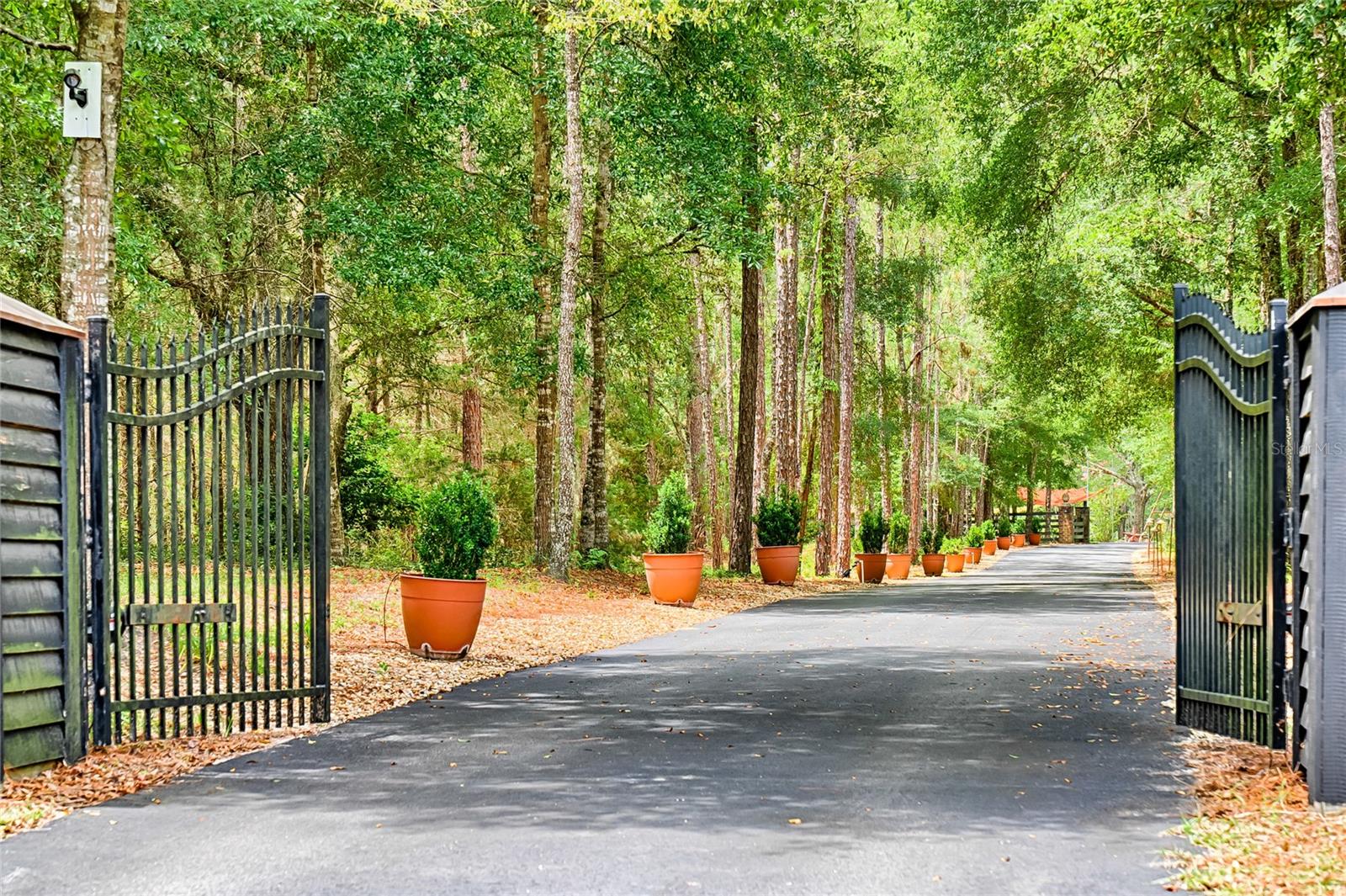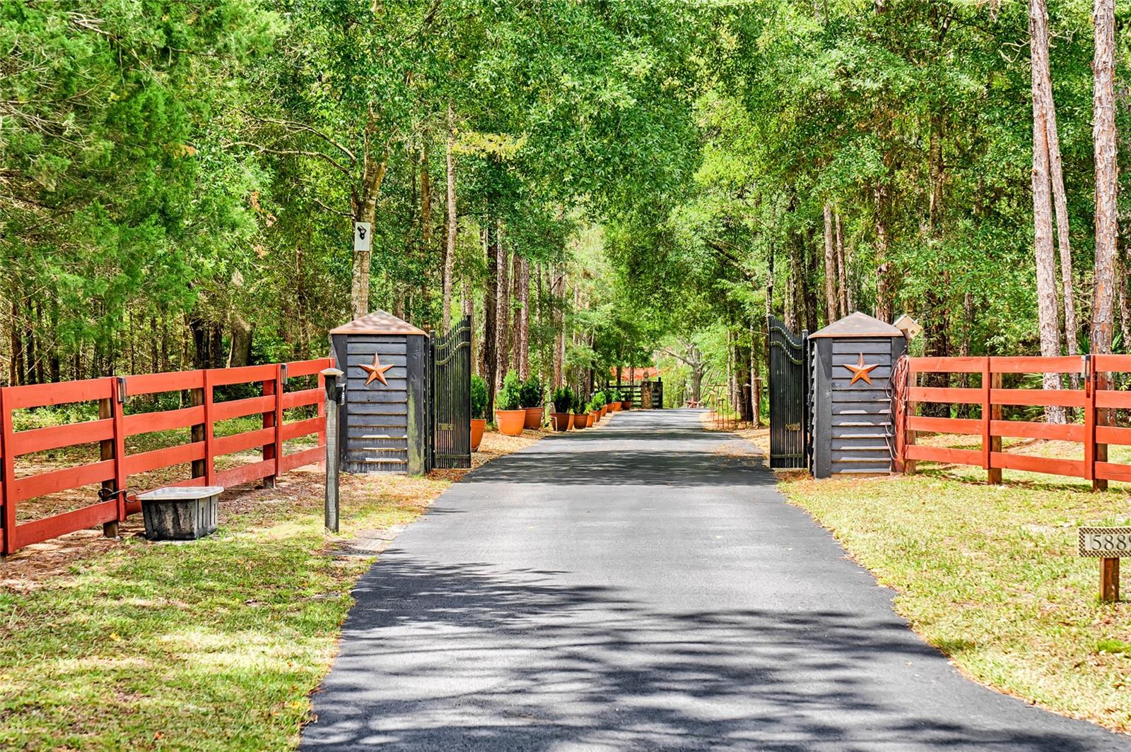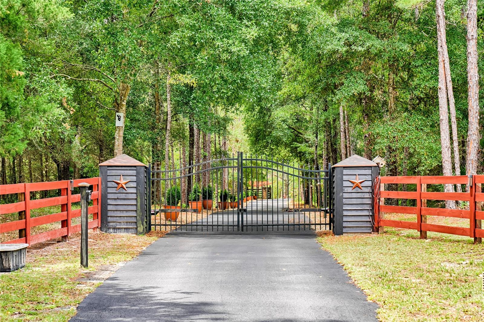 Welcome to your private sanctuary—a custom-built 7,000 square foot luxury home nestled on a 16-acre wooded estate in beautiful High Springs, Florida. As you approach via a tree-lined driveway behind a private gated entrance, you'll be captivated by the serene beauty of this one-of-a-kind property. The main residence, a completely updated two-story masterpiece, boasts numerous upgrades and modern amenities, including hand-laid travertine flooring and a large recreation room with a working fireplace built with rock from the property. The estate also features an adorable guest house, a sparkling lap pool with screened in lanai, and an enormous barn that has been newly renovated with an open floor plan of combination kitchen, dining and living area, as well as one large bedroom with walk-in closet. The lot spans 16 acres, with approximately 75% of the perimeter fenced. The driveway was paved in 2018 and sealed in 2022, while fencing on the main road and a gated entrance were added in 2018, with the fence re-stained in 2023. Built in 1979 by Ralph Royster, the main home features cedar wood framing, newer windows (2014), and a 400-amp electric service updated in 2010, including a generator system and a 50-amp RV service added in 2022. Three bathrooms have been fully renovated, and the primary suite includes a large walk-in closet and luxury bathroom. The lower level offers additional living spaces, storage areas, and a double-length garage. The pool house/in-law suite apartment, remodeled in 2018, includes two bedrooms, a living room, eat-in kitchen, and a beautiful bathroom, with exits to the screened pool area. The in-ground pool, installed in 1985, has been updated with a Diamond Brite finish, glass tile, waterfalls, water features, and converted to a salt system. The barn, a 60x60 concrete block building, has updated electric, a new roof (2017), and a 50-foot RV pad added in 2020. The barn apartment, remodeled in 2023, features an open floor plan and a heat pump system. Utilities include a drilled well system, separate septic systems for the main house, pool house, and barn, and three separate electric services. The property also has a diesel generator for backup power, three heat pumps for the main house, and a Starlink satellite dish for high-speed internet. The main house and pool house have metal roofs installed in 2010, while the barn roof was replaced in 2017. The pool and enclosure were updated in 2018, with a new pool pump installed in 2024. Additional features include a koi pond with a 40,000-gallon capacity, automatic fill system, UV sterilization, and lighting. The estate is serviced by a private garbage collection, HVAC maintenance, pest control, and house cleaning services. There is no HOA, and the security gate is battery-powered with a solar recharging unit. A 24-foot telescopic flagpole at the entrance was updated in 2024, and additional insulation was added to the main house in 2023. Located across the street from Ginnie Springs and a short drive to other natural springs, downtown High Springs, I-75, local area restaurants and more! Welcome HOME!