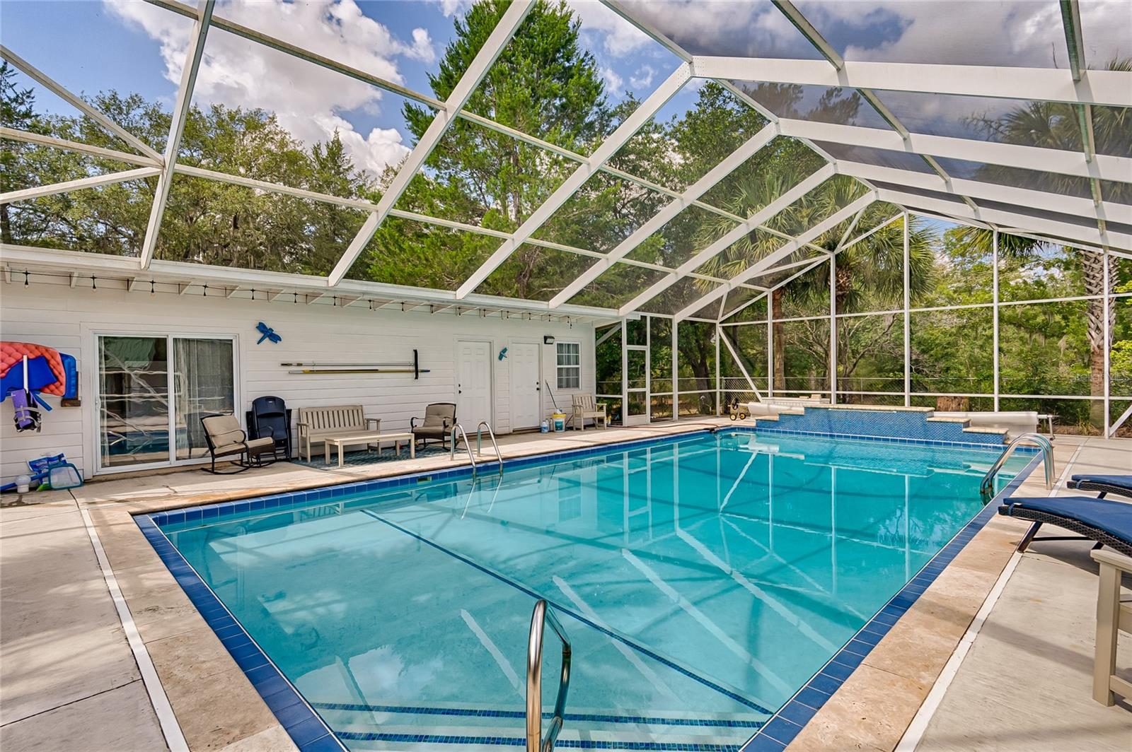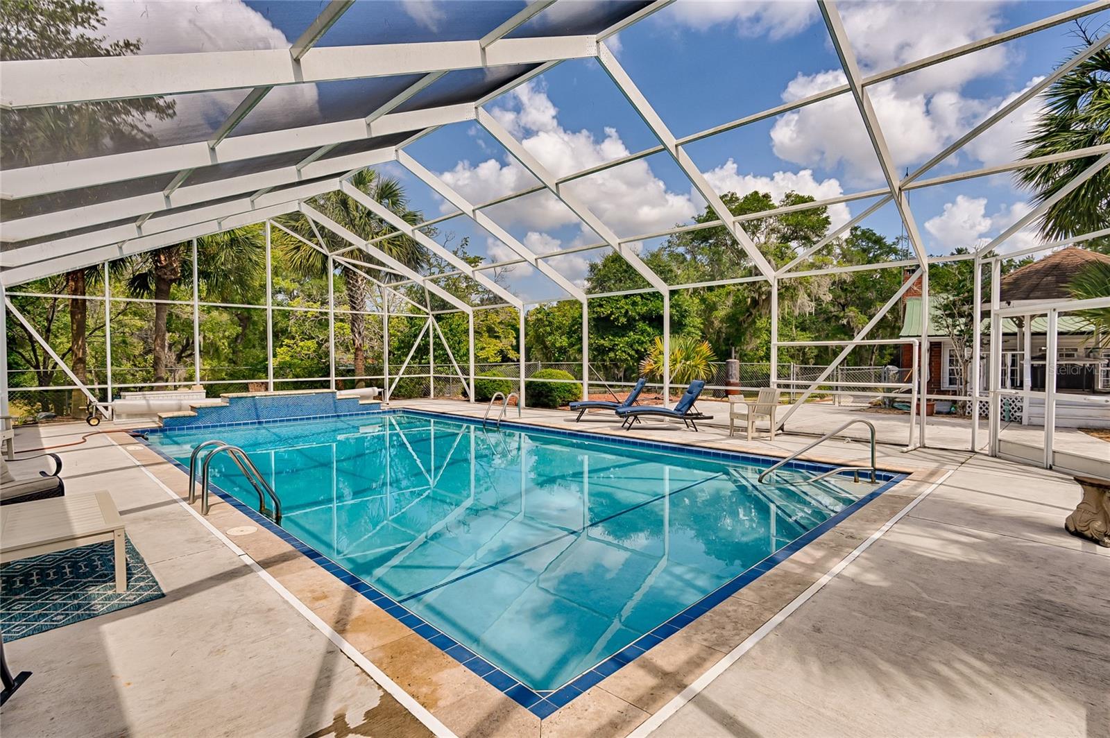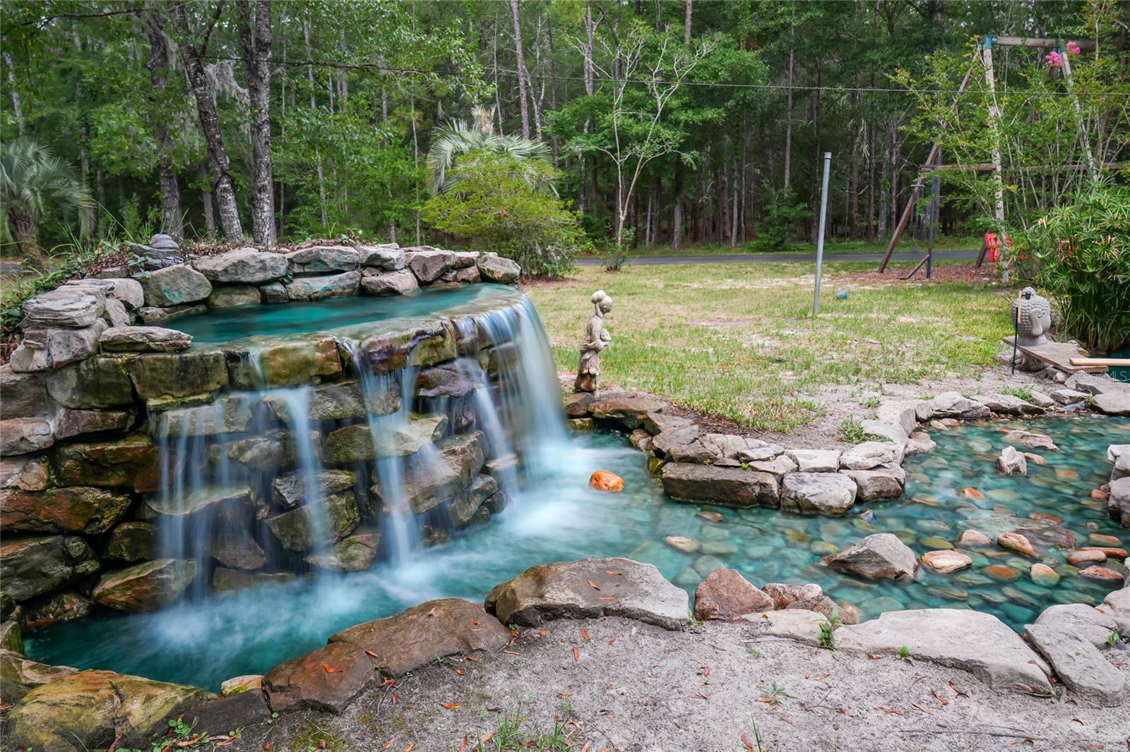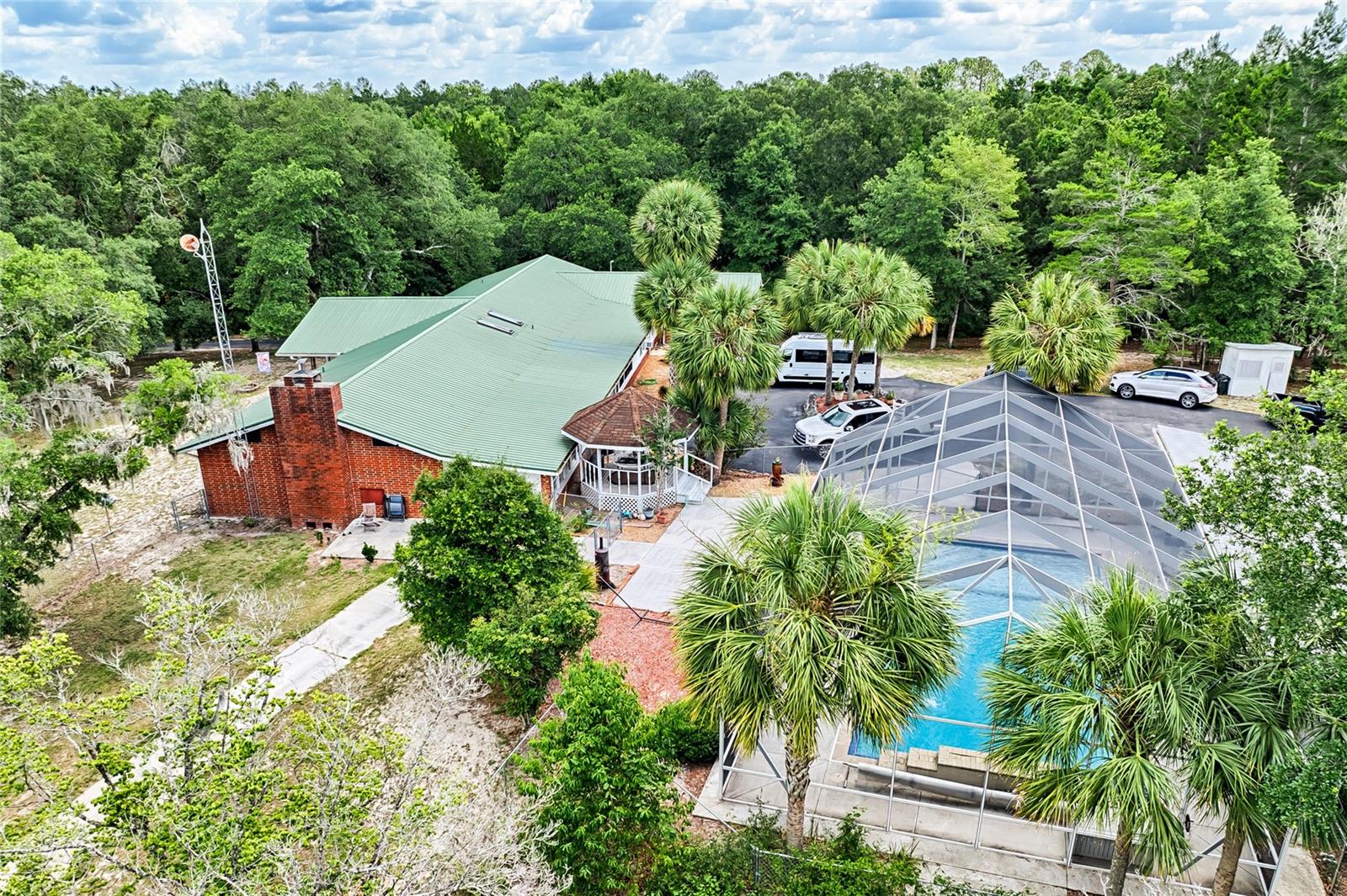 Welcome to your private sanctuary—a custom-built 7,000 square foot luxury home nestled on a 16-acre wooded estate in beautiful High Springs, Florida. As you approach via a tree-lined driveway behind a private gated entrance, you'll be captivated by the serene beauty of this one-of-a-kind property. The main residence, a completely updated two-story masterpiece, boasts numerous upgrades and modern amenities, including hand-laid travertine flooring and a large recreation room with a working fireplace built with rock from the property. The estate also features an adorable guest house, a sparkling lap pool with screened in lanai, and an enormous barn that has been newly renovated with an open floor plan of combination kitchen, dining and living area, as well as one large bedroom with walk-in closet. The lot spans 16 acres, with approximately 75% of the perimeter fenced. The driveway was paved in 2018 and sealed in 2022, while fencing on the main road and a gated entrance were added in 2018, with the fence re-stained in 2023. Built in 1979 by Ralph Royster, the main home features cedar wood framing, newer windows (2014), and a 400-amp electric service updated in 2010, including a generator system and a 50-amp RV service added in 2022. Three bathrooms have been fully renovated, and the primary suite includes a large walk-in closet and luxury bathroom. The lower level offers additional living spaces, storage areas, and a double-length garage. The pool house/in-law suite apartment, remodeled in 2018, includes two bedrooms, a living room, eat-in kitchen, and a beautiful bathroom, with exits to the screened pool area. The in-ground pool, installed in 1985, has been updated with a Diamond Brite finish, glass tile, waterfalls, water features, and converted to a salt system. The barn, a 60x60 concrete block building, has updated electric, a new roof (2017), and a 50-foot RV pad added in 2020. The barn apartment, remodeled in 2023, features an open floor plan and a heat pump system. Utilities include a drilled well system, separate septic systems for the main house, pool house, and barn, and three separate electric services. The property also has a diesel generator for backup power, three heat pumps for the main house, and a Starlink satellite dish for high-speed internet. The main house and pool house have metal roofs installed in 2010, while the barn roof was replaced in 2017. The pool and enclosure were updated in 2018, with a new pool pump installed in 2024. Additional features include a koi pond with a 40,000-gallon capacity, automatic fill system, UV sterilization, and lighting. The estate is serviced by a private garbage collection, HVAC maintenance, pest control, and house cleaning services. There is no HOA, and the security gate is battery-powered with a solar recharging unit. A 24-foot telescopic flagpole at the entrance was updated in 2024, and additional insulation was added to the main house in 2023. Located across the street from Ginnie Springs and a short drive to other natural springs, downtown High Springs, I-75, local area restaurants and more! Welcome HOME!