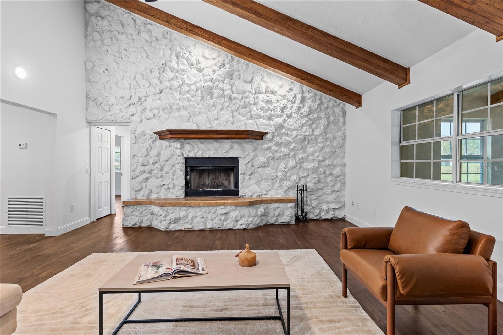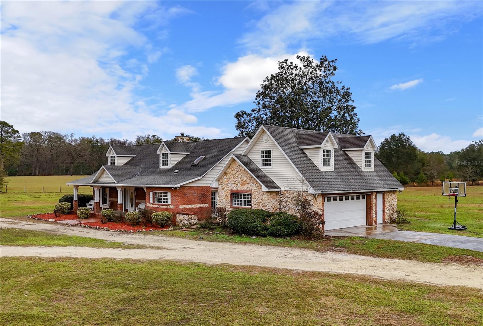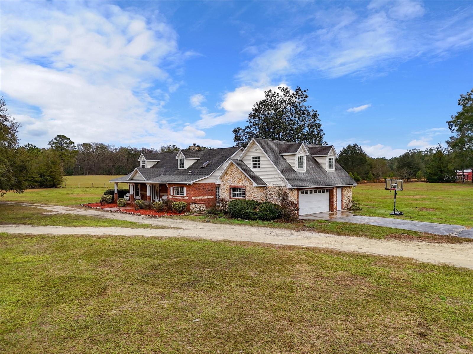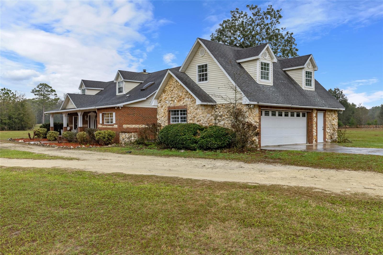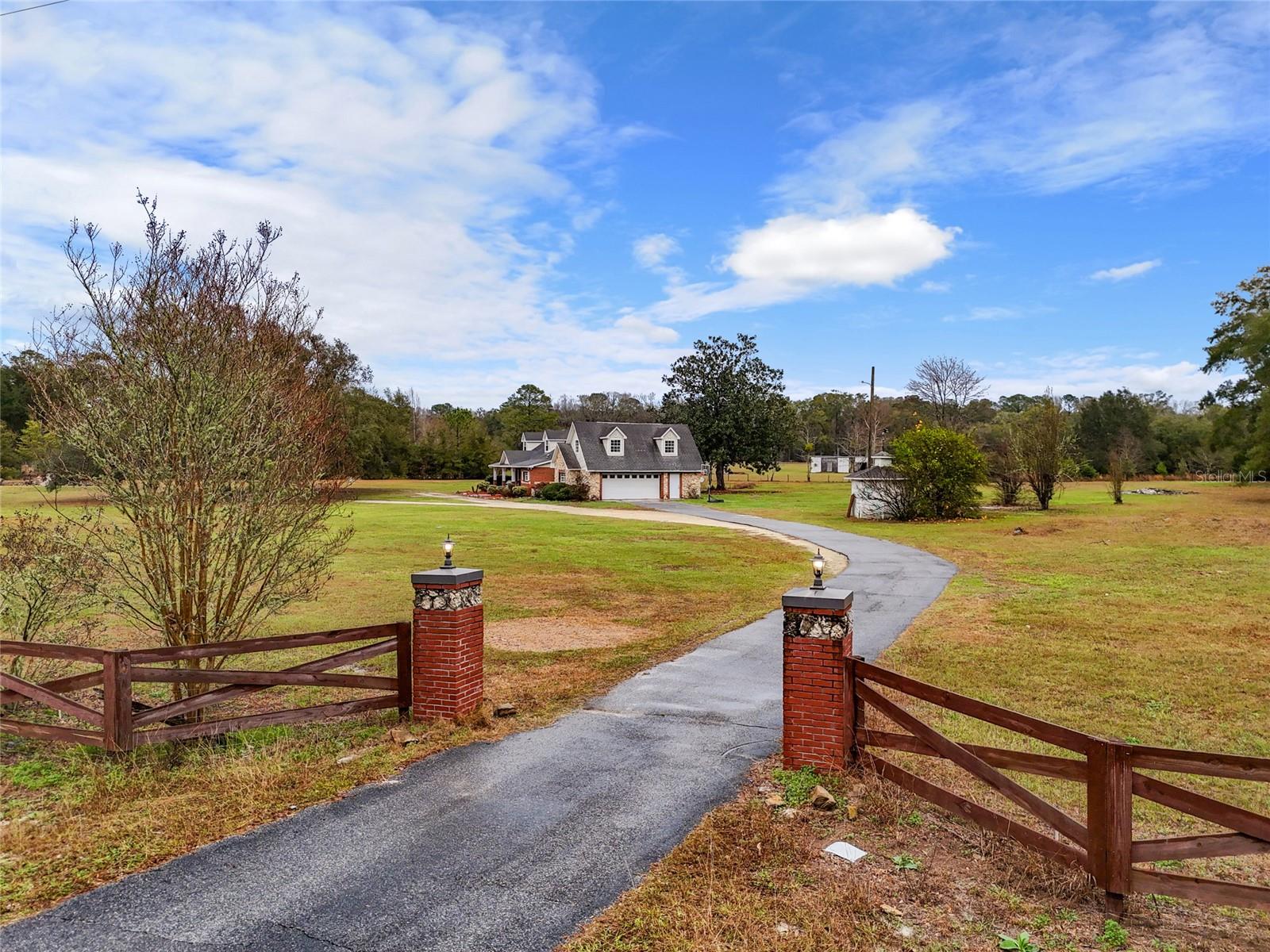 Situated on 6.38 fully fenced and gated acres in High Springs, Florida, this charming 3-bedroom, 2-bathroom renovated country home offers a serene escape just minutes from downtown and I-75. As you drive down the winding driveway, the brick façade and inviting covered front porch draw you in, promising quiet evenings watching the sunset. Inside, the open concept living and dining area welcomes you with its mid-century modern vibe from the warm wood beams overhead and the soft glow of a stately fireplace. The kitchen, thoughtfully updated with shaker cabinetry and sleek quartz countertops, flows seamlessly into a peninsular bar, perfect for casual meals or sipping coffee while enjoying the view of the dining space. The home’s split floorplan offers privacy and ease, with two cozy bedrooms and a bathroom tucked away on one side. The primary suite feels like its own retreat, complete with a walk-in closet and a peaceful en-suite bathroom featuring dual vanities and a soaking tub, ideal for long, relaxed evenings. Beyond the living room, an enclosed sunroom invites you to sit back and enjoy the Florida light in comfort, no matter the season. The two-car garage, just off the kitchen, leads to a spacious bonus room above—an inspiring space for creativity, relaxation, or whatever you dream it to be. Outside, the gazebo stands beside a quiet pond, its rock fountain waiting for someone to bring it back to life. It's a perfect spot to unwind, enjoy nature, or start a fun project—just waiting for your touch. Owner financing is available for qualified buyers! What are you waiting for? Make this home yours today!