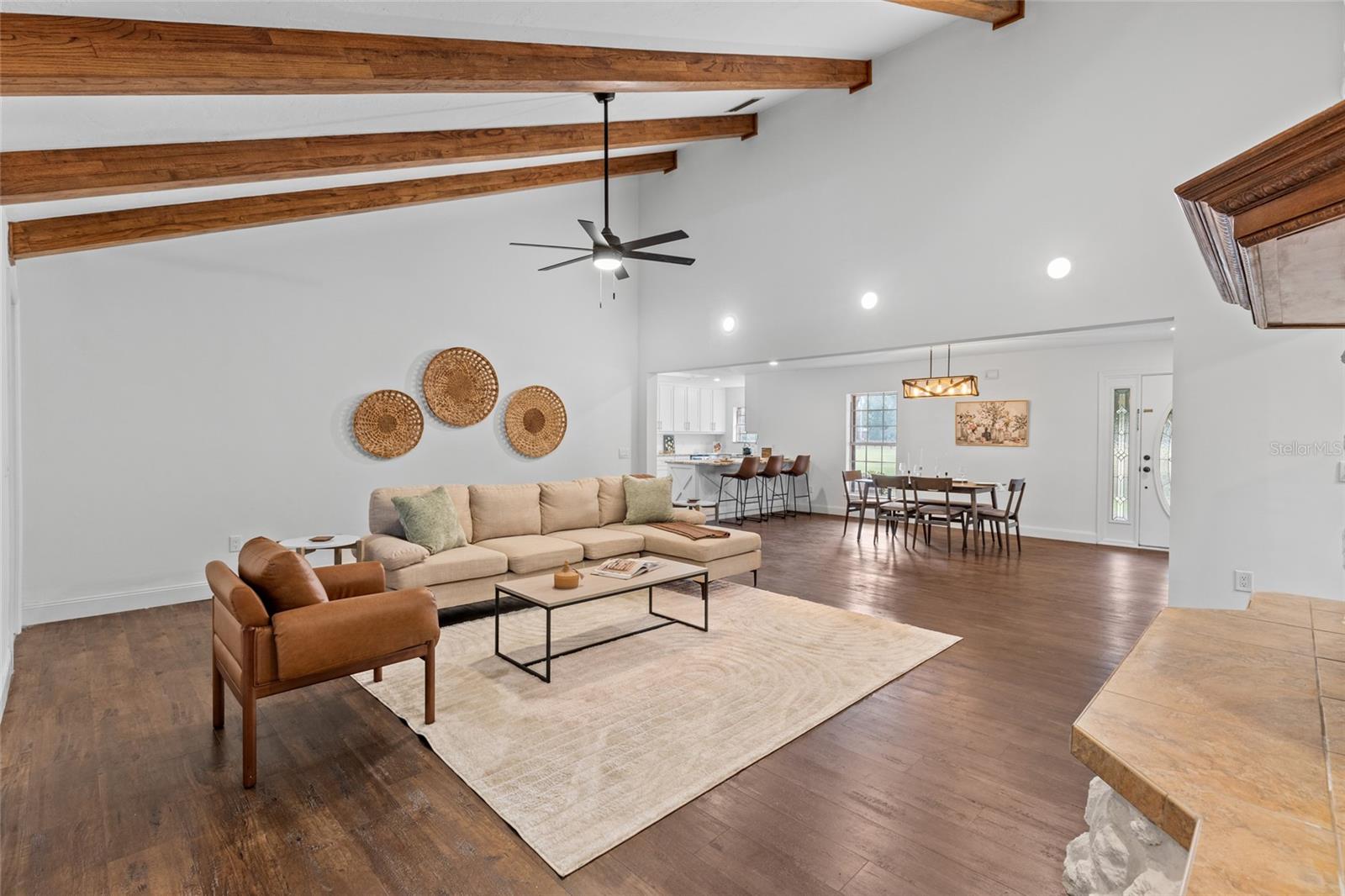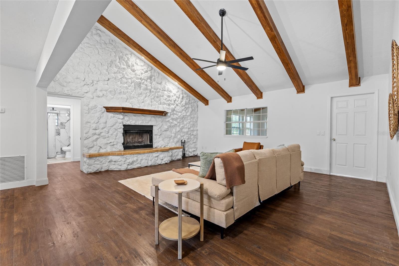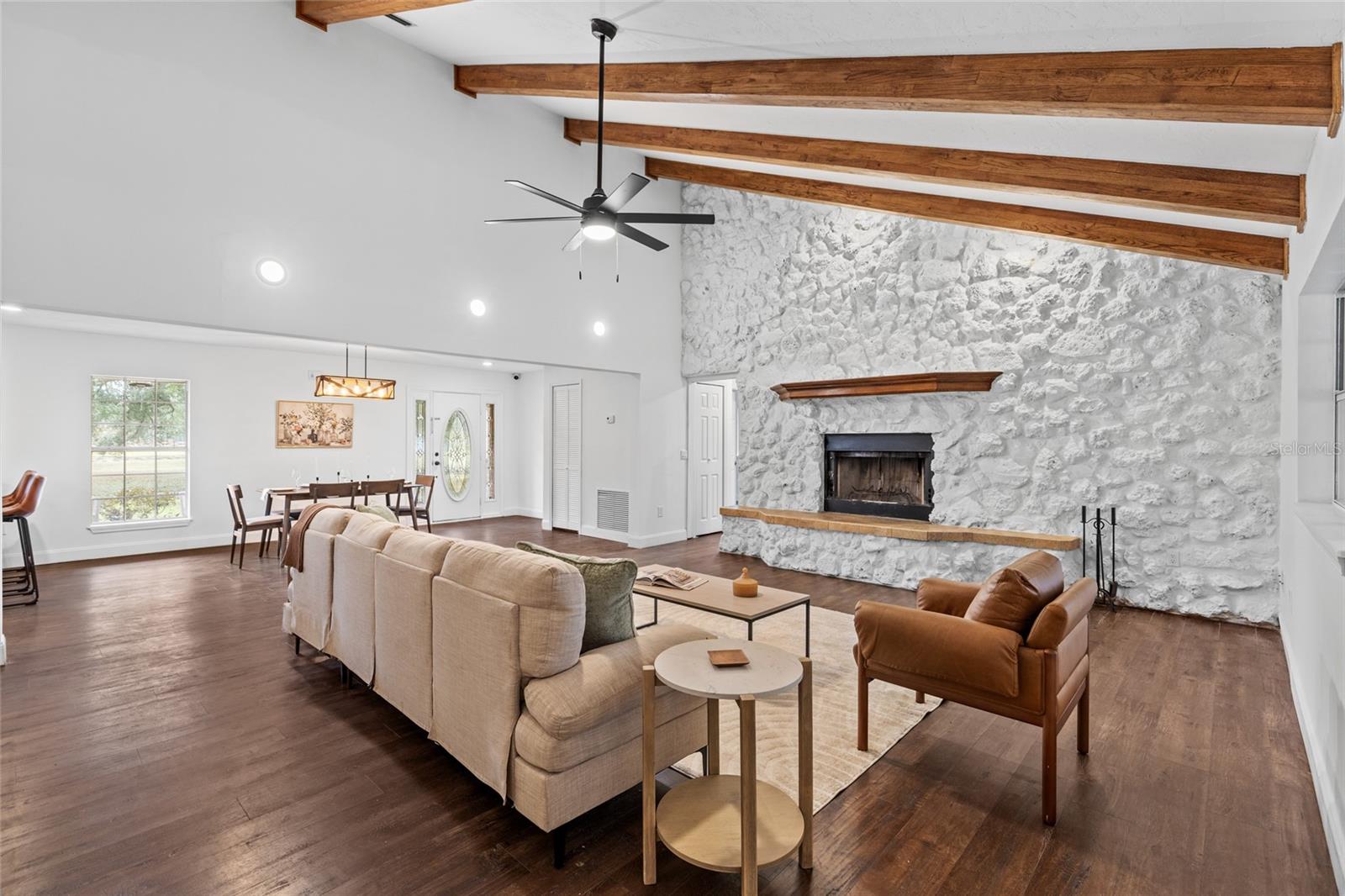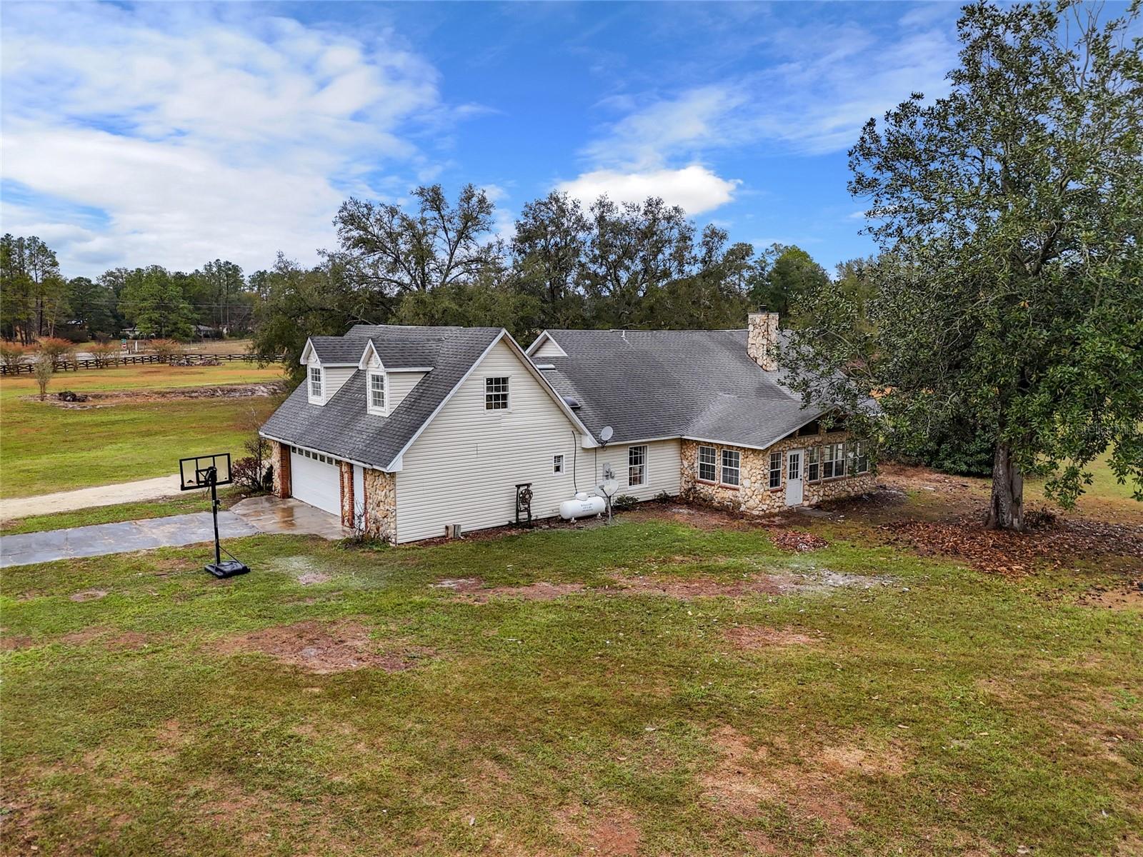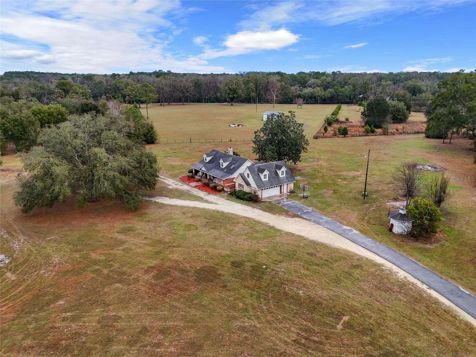 Situated on 6.38 fully fenced and gated acres in High Springs, Florida, this charming 3-bedroom, 2-bathroom renovated country home offers a serene escape just minutes from downtown and I-75. As you drive down the winding driveway, the brick façade and inviting covered front porch draw you in, promising quiet evenings watching the sunset. Inside, the open concept living and dining area welcomes you with its mid-century modern vibe from the warm wood beams overhead and the soft glow of a stately fireplace. The kitchen, thoughtfully updated with shaker cabinetry and sleek quartz countertops, flows seamlessly into a peninsular bar, perfect for casual meals or sipping coffee while enjoying the view of the dining space. The home’s split floorplan offers privacy and ease, with two cozy bedrooms and a bathroom tucked away on one side. The primary suite feels like its own retreat, complete with a walk-in closet and a peaceful en-suite bathroom featuring dual vanities and a soaking tub, ideal for long, relaxed evenings. Beyond the living room, an enclosed sunroom invites you to sit back and enjoy the Florida light in comfort, no matter the season. The two-car garage, just off the kitchen, leads to a spacious bonus room above—an inspiring space for creativity, relaxation, or whatever you dream it to be. Outside, the gazebo stands beside a quiet pond, its rock fountain waiting for someone to bring it back to life. It's a perfect spot to unwind, enjoy nature, or start a fun project—just waiting for your touch. Owner financing is available for qualified buyers! What are you waiting for? Make this home yours today!