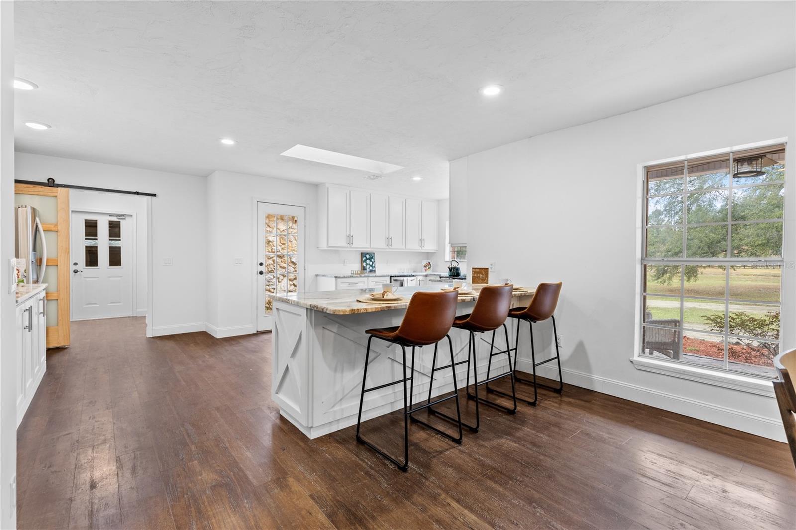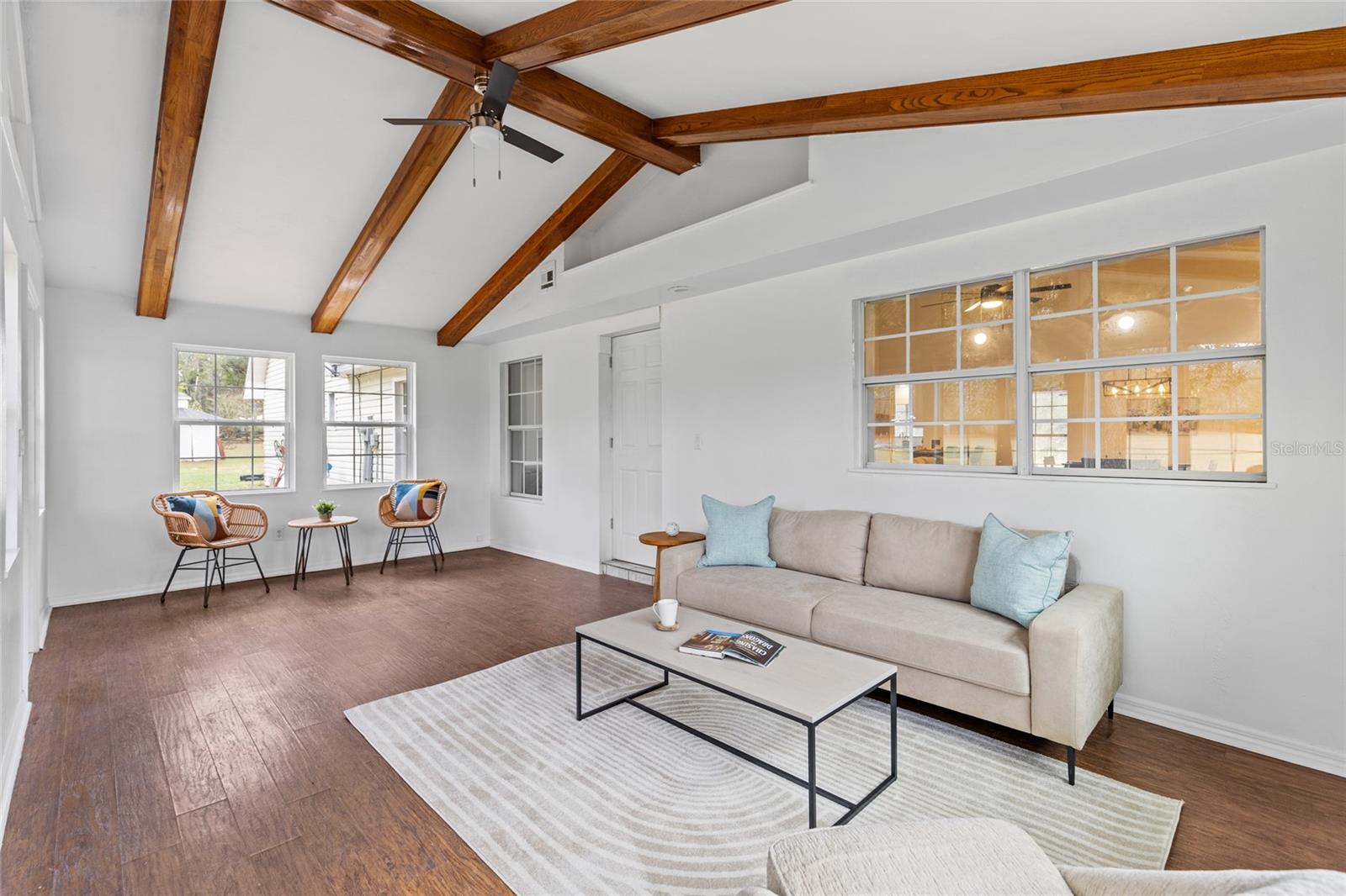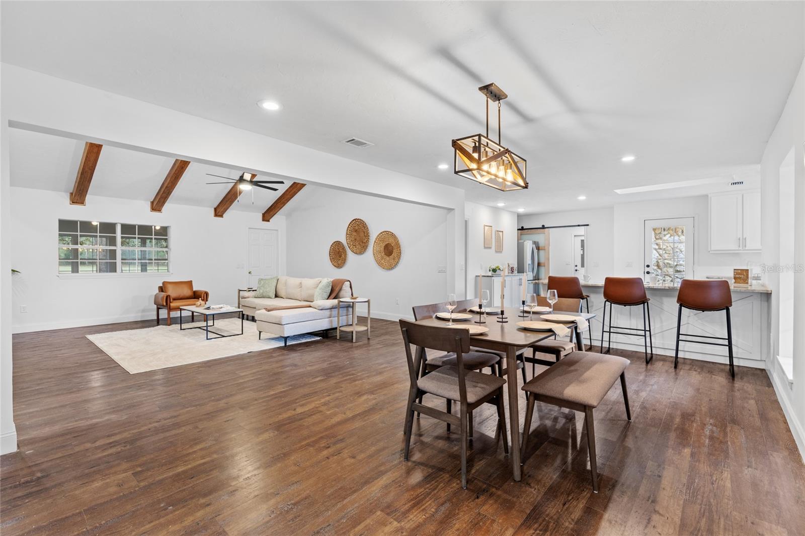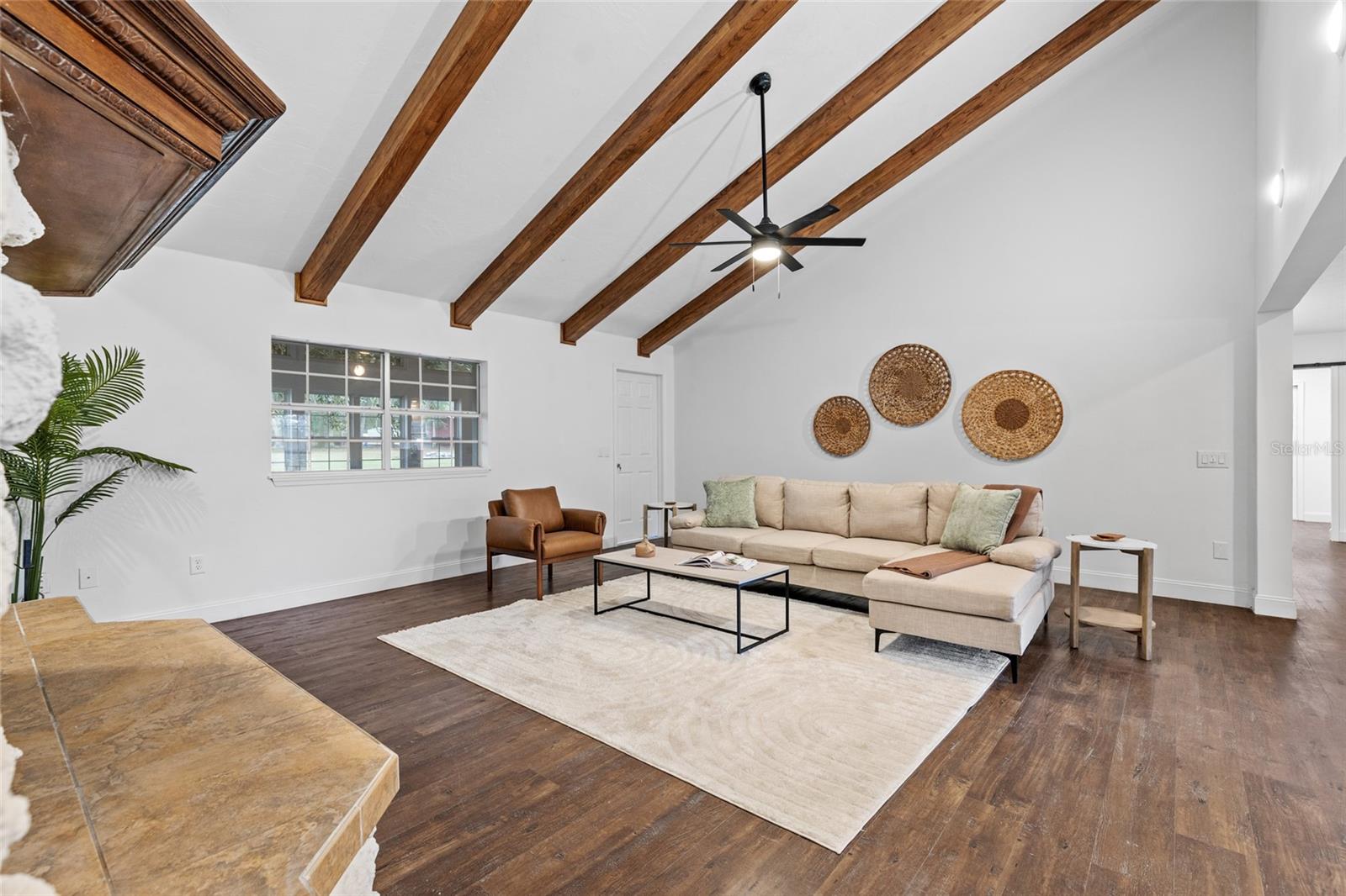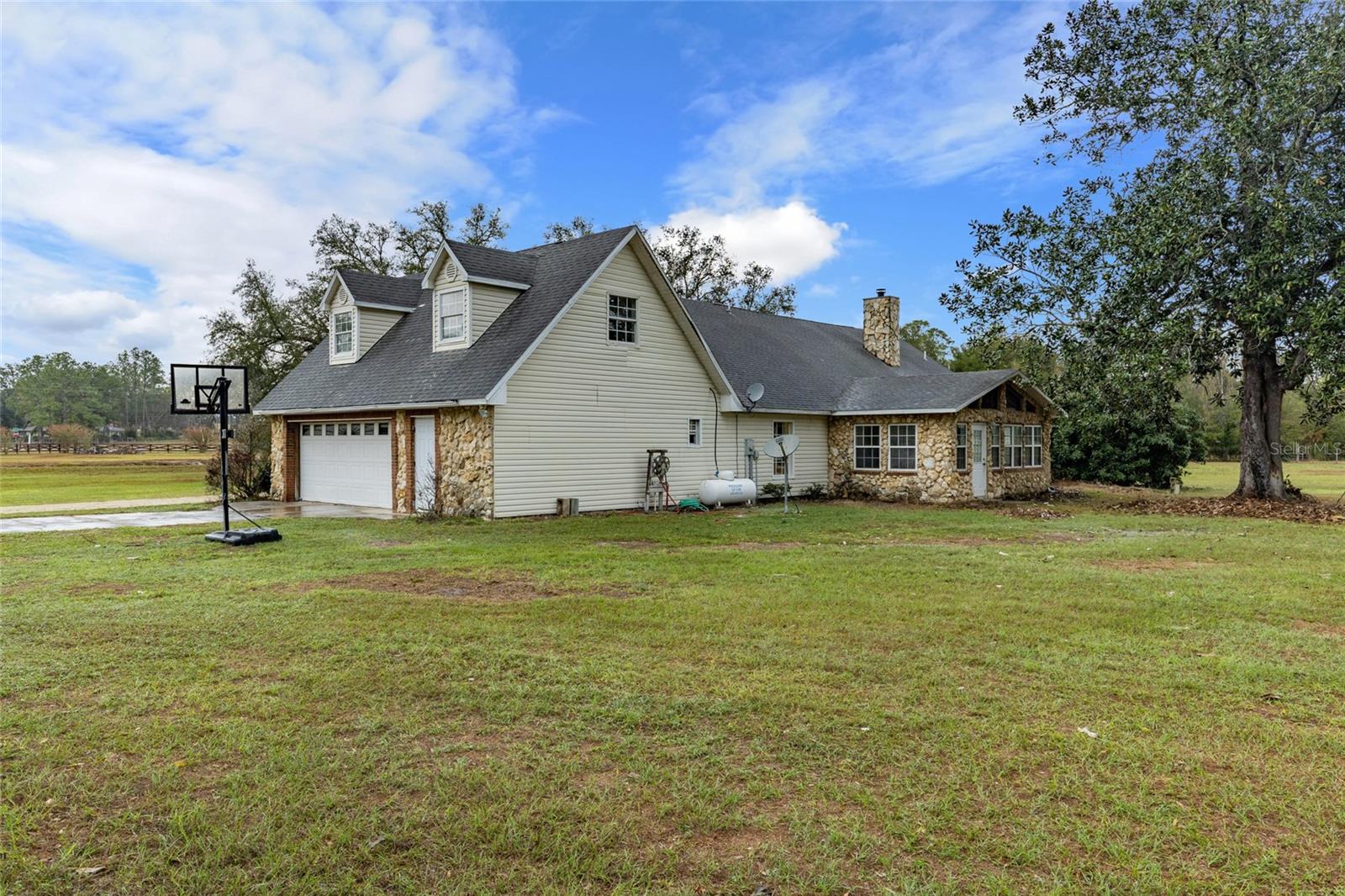 Situated on 6.38 fully fenced and gated acres in High Springs, Florida, this charming 3-bedroom, 2-bathroom renovated country home offers a serene escape just minutes from downtown and I-75. As you drive down the winding driveway, the brick façade and inviting covered front porch draw you in, promising quiet evenings watching the sunset. Inside, the open concept living and dining area welcomes you with its mid-century modern vibe from the warm wood beams overhead and the soft glow of a stately fireplace. The kitchen, thoughtfully updated with shaker cabinetry and sleek quartz countertops, flows seamlessly into a peninsular bar, perfect for casual meals or sipping coffee while enjoying the view of the dining space. The home’s split floorplan offers privacy and ease, with two cozy bedrooms and a bathroom tucked away on one side. The primary suite feels like its own retreat, complete with a walk-in closet and a peaceful en-suite bathroom featuring dual vanities and a soaking tub, ideal for long, relaxed evenings. Beyond the living room, an enclosed sunroom invites you to sit back and enjoy the Florida light in comfort, no matter the season. The two-car garage, just off the kitchen, leads to a spacious bonus room above—an inspiring space for creativity, relaxation, or whatever you dream it to be. Outside, the gazebo stands beside a quiet pond, its rock fountain waiting for someone to bring it back to life. It's a perfect spot to unwind, enjoy nature, or start a fun project—just waiting for your touch. Owner financing is available for qualified buyers! What are you waiting for? Make this home yours today!