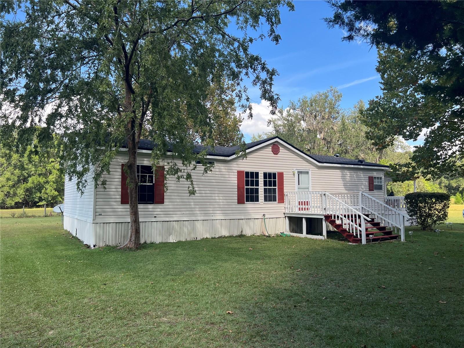 A Rare Treasure! Discover this charming 2000 Grand Manor double-wide mobile home nestled on a fully fenced one-acre lot, perfectly situated between High Springs and Newberry. Enjoy an easy commute to either city, as well as to Gainesville or Lake City. Outdoor enthusiasts will love being just minutes from beautiful rivers and springs for recreation. The well-maintained 3-bedroom, 2-bath home offers laminate flooring throughout, a welcoming living room with a wood-burning fireplace, and a spacious family room that opens to the eat-in kitchen. The kitchen features a bay window overlooking the scenic yard, granite countertops, and all major appliances — electric range, dishwasher, microwave, and refrigerator. The primary suite includes a walk-in closet and an ensuite bath with a walk-in shower. Relax outdoors on the front porch or the covered side porch, perfect for morning coffee or evening gatherings. Additional features include a utility building and lean-to for storage and lawn equipment, both with power connected. There’s also a plug-in for a whole-house generator (generator not included). The roof and A/C were replaced approximately 6–7 years ago, and the septic system was pumped about 4 years ago. The property is attractively landscaped with mature trees and features two metal gates for easy access.