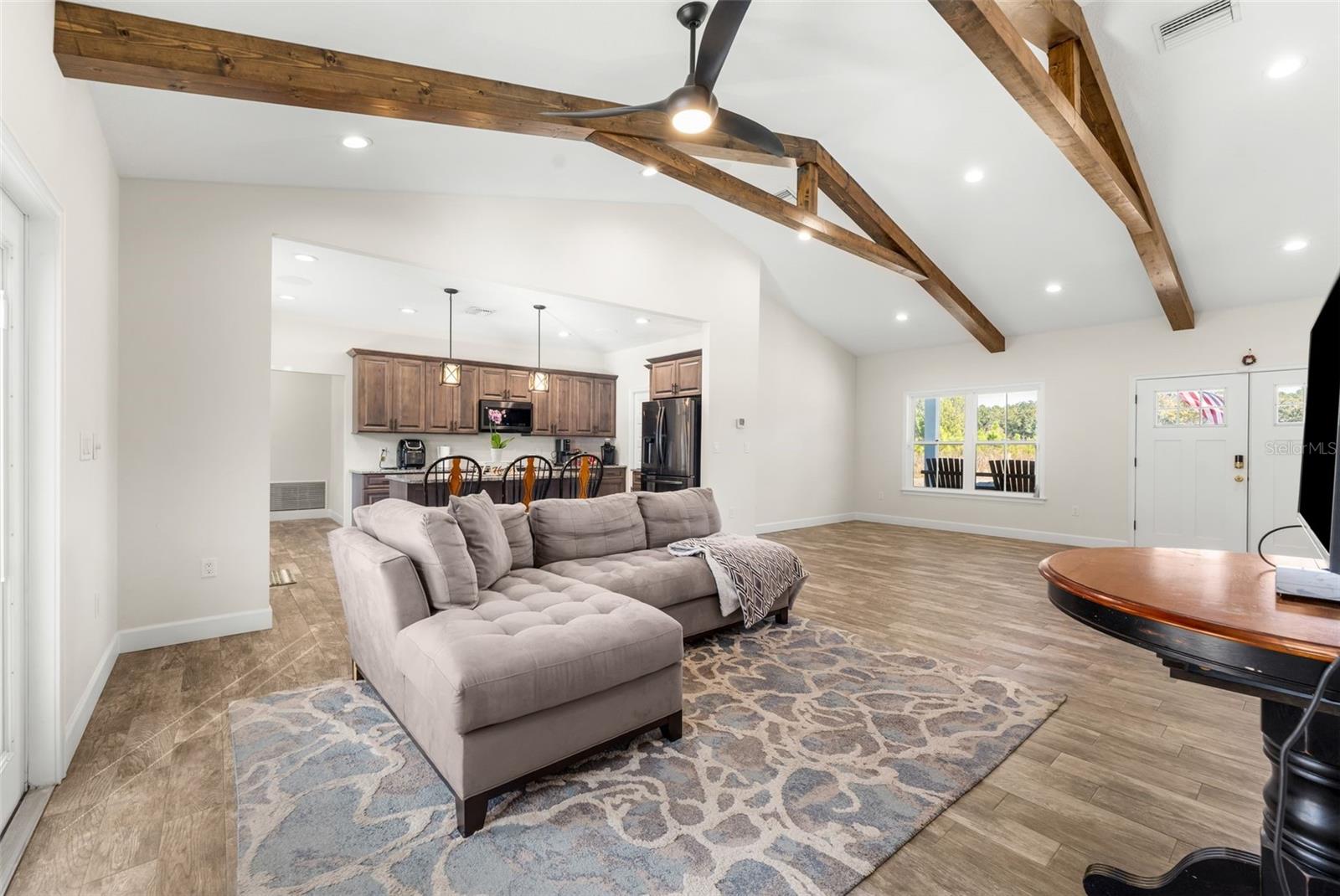 Welcome to this private retreat tucked away on a quiet street with only 6 parcels, offering a rare sense of space and seclusion. Situated on 6.05 wooded acres, this home provides peaceful surroundings and privacy from neighboring properties. Featuring 4 bedrooms, one of which is being used as a bonus room and 2 full bathrooms. Inside, there is an open floor plan with vaulted ceilings with exposed beams create an open and inviting atmosphere throughout the main living areas. The kitchen is thoughtfully designed with stainless steel appliances, granite countertops, and all-wood cabinetry with soft-close drawers, beautiful backsplash and deep farmhouse sink. Granite countertops extend into both bathrooms and are paired with quality Delta fixtures throughout the home. The 4th bedroom features a built-in surround sound system, making it ideal for a media room, home office, flex space or bedroom. Also has a door leading out to the back patio. The entire home is wired with CAT6 cabling, offering a true smart-home setup suitable for high-speed internet, security systems, and remote work. The 200-amp electrical panel provides ample capacity with room for future expansion. The laundry room includes custom cabinetry, and the washer and dryer are included. Built-in closet cabinetry is featured in both the primary bedroom and a secondary bedroom, maximizing storage and organization. The hall bathroom offers a built-in linen cabinet and a tub/shower combination behind a pocket door. The primary suite includes an en-suite bathroom with a walk-in shower, separate vanities, and a linen cabinet. Outside, enjoy an open back porch overlooking the wooded acreage, offering a perfect setting for relaxing or entertaining and an excellent location for adding a future pool. A 2-car pole barn on a concrete slab provides additional storage and workspace. The metal roof adds durability and low-maintenance appeal. Surrounded by woods and located on a quiet road with minimal traffic and limited development, this property delivers a secluded setting while still offering modern finishes, thoughtful design, and advanced connectivity. A rare opportunity to enjoy privacy, acreage, and comfort in a peaceful environment.