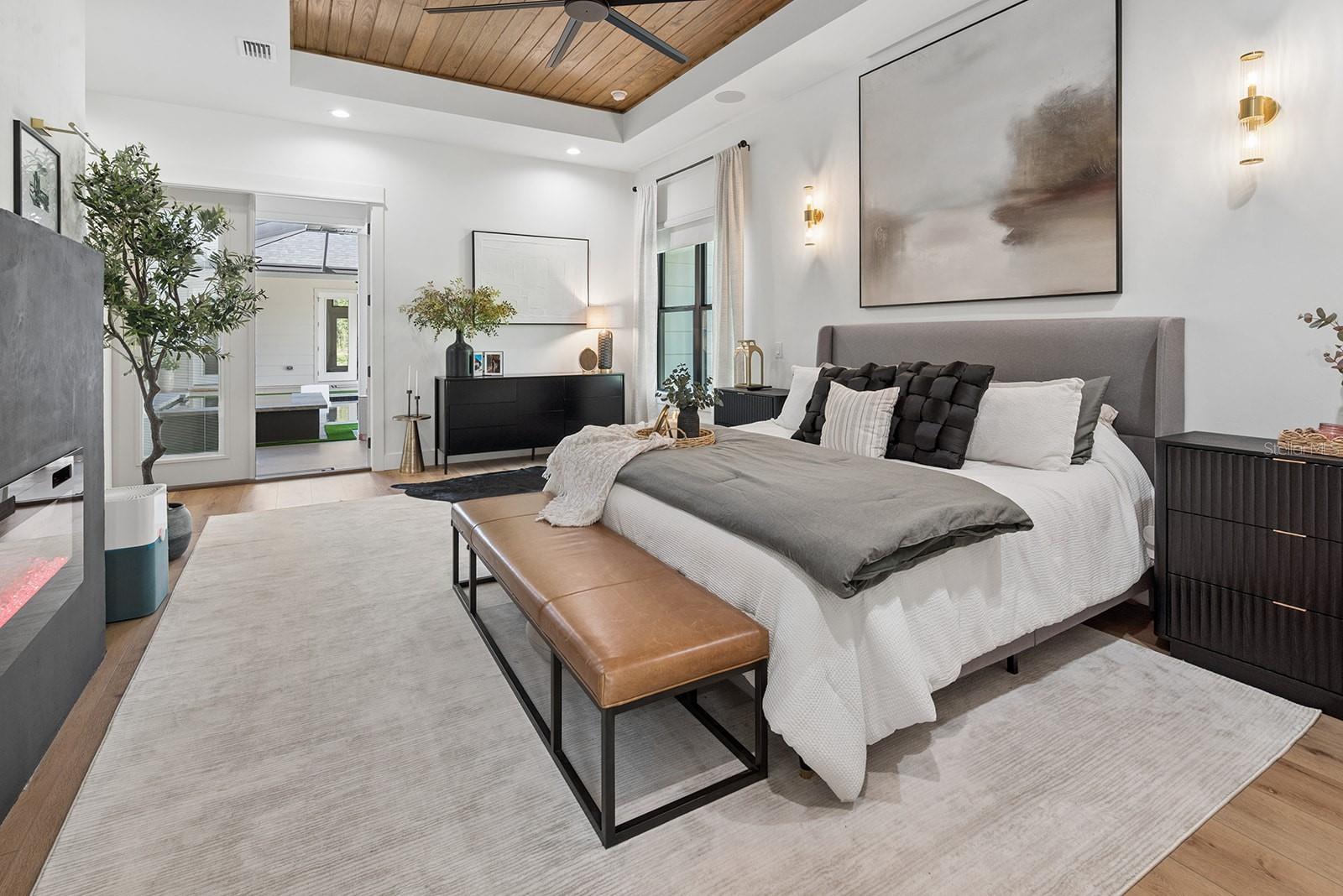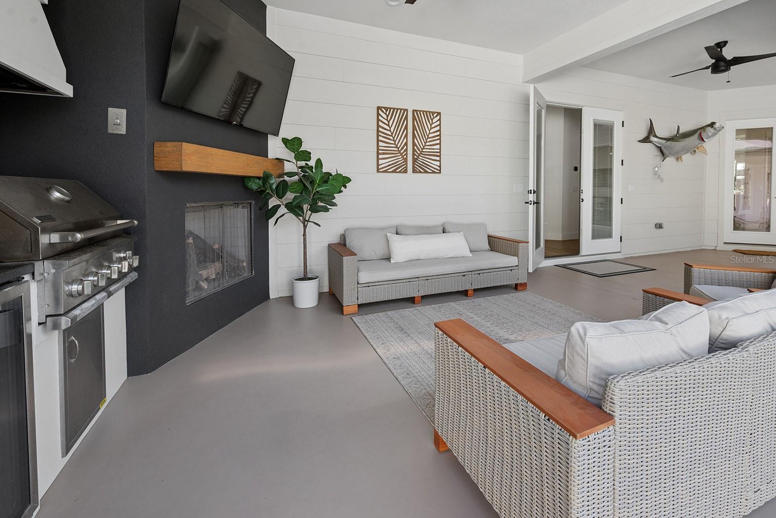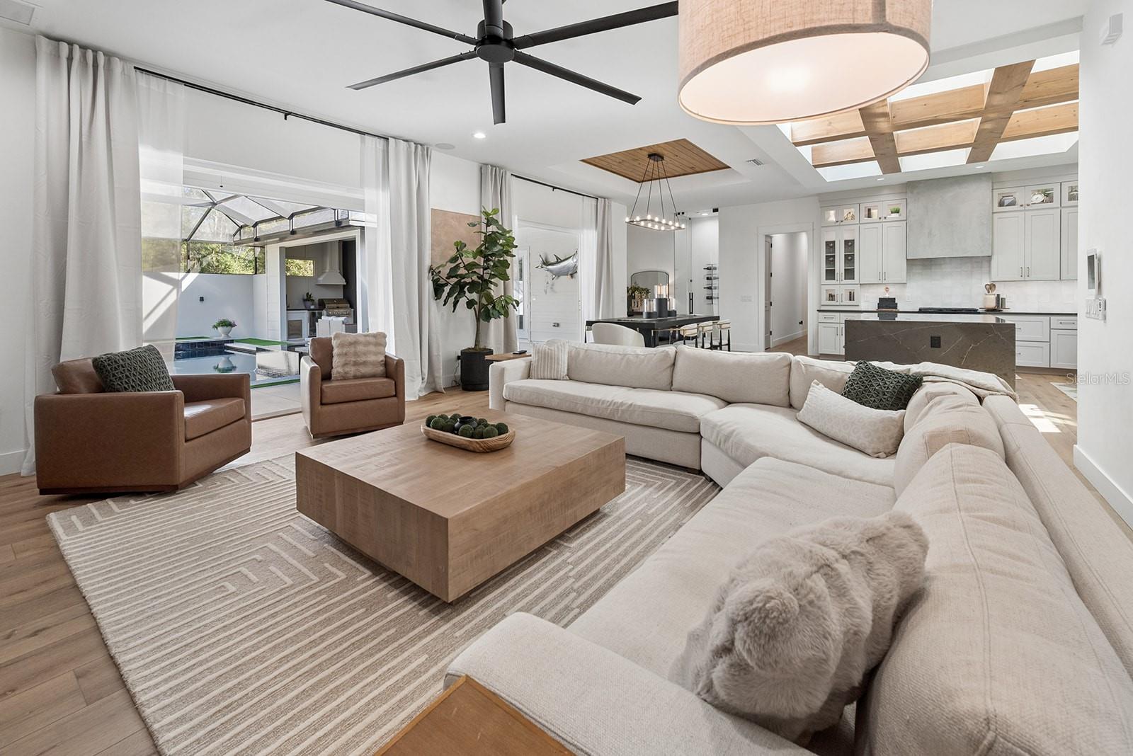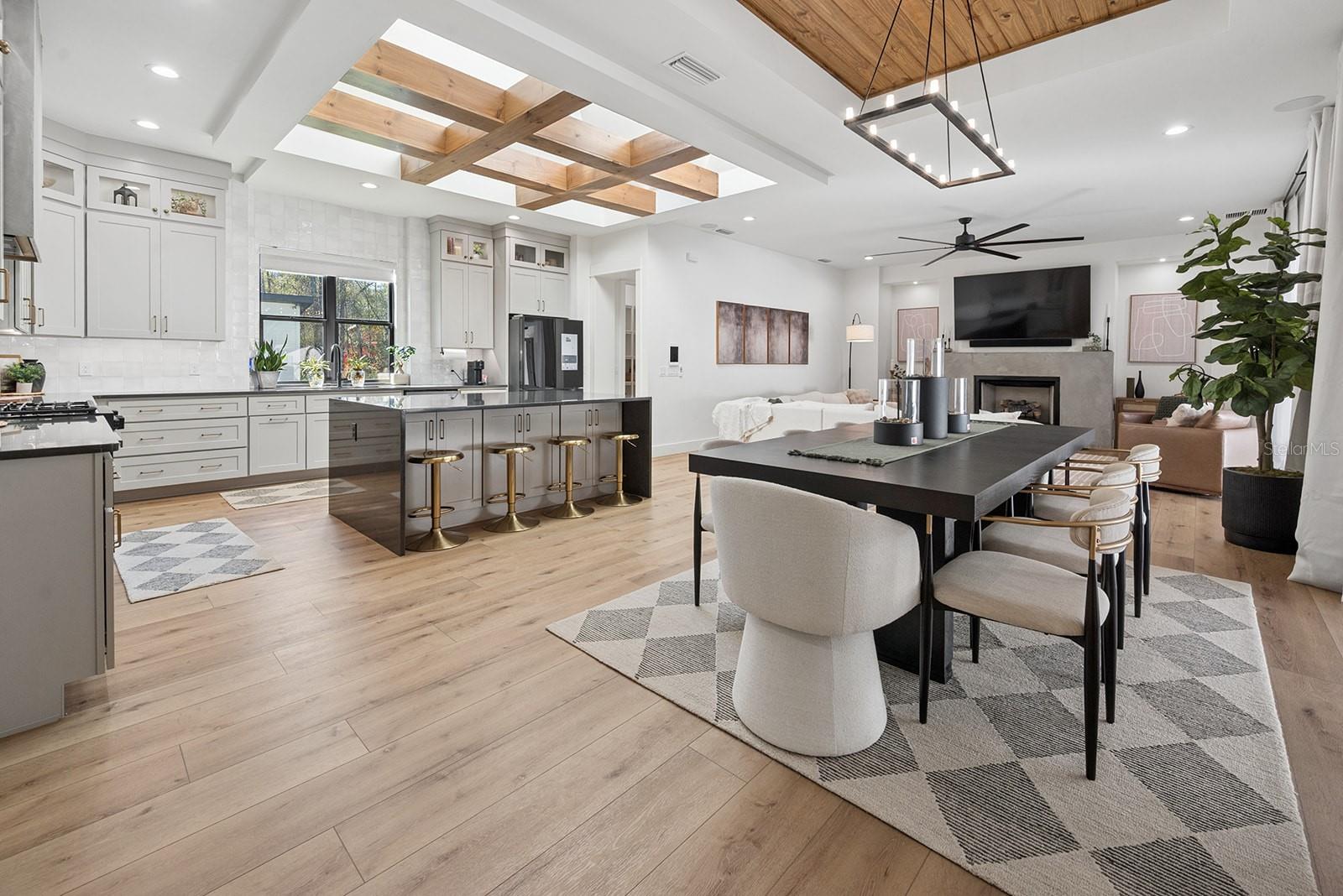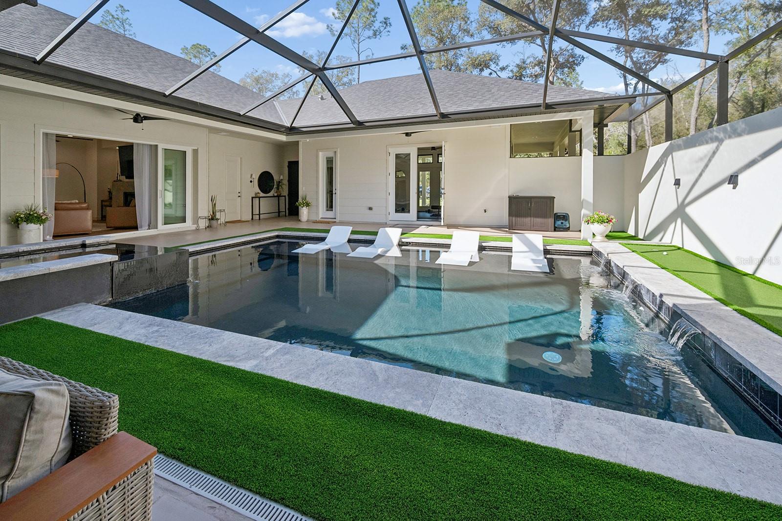Welcome to your private retreat in High Springs, where modern luxury meets peaceful country living on 5 beautifully maintained acres. This stunning 4-bedroom, 3-bath home is tucked behind a gated entrance, offering both privacy and convenience in a highly desirable location. Step inside to an open-concept floor plan designed for both everyday living and entertaining. Expansive sliding glass doors completely open to the pool area, seamlessly blending indoor and outdoor spaces. The kitchen and dining area are truly the heart of the home, featuring a striking glass-enclosed wine display, a large skylight that fills the space with natural light, and gorgeous exposed beams over the island that add warmth and character. The living room offers a cozy gas fireplace, creating the perfect space to relax and unwind. The outdoor area is nothing short of exceptional. Enjoy a screened-in pool complete with a built-in hot tub, outdoor shower, and a fully equipped summer kitchen featuring its own fireplace and TV—ideal for hosting gatherings year-round. Whether entertaining guests or enjoying a quiet evening, this space is designed to impress. The spacious primary suite is a true sanctuary, featuring a luxurious soaking tub, dual-head walk-in shower, floating vanities, and an oversized walk-in closet with custom built-in shelving and a large center island for additional storage, all conveniently connected to the laundry room. Automatic blinds and a whole-home surround sound system enhance comfort and convenience throughout the home and pool area. Additional upgrades include a whole-house generator, a 500-gallon underground propane tank, and an automatic irrigation system, ensuring both efficiency and peace of mind. Every detail of this home has been thoughtfully designed and upgraded to offer a perfect blend of style, comfort, and functionality. This one-of-a-kind property offers the best of Florida living—space, privacy, and high-end finishes—all in a prime location
