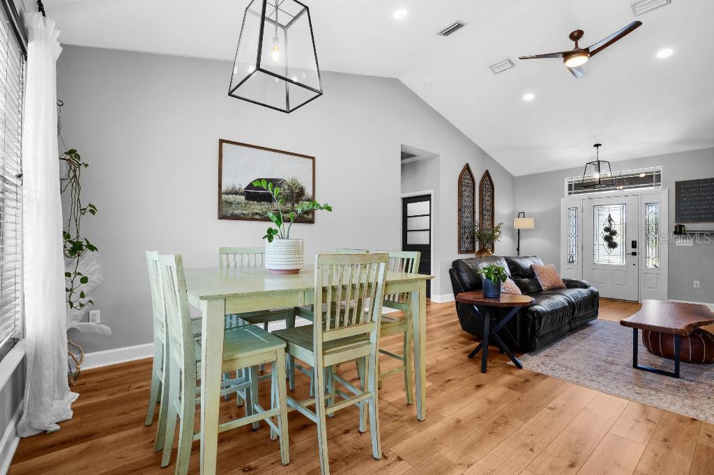 This beautifully updated 3-bedroom, 2-bathroom home is move-in ready and full of modern touches! From the moment you walk in, it just feels like home. Inside, you'll love the 9-foot ceilings throughout, with soaring vaulted ceilings in the living room and primary bedroom, creating a bright and open feel. Recent upgrades include a brand NEW ROOF (2025), 3.5-ton HVAC system (2022), garage enclosure perfect for a second living room or man cave, new flooring throughout, a spacious pantry, and a full exterior repaint in 2021. The kitchen is a standout with its fresh backsplash, ample storage, window above the sink overlooking the adorable back porch, and a cozy island with extra seating. The new lighting and plumbing fixtures give the home a fresh, stylish feel. Outdoor living is a breeze with an extended driveway, concrete side patio, and rear patio—perfect for gatherings and summer BBQs. The home is also pre-wired with a 50-amp generator hookup for peace of mind. Located in a walkable, bike-friendly neighborhood just minutes from top-rated schools, local springs and rivers, downtown High Springs, I-75, colleges, and hospitals, this home offers the perfect blend of comfort, style, and convenience.