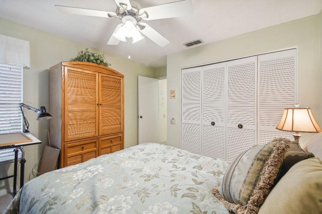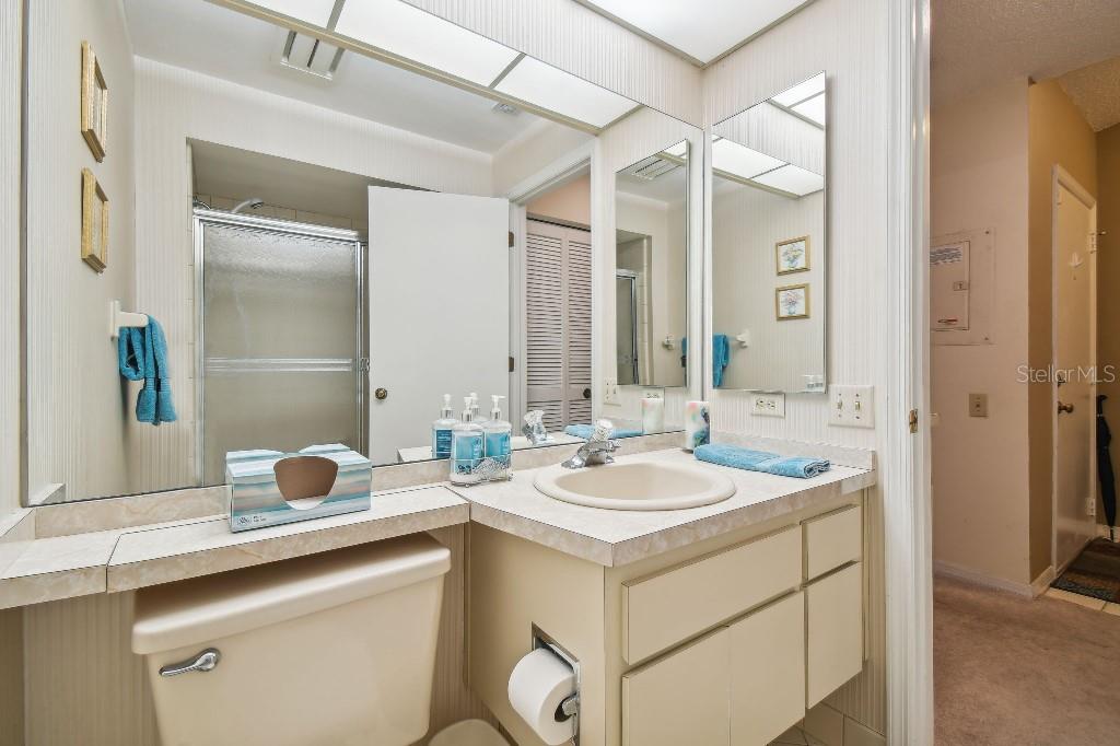 A MUST SEE spacious 2/2 condo located in the beautiful live oak tree setting of Edgewood at Gulf Trace. The 1232 sq ft open floor plan boasts a large master bedroom with walk in closet and full bath with shower, a 2nd bedroom with another full bath with tub, eat in kitchen with bar pass through to the large great room with space for a formal dining area and large comfortable seating area. The high vaulted ceilings help to make the space feel large and inviting. Washer and dryer are included in a laundry closet with plenty of storage shelving. All appliances are included. Cool off in the beautiful community pool and enjoy cooler evenings on the screened porch with fan and skylights. The unit includes one assigned carport parking space and plenty of guest parking nearby. Exterior is maintained by the HOA and the roof has been replaced within the last year. Make an appointment TODAY. This won't last long!!!