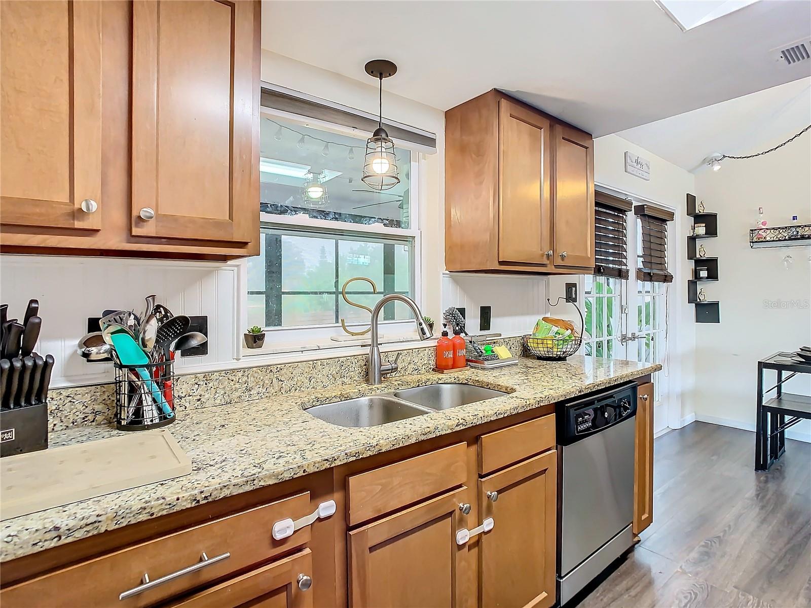 Welcome to your new haven! This delightful single-family home offers 872 sq ft Featuring 2 bedrooms and 1 bath, and 1 car garage, this residence combines functionality with a touch of elegance. The house have a inviting and open floor plan with vaulted celling, dining room with French door leading to enclosed lanai over looking the lake, A sunlit retreat perfect for relaxation or entertaining, with expansive windows that invite the outdoors in. When weather is nice, you can step out to your deck, enjoy your morning coffee or unwind in the evening while overlooking a picturesque lake view. The deck is ideal for outdoor gatherings or quiet moments of reflection. Kitchen features, updated cabinets, Granite counter tops and stainless steel appliances. This home offers a tranquil escape while remaining conveniently close to local amenities, dining and shopping. Don't miss this opportunity to own a piece of paradise with stunning water views and charming living spaces and best of all Not in a Flood Zone!