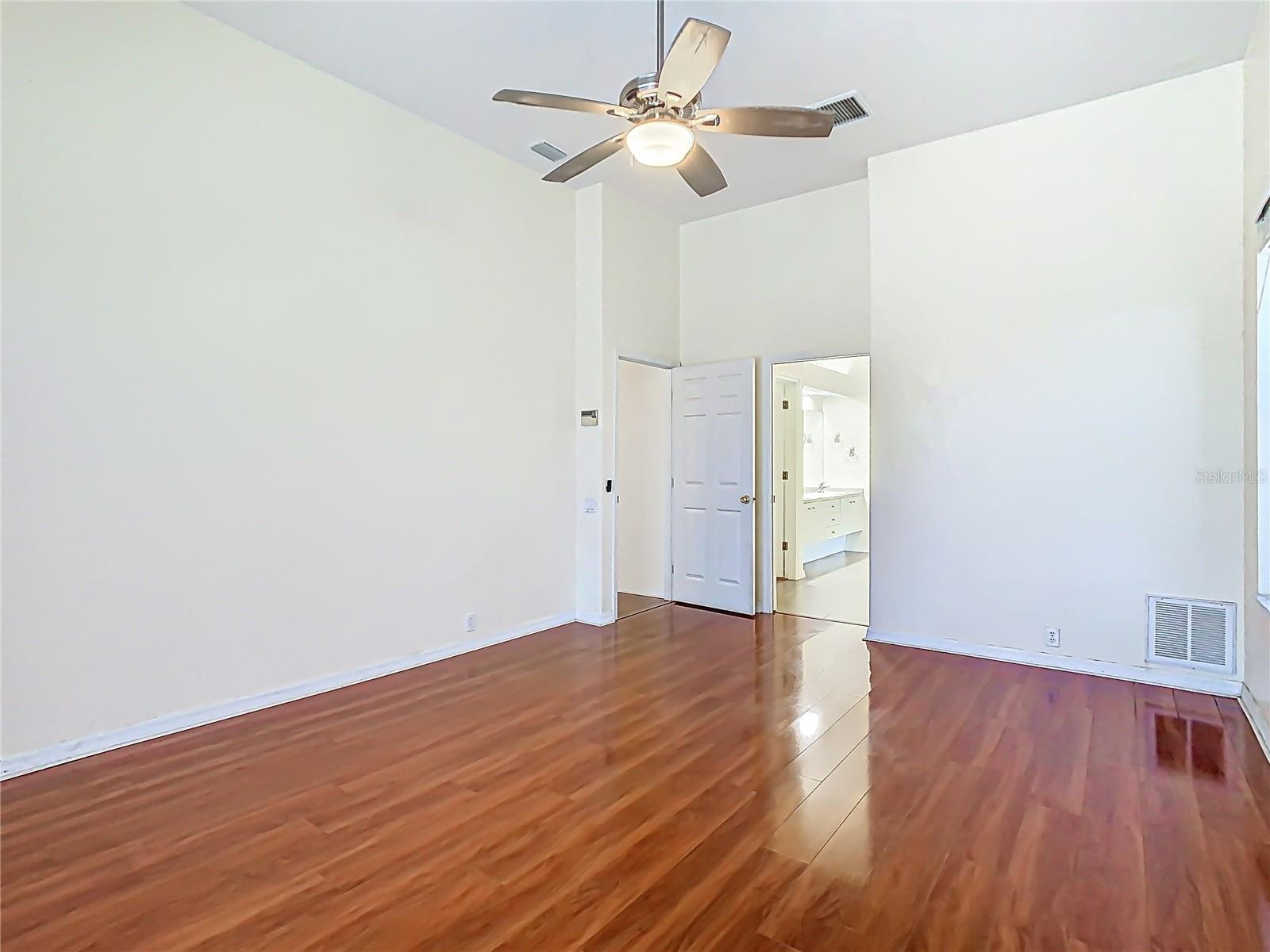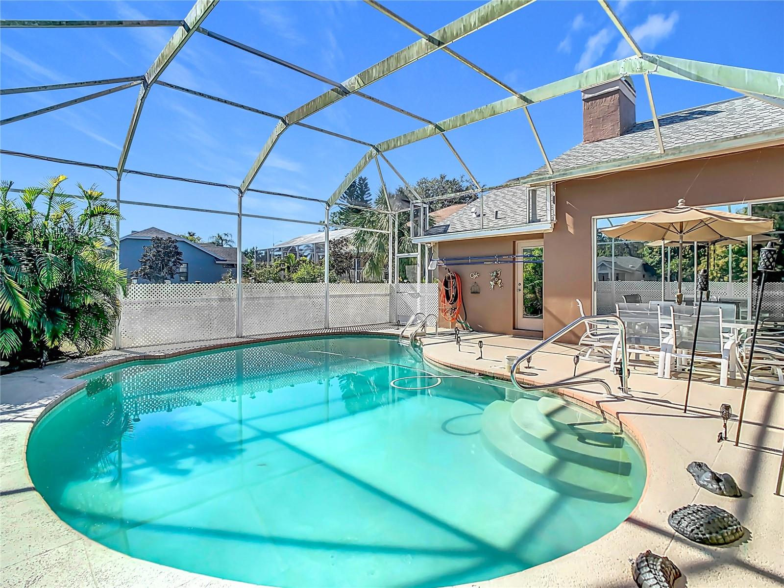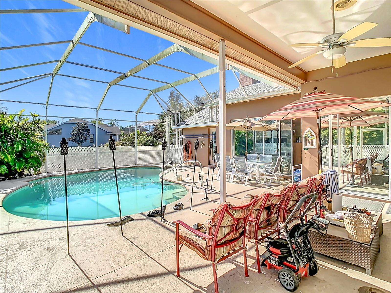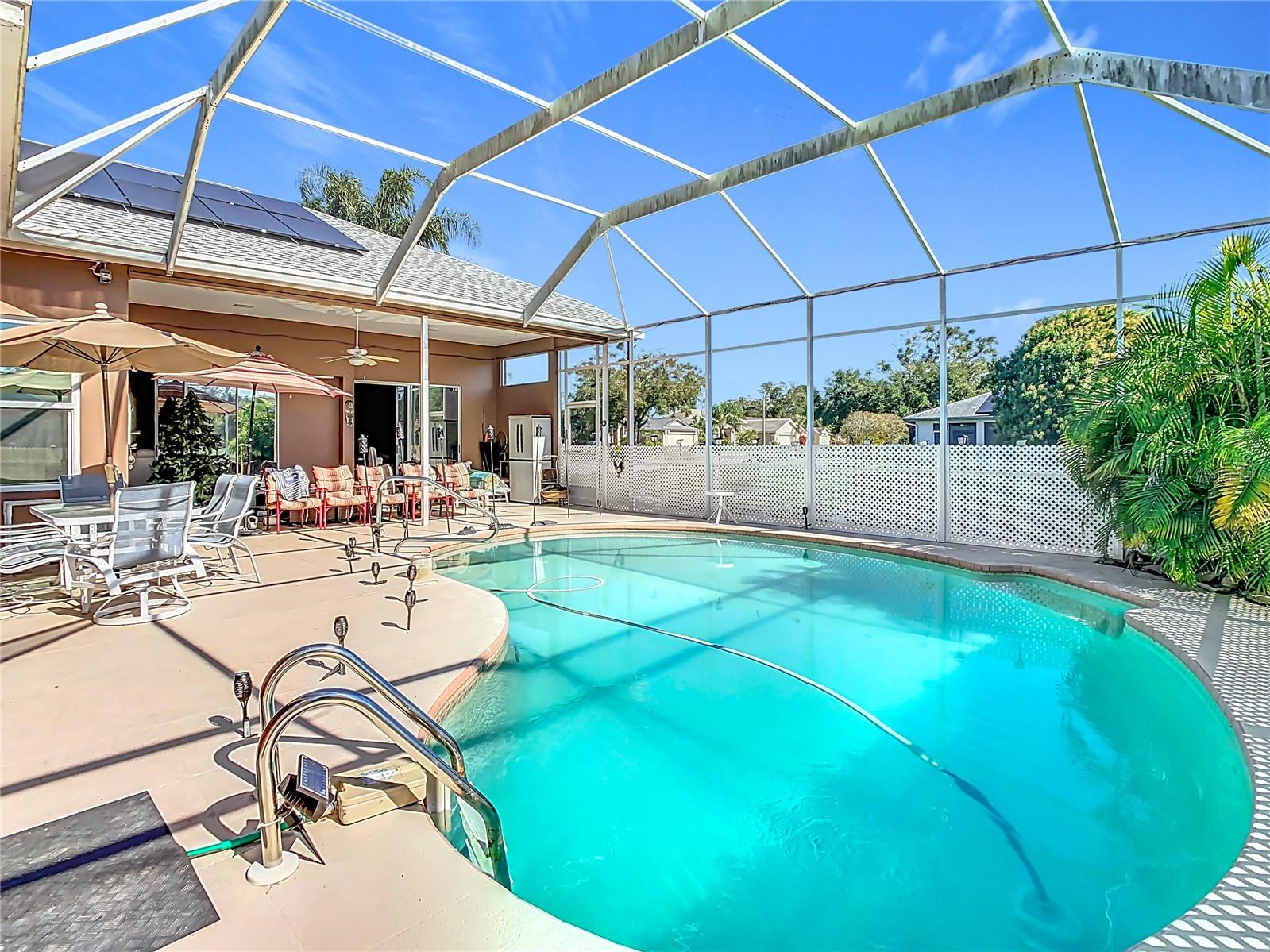 This spacious 4 bedroom, 3 bath, pool home sits on a lot overlooking a large tranquil pond with an abundance of wildlife and nature's beauty. This home has new solar panels that will be paid off in full at closing, and an Electric Vehicle charging station already installed! The double door entry leads to a three way split floor plan with high ceilings throughout. The view of the pool and pond is visible through the large sliding glass doors from the master bedroom, living room, dinette, kitchen, and family room. The family room features a wood-burning/gas fireplace for those cozy evenings. The master bedroom suite sits off the open living dining area. You will be delighted with the over-sized walk in closet and adjoining master bath with double vanities, walk-in shower, and large walk in shower. The rear bathroom doubles as a pool bath. This home has it all! Come and see it before it is gone!
