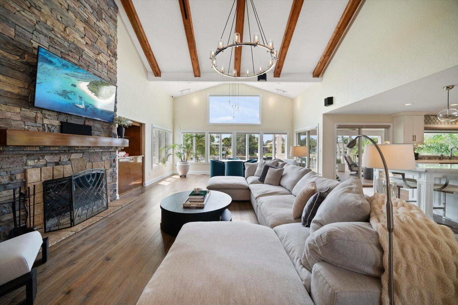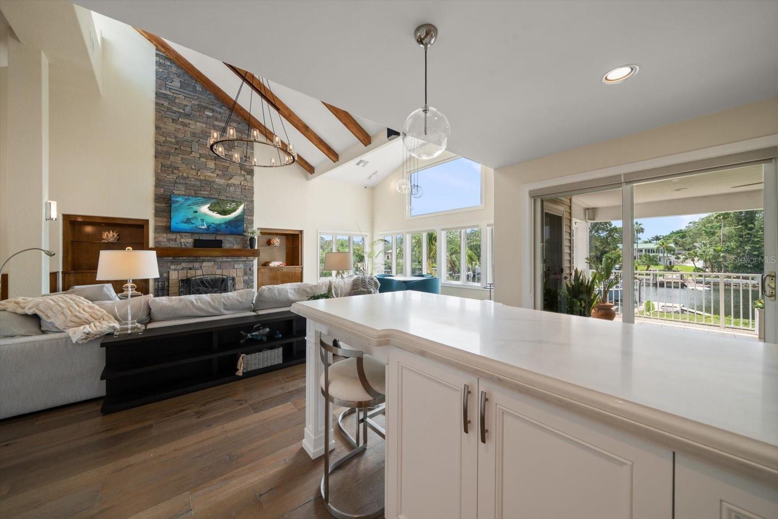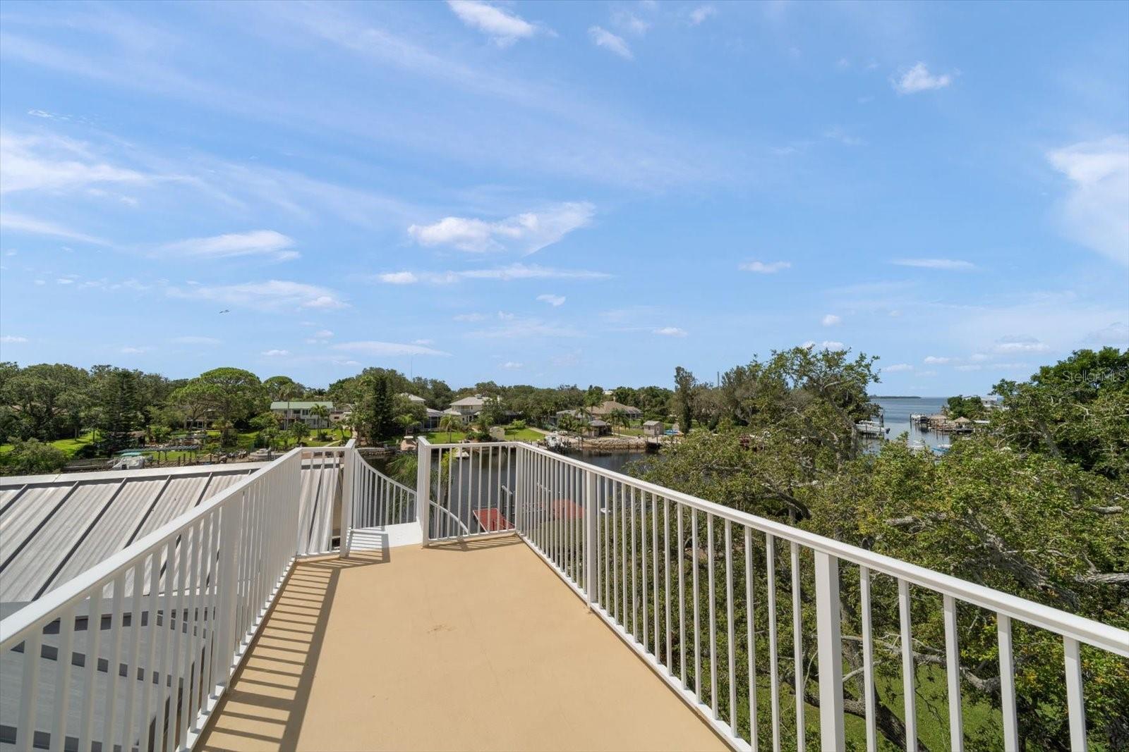 Spectacular waterfront living in the highly sought-after Bailey’s Bluff community! REMODELED in 2020, this stunning 3-bedroom, 2-bath elevated home offers 2,723 square feet of refined coastal living with panoramic water views throughout and 75 feet of deep-water frontage with direct access to the Gulf. This property embraces the ultimate boating lifestyle with a large private composite dock, a 16,000 lb Neptune boat lift, jet ski dock with lift, and quick access to world-class fishing, and open Gulf waters. From the moment you arrive, the elegant paver drive flanked by lighted pillars welcomes you home, with lush manicured landscaping, &stunning curb appeal. Step up to the charming covered front balcony and through double glass doors into the stunning open-concept living space. Soaring 21’ vaulted ceilings with wood beams, a wood-burning fireplace, gorgeous hardwood floors, crown molding, 5 1/2" baseboards, and abundant natural light create a warm and elevated coastal aesthetic. The living areas flow seamlessly, with sliding glass doors opening to a covered balcony overlooking lush landscaping and sparkling waters. The kitchen is a true showpiece, featuring GE Monogram stainless steel appliances, a gas cooktop with stainless hood, quartz countertops, soft-close custom cabinetry, and an impressive 13-foot island with bar seating, pendant lighting, and wine refrigerator, a tile backsplash, and a farm sink positioned under a picture window with endless water views make this a dream for both entertaining and everyday living. A split floor plan provides privacy and functionality. On the main level, two generously sized bedrooms include custom closets, and one features 10-foot vaulted ceilings. They share a beautifully remodeled hall bath with granite countertops, wood cabinetry, and a tile-and-glass step-in shower with bench seating. A spacious laundry room with granite counters and soft-close cabinetry offers additional storage Upstairs, the cozy loft overlooks the main level & opens to a private balcony. The primary suite is a private sanctuary with a glass door leading to an expansive L-shaped wraparound balcony. From here, a spiral staircase leads to an upper observation deck offering breathtaking panoramic water views. The en suite bath is a spa-like retreat with granite counters, dual sinks, a built-in vanity, a jetted soaking tub with ocean views, and a luxurious shower room with body jets. A custom walk-in closet/dressing room, accessed through a pocket door, provides exceptional storage and organization. The ground level features a 3-car garage with space for all your toys, tools, and storage needs. A bonus room at the rear of the garage is perfect for a home gym, office, or family room with French doors leading out to the covered lanai. This home offers expansive outdoor living spaces at every turn. The fully fenced backyard is lush, tropical, and tranquil, with a private walkway leading to the dock and boat lift. The lot offers ample room for a future pool, expanding your outdoor living potential. Located just a short drive to nearby parks, Gulf beaches, and the charming town of Tarpon Springs with its vibrant shops and dining, this home delivers the very best of the Florida lifestyle. This spectacular home blends comfort, craftsmanship, and waterborne adventure into one unforgettable property. An optional Baileys Bluff Civic Assoc. membership is just $100 year, providing to a private beach, boat ramp, & clubhouse.