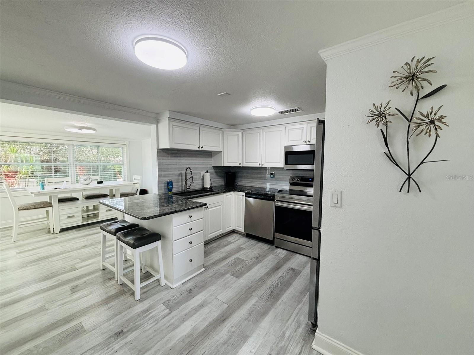 Welcome Home! This beautifully updated pool home features two bedrooms, one bathroom, and a layout designed for easy living. Step inside to a spacious living room with newly installed laminate flooring and abundant natural light. The custom kitchen offers modern charm with stylish cabinetry, stainless steel appliances, and a convenient breakfast bar. Enjoy meals in the adjoining dining area, or take the gathering outdoors to the screened-in porch where you can relax in the fresh breeze. A versatile den/office space provides additional comfort and flexibility to suit your lifestyle. Attention to detail shines throughout with custom moldings and thoughtful finishes. The screened-in pool area is a true highlight—complete with color-changing lights and a tranquil waterfall, it’s perfect for both relaxing and entertaining. Beyond the lanai, the fully fenced yard offers privacy, mature landscaping, and plenty of space to enjoy the outdoors. This home combines comfort, style, and functionality—ready for you to move in and enjoy. 2020 Roof, 2024 Water Heater