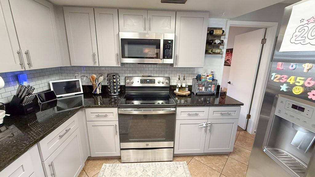 Welcome to this beautifully updated 2-bedroom, 2-bath, 2-car garage home offering 1,184 square feet of comfortable living space in desirable Aloha Gardens! From the moment you arrive, you’ll appreciate the widened concrete driveway, front storm door, and fresh curb appeal. Inside, this well-maintained home features a desirable split bedroom floor plan, fresh interior paint, newer doorknobs and deadbolts, tile flooring throughout the main living areas, ceiling fans and updated lighting in most rooms. The stylish kitchen is sure to impress with grey shaker cabinetry, granite countertops, a stainless undermount sink, grey subway tile backsplash, and stainless steel appliances. Recent updates include a new microwave (2025), new dishwasher (2026), and new garbage disposal (2025) — making this kitchen as functional as it is attractive. The spacious primary suite easily accommodates a full furniture set and features charming barn doors leading to the walk-in closet and private bath. The primary bathroom was beautifully updated in 2025 with a new vanity and sink, toilet, lighting, mirror, removal of the medicine cabinet, and fresh glazing for a clean, modern feel. On the opposite side of the home, you’ll find a huge secondary bedroom and a fully updated guest bathroom (2025) with matching upgrades including vanity, sink, toilet, lighting, mirror, medicine cabinet removal, and glazing. A standout feature is the large rear flex room, perfect for a home office, den, living area, hobby space, or whatever suits your lifestyle. Step outside to enjoy the expansive screened rear porch overlooking a fully fenced backyard with new fencing installed in December 2024 — ideal for pets, entertaining, or simply relaxing outdoors. Additional major updates include new A/C (September 2020), new water heater (May 2020), several windows replaced (2021). The garage offers excellent functionality with a side utility door, laundry tub, in-wall auxiliary A/C unit, and pull-down attic ladder for added storage. This move-in-ready home combines thoughtful updates, flexible living space, and a fantastic location. Schedule your private showing today!