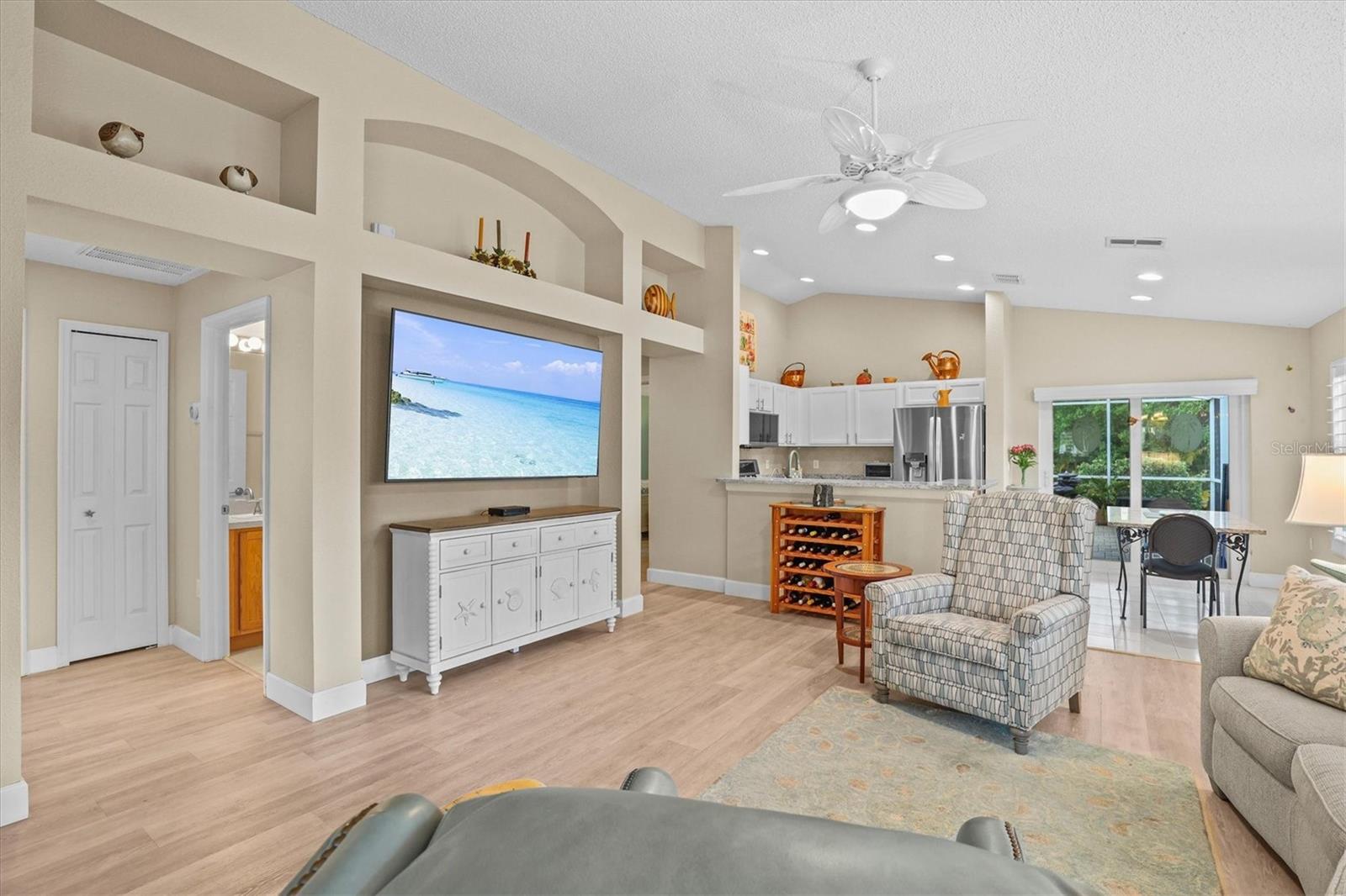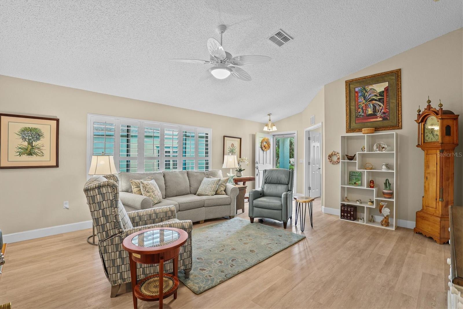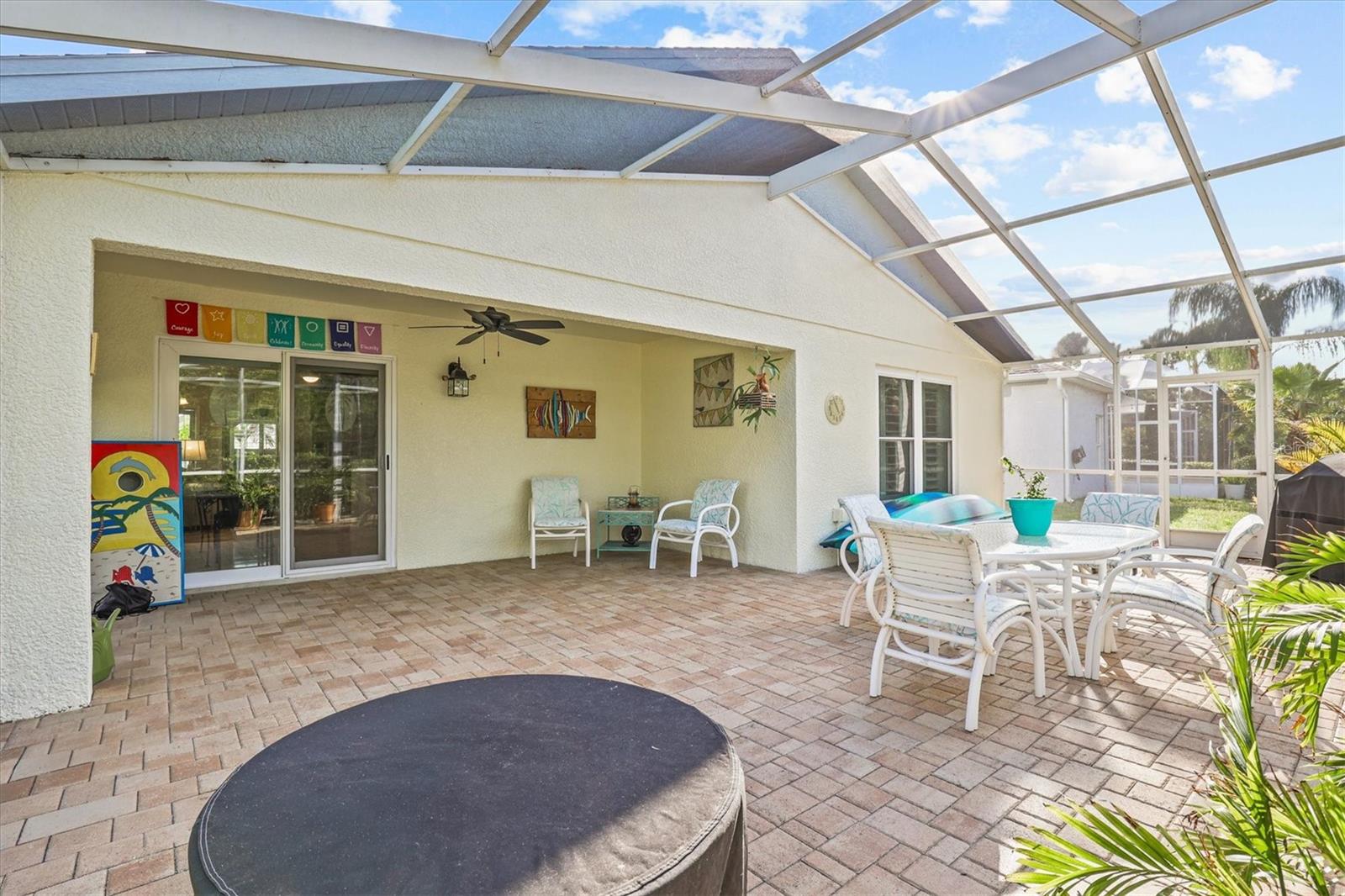 Located within the 55+ area of the beautiful Key Vista gated community, this move-in-ready villa radiates pride of ownership through extensive upgrades and a cheerful, sun-drenched layout. The open floor plan features high ceilings, architectural niches, and brand-new luxury vinyl plank flooring complemented by fresh paint and elegant plantation shutters throughout. At the heart of the home, the kitchen boasts wood cabinetry, granite countertops, and newer stainless steel appliances, including a breakfast bar and a delightful dinette area. This space opens to a large, screened-in lanai with upgraded "no-see-um" screens and a pavered floor, offering a tranquil view of a serene pond and lush landscaping with no rear neighbors for ultimate privacy. The thoughtful design includes a split-bedroom layout for maximum comfort, along with a versatile den that can easily serve as a third bedroom or home office. For added convenience, the villa includes an indoor laundry room and a two-car garage. Living here means enjoying a maintenance-free lifestyle where the HOA covers exterior painting, cable, internet, and access to resort-style amenities. Residents can take advantage of two clubhouses, heated pools and spas, a fitness center, tennis and volleyball courts, and a playground, all within a beautifully manicured environment that even offers on-site storage for boats and RVs. The location is a true standout for outdoor enthusiasts, situated within a short walking distance of the Gulf of Mexico and the Key Vista Nature Park. You are just moments away from the Key Vista Waterfront Gulf Park, which offers a swimming area, kayak access, a 24-hour fishing pier, and miles of walking and bike trails. With the historic Tarpon Springs Sponge Docks, local marinas, and boat ramps at Anclote River Beach Park nearby, this home provides the perfect gateway to Florida's coastal lifestyle. NO FLOOD INSURANCE REQUIRED, NO CCD FEE, roof 2022, THE SOLAR PANELS WILL GIVE YOU AN IMMEDIATE SAVINGS AT ABOUT $100 A MONTH.