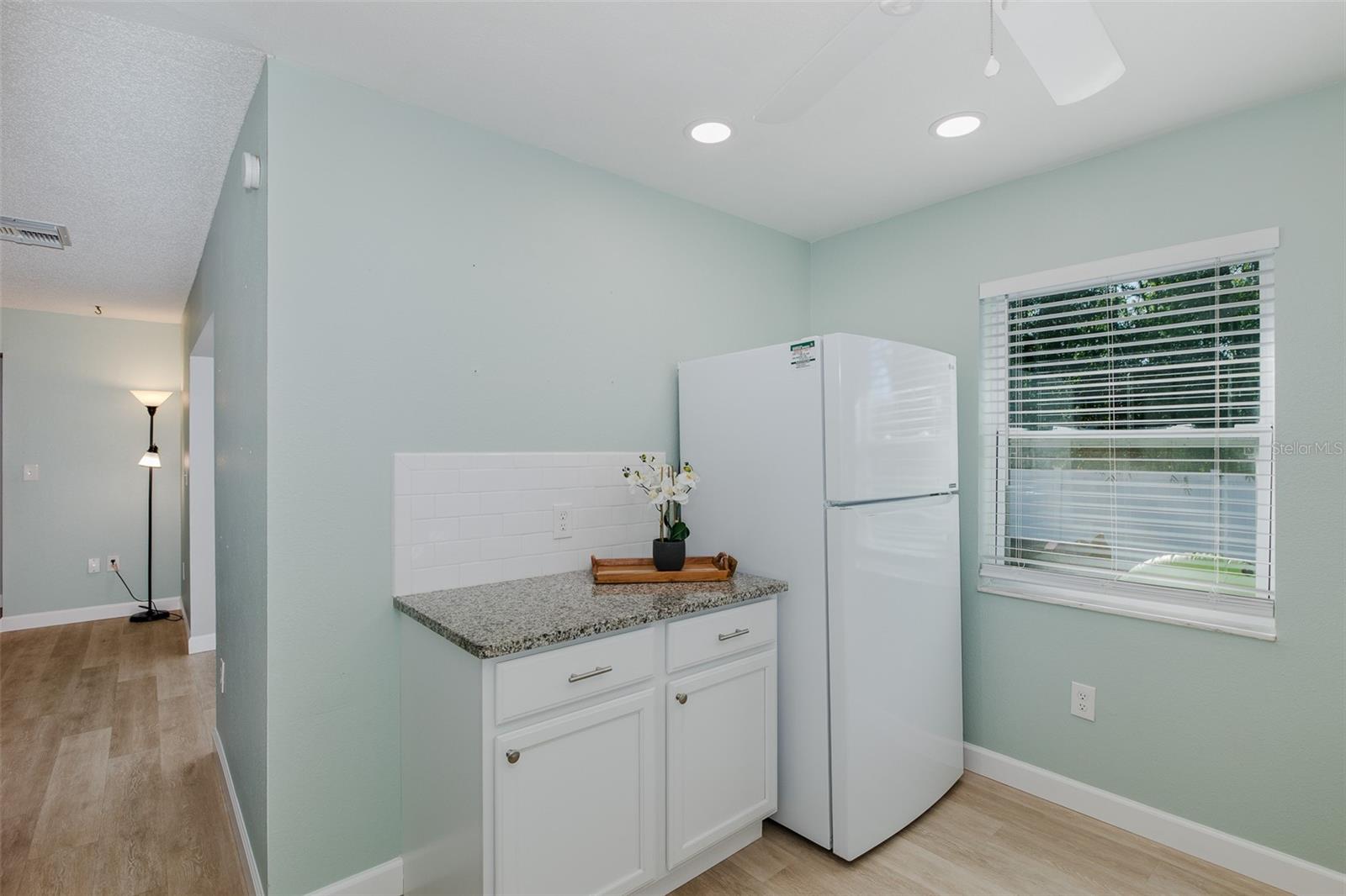 One or more photo(s) has been virtually staged. Welcome to this updated and move-in-ready 2-bedroom, 1-bath home with a 1-car garage. Offering a functional layout and modern finishes throughout. The home sits slightly elevated, providing added peace of mind and enhanced curb appeal. Features a screened-in front porch—perfect for enjoying morning coffee or evening breezes. The bright, open living room features luxury vinyl plank flooring, fresh neutral paint, and ceiling fans, creating a comfortable and inviting space. The updated kitchen includes white cabinetry, granite countertops, tile backsplash, and a complete appliance package, ideal for everyday living or entertaining. Both bedrooms are generously sized with ample natural light, and the renovated bathroom showcases modern tilework, a tub/shower combination, and an updated vanity. A bonus flex space offers the perfect opportunity for a home office, hobby room, or additional seating area. Enjoy outdoor living in the fully fenced backyard, complete with a concrete patio—ideal for grilling, relaxing, or entertaining. Additional highlights include an attached garage with laundry access! Short drive to Fred Howard Beach, Tampa airport, shopping, dining, schools, and major roadways, this home offers comfort, functionality, and value.