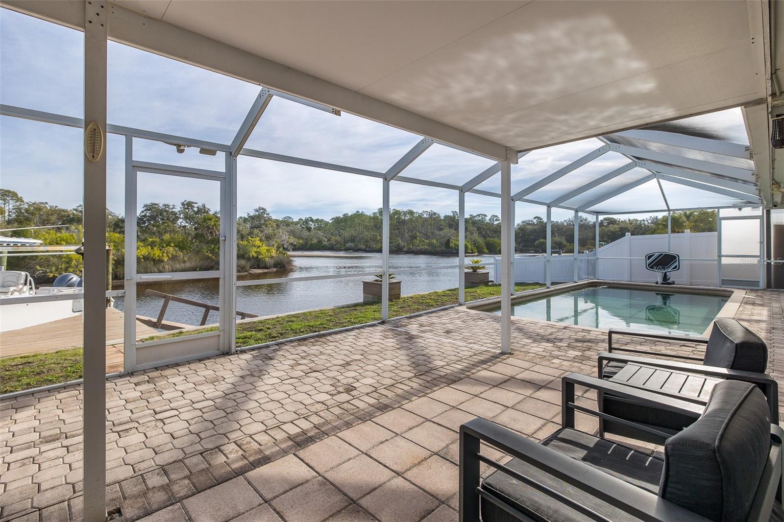 Stunning fully remodeled 4-bedroom, 3-bath waterfront home offering privacy, functionality, and true Gulf-access living. This exceptional property has remained high and dry with no flooding during recent storms, providing peace of mind along with an unbeatable natural setting. Set along a scenic bend of the river, the backyard overlooks a private island preserve—meaning no rear neighbors, just nature. Dolphins, manatees, and a wide variety of birds are frequent visitors, creating a tranquil waterfront backdrop rarely found. The thoughtfully designed split floorplan features two complete en suites located on opposite sides of the home, ideal for multigenerational living, guests, or added privacy. The home has been meticulously maintained and extensively upgraded. Outdoor & Waterfront Features include: 10,000 lb boat lift with dock Heated chlorine pool with new variable-speed pool pump (2024) New pool heat pump (2024) Gravity overflow pool drain to prevent overfilling New stainless steel boat lift cables (2025) Interior & Systems Upgrades: Brand-new kitchen with ventless hood, microwave, dishwasher (2026), refrigerator, and stove (2025) Moen motion-sensor kitchen faucet with WiFi/app control (2025) Propane tankless hot water heater on demand (2025) Additional electric on-demand water heater available (can be reconnected) Whole-home 5-stage Halo water treatment system (2025) Entire home repiped with Uponor PEX water lines (2025) Efficiency, Safety & Storm Readiness: Generator-ready electrical setup EV charging outlet in garage Commercial-grade garage door opener and fully rebuilt garage door (springs, rollers, hinges – 2025) Electrical panel installed 2018 Roof (2018) Air handler and heat pump (2018) Additional blown-in attic insulation (2025) New doors and windows (2025) Additional Features: New 4-zone front yard sprinkler system with WiFi-controlled pump (private well water – 2025) ADT security system with fire and carbon monoxide detection Nest Ring doorbell and garage camera convey This home offers true waterfront privacy, modern systems, and extensive upgrades, making it ideal for full-time living or a refined coastal retreat with direct Gulf access.