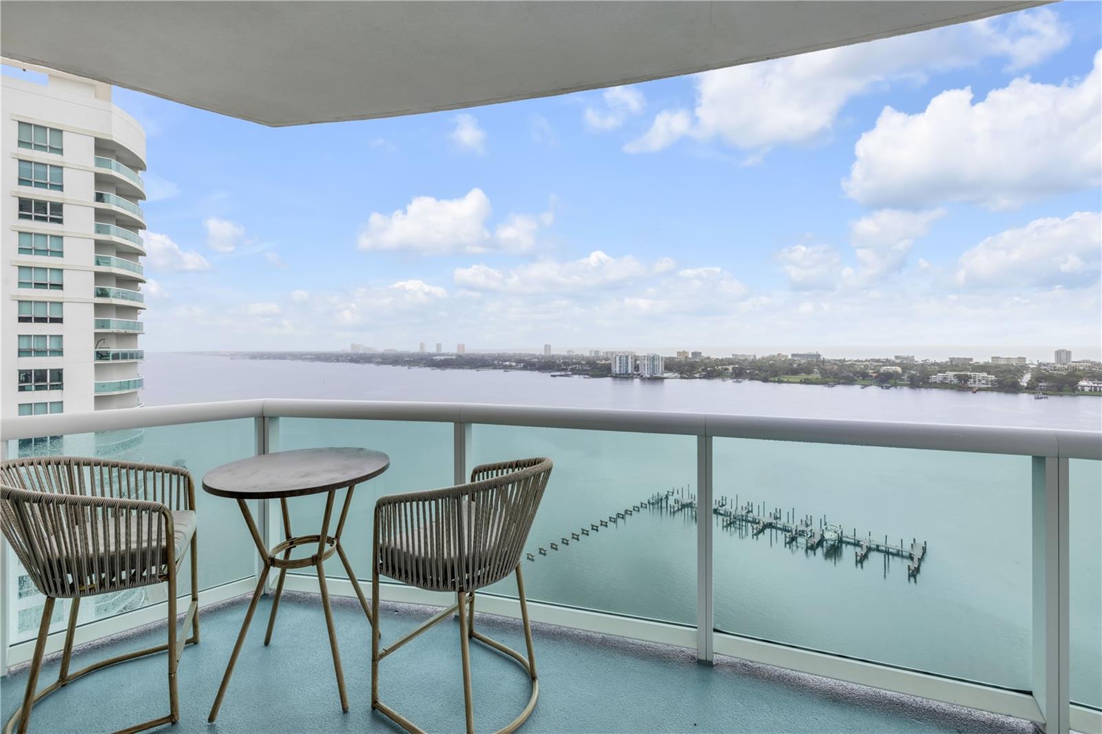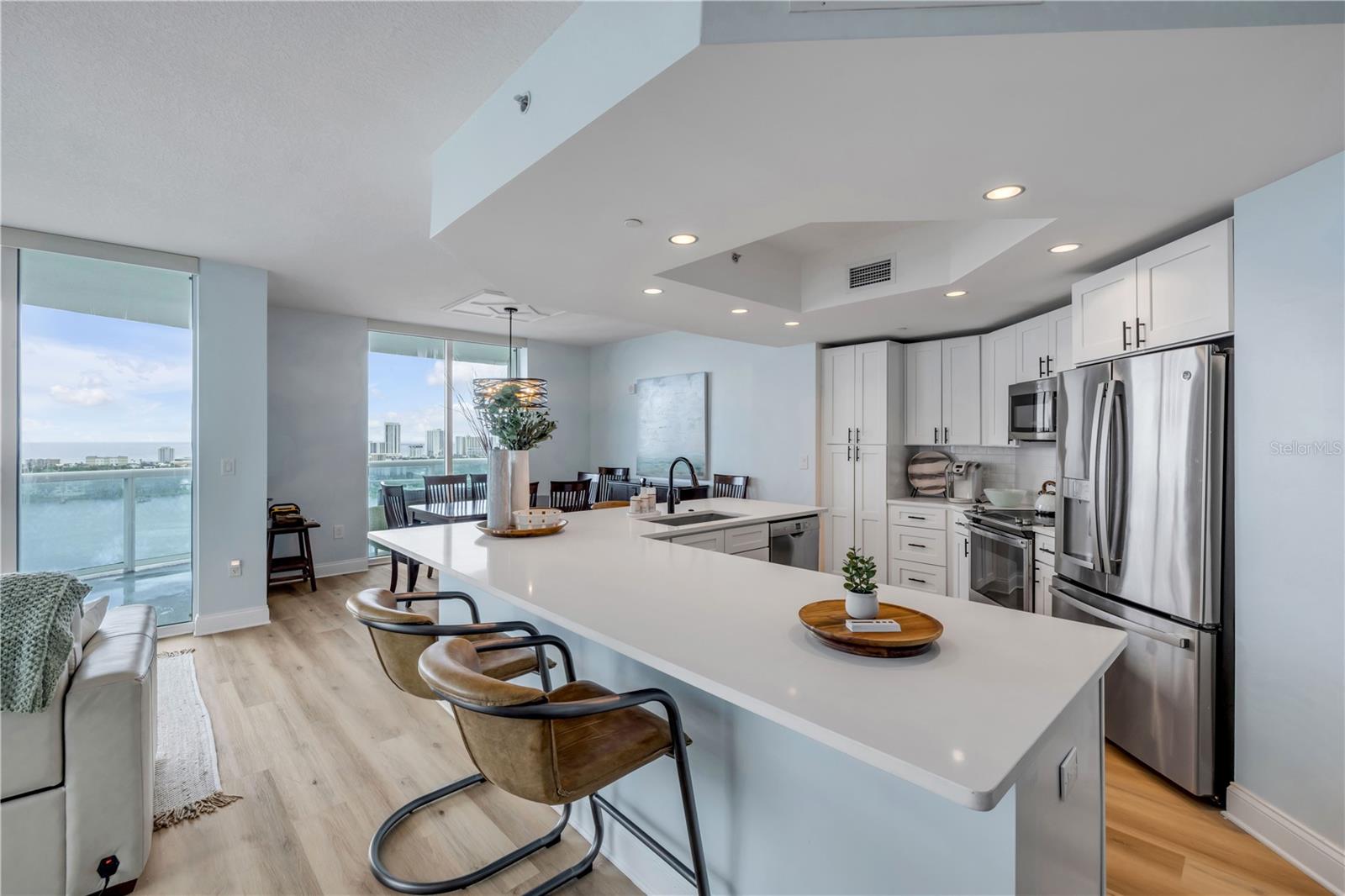 Discover refined coastal living high above the Halifax River in this fully furnished, move-in-ready residence at Marina Grande. Perched on the 20th floor, this corner unit showcases panoramic views of the Intracoastal Waterway and Atlantic Ocean through walls of glass and from a private balcony perfect for sunrise coffee or evening cocktails. The thoughtfully updated interior features wide-plank luxury vinyl floors, quartz surfaces, shaker cabinetry, and GE stainless appliances, complemented by fresh paint, designer window treatments, and stylish décor throughout. A smart split-bedroom plan enhances privacy, while soaring ceilings and generous closets add comfort and function. Set within a secure, gated 18-acre resort community, residents enjoy two waterfront pools—including an infinity-edge pool—a fitness center, steam rooms, a private theater, and two elegant clubhouses. Pet-friendly and ideally located minutes from beaches, dining, and the Riverfront Esplanade, this turnkey home captures the essence of effortless coastal sophistication.