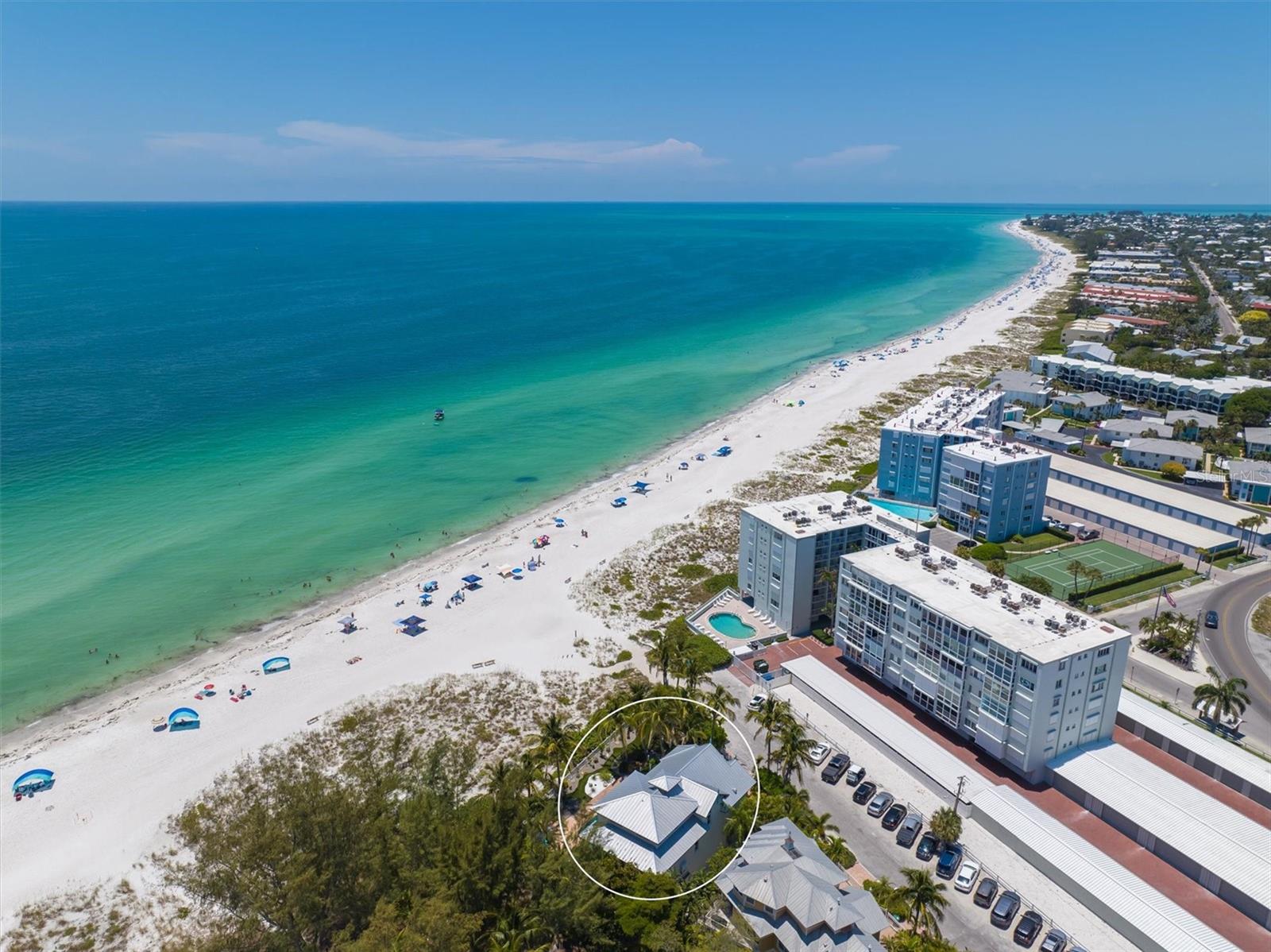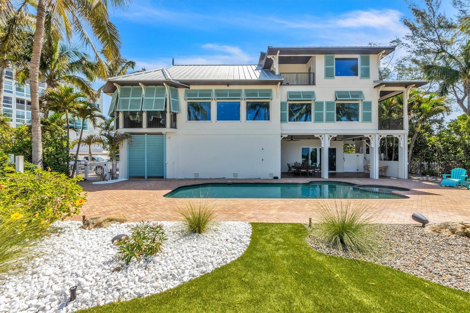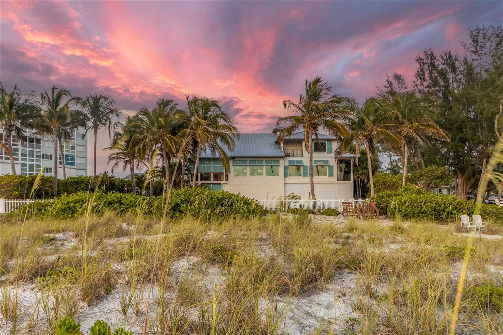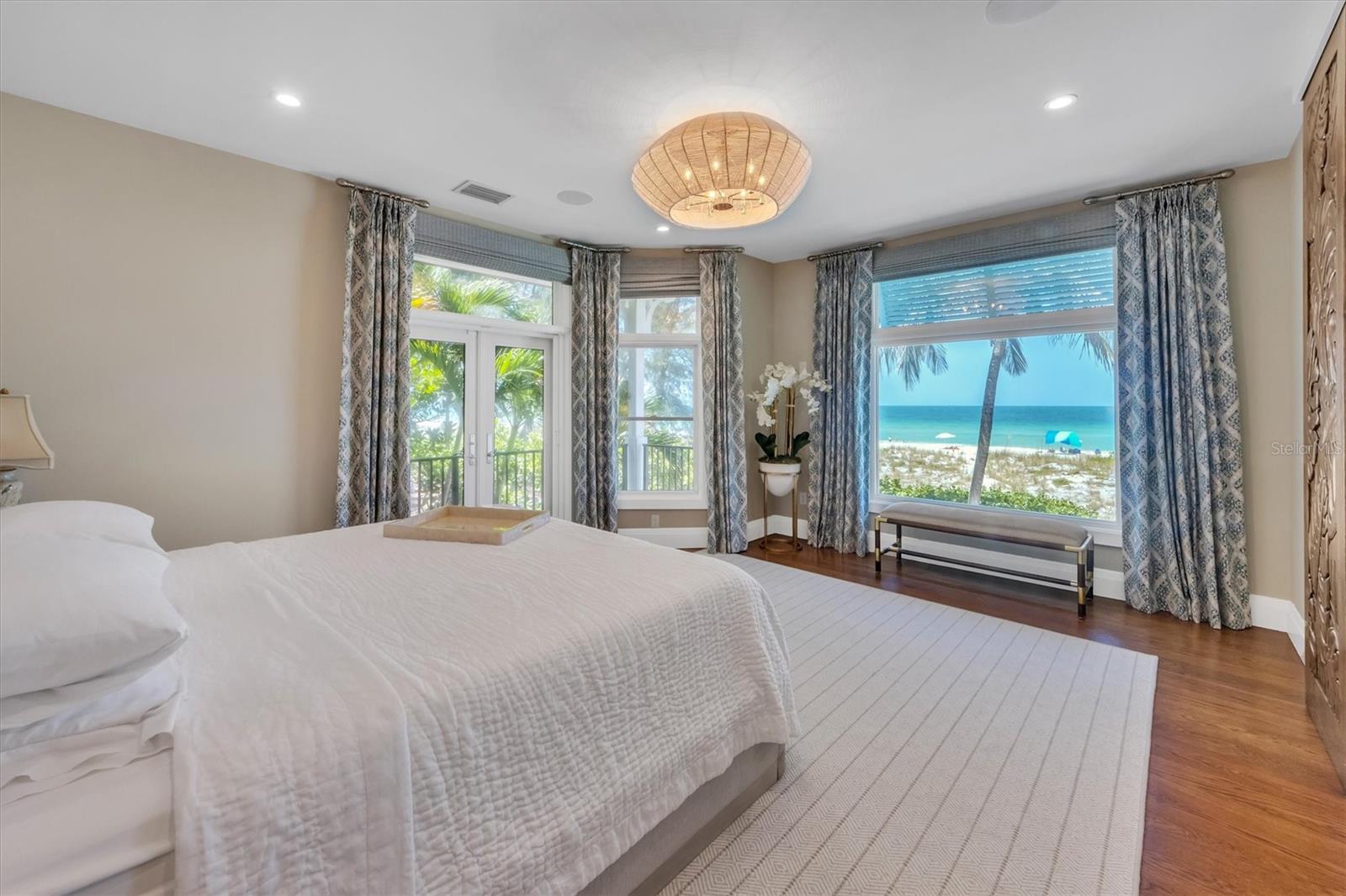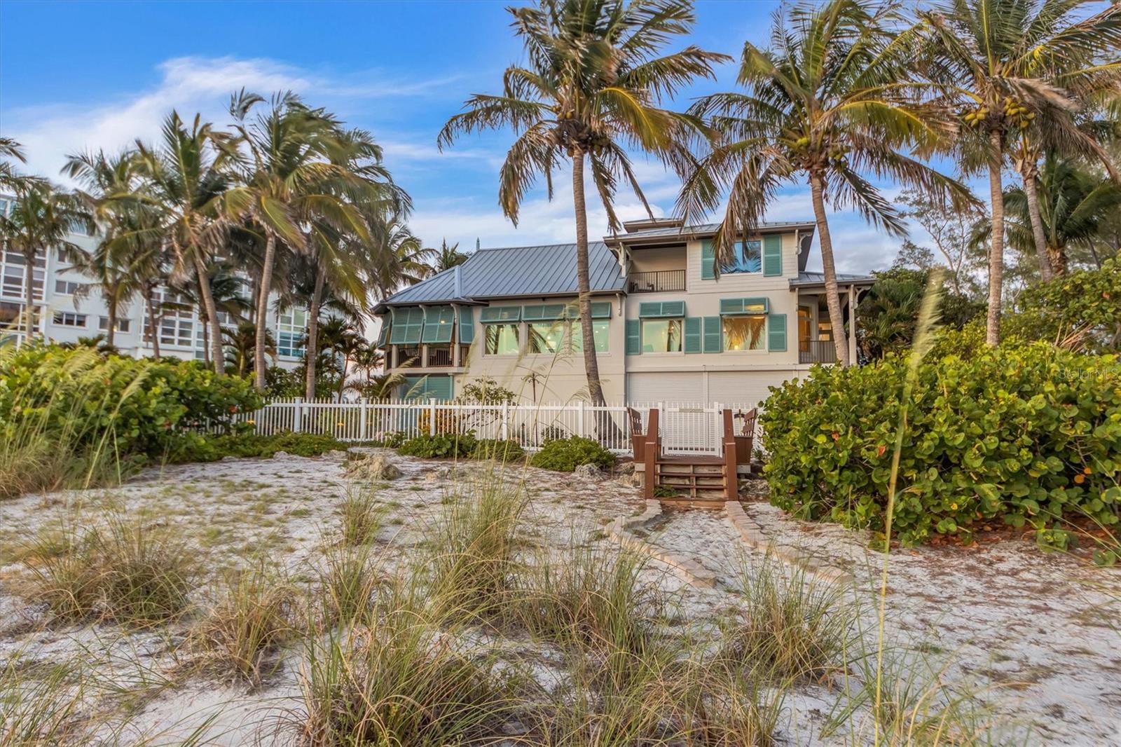LUXURY GULF FRONT!!! Welcome to this Beachfront Paradise like no other! This high-end coastal retreat offers the ultimate in beachfront living. Situated on a sprawling half-acre property, this haven offers 150 feet directly on the Gulf of Mexico beach with stunning views from almost every window! This three bedroom, three and a half elevated home offers the ultimate beachfront living experience, with instant access to the pristine shores of the Gulf of Mexico in your backyard! This exquisite home was built in 2003, the architectural design lends to the Transitional Coastal West Indies-Style Beach Home with the perfect blend of elegance and comfort. Numerous outdoor living areas, covered porches, and an abundance of windows and sliding glass doors with panoramic views of the white sandy beach and spectacular sunsets. Tongue and groove ceilings, Bahama shutters, and a metal roof complete the beach vibe, creating the perfect coastal retreat. Step inside and be captivated by the open floorplan that offers panoramic beachfront views and is appointed with luxurious features, including an elevator, solid oak hardwood floors, and custom draperies complete with Roman shades. The kitchen is a chef's delight, with extensive solid wood inset cabinetry, natural stone countertops, and top-of-the-line appliances including a built-in panel refrigerator and Thermador Professional range with statement range hood. Relax and enjoy the sound system throughout the home so you can enjoy your favorite melodies inside or outside on the covered lanai. The luxurious primary suite on the main floor is accessible through gorgeous solid wood custom hand-carved doors. As you enter you will be delighted by the large window overlooking the white sandy beach along with French doors that lead to a private balcony that overlooks the pristine blue waters. Sit and relax outside as you will surely enjoy the gulf breezes and sunsets year-round. In the primary bathroom, you are sure to take delight in the indoor and outdoor showers. Upstairs are two ensuite guest rooms that offer additional comfort, with several covered balconies to enjoy the soothing sounds of the ocean. Each suite has been carefully designed with coordinating colors and design features that are sure to entice all the senses. The outdoor space is equally impressive, with a sizable, heated saltwater pool and spa, herringbone pavers surrounding the pool, and a beautifully landscaped backyard with lush gardens that are lined with palm trees and tropical flowers. There is low-maintenance artificial grass and a long-lasting rockscape design throughout. Hurricane roll-down shutters provide added security and peace of mind. At night the house transforms into a true retreat with extensive outdoor lighting. Located in the heart of Holmes Beach in Anna Maria Island you are in walking distance to so many shops and restaurants to enjoy. Don't miss this rare opportunity to own a piece of beachfront paradise. Schedule your private showing today!
