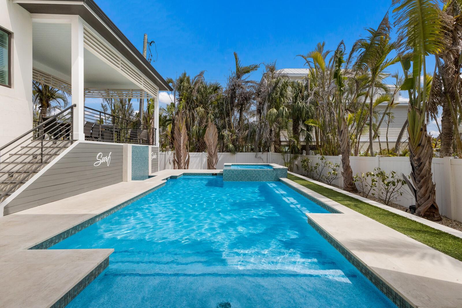 Experience coastal luxury like never before in this 4BD/4.5BA, newly constructed retreat just steps from the pristine sands of Holmes Beach. Designed with both elegance and relaxation in mind, this home is also a proven income-producing property, with reservations already in place, making it an exceptional investment opportunity. The property boasts four spacious en-suite bedrooms, three with private balconies, and a master suite featuring a standalone soaking tub and breathtaking Gulf views. The open-concept living and dining area is drenched in natural light, enhanced by expansive windows and motorized blinds for seamless privacy. At the heart of the home lies a chef's kitchen complete with a quartz waterfall island, high-end gas appliances, a wine bar, and an oversized walk-in pantry. Outside, the landscaped backyard transforms into a private tropical oasis, featuring a heated pool, spa, sheer waterfall, outdoor dining, and a lounge area under a covered cabana deck, all surrounded by lush, low-maintenance turf. A rooftop deck offers stunning Gulf and Bay views, creating the perfect setting to unwind and enjoy breathtaking sunsets. Additional highlights include a circular drive, two-car garage, elevator, laundry room, and bonus space perfect for hosting guests or creating a home gym. Situated just a short stroll from the heart of the island, you’ll discover boutique shopping, charming cafes, and a variety of local restaurants, offering endless opportunities for relaxation and enjoyment. Whether you’re relaxing by the pool, entertaining on the rooftop, or enjoying the benefits of a thriving rental property, this home promises a lifestyle of effortless elegance and unmatched coastal charm.