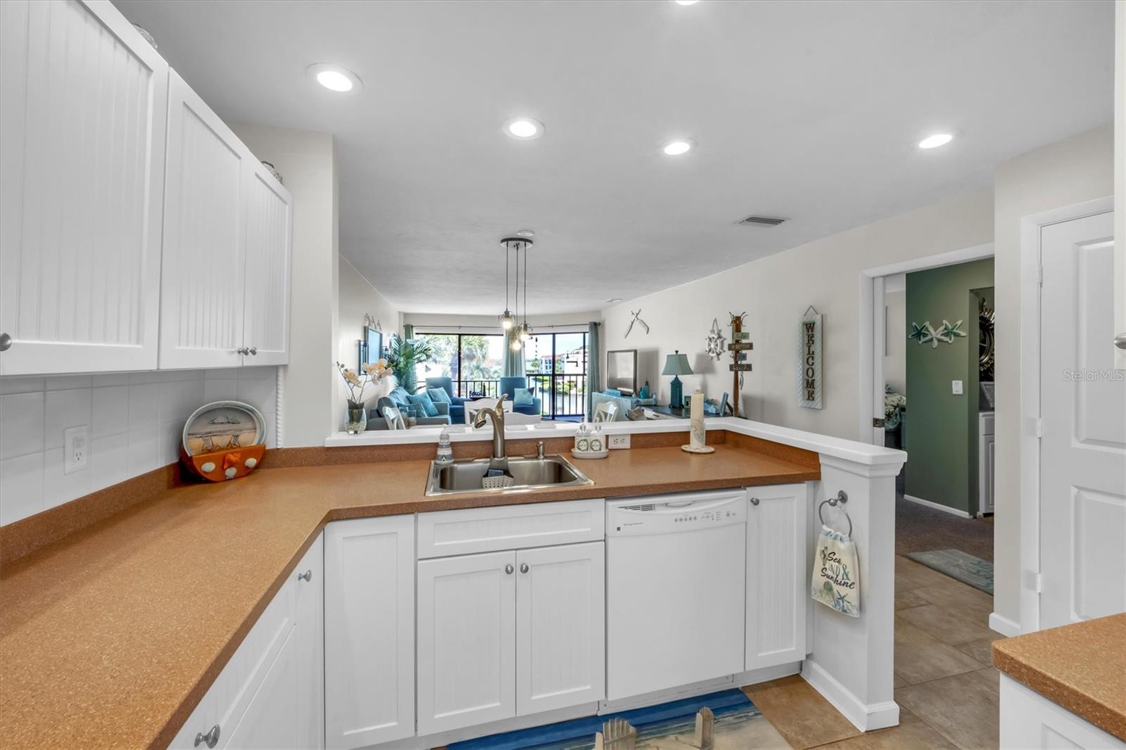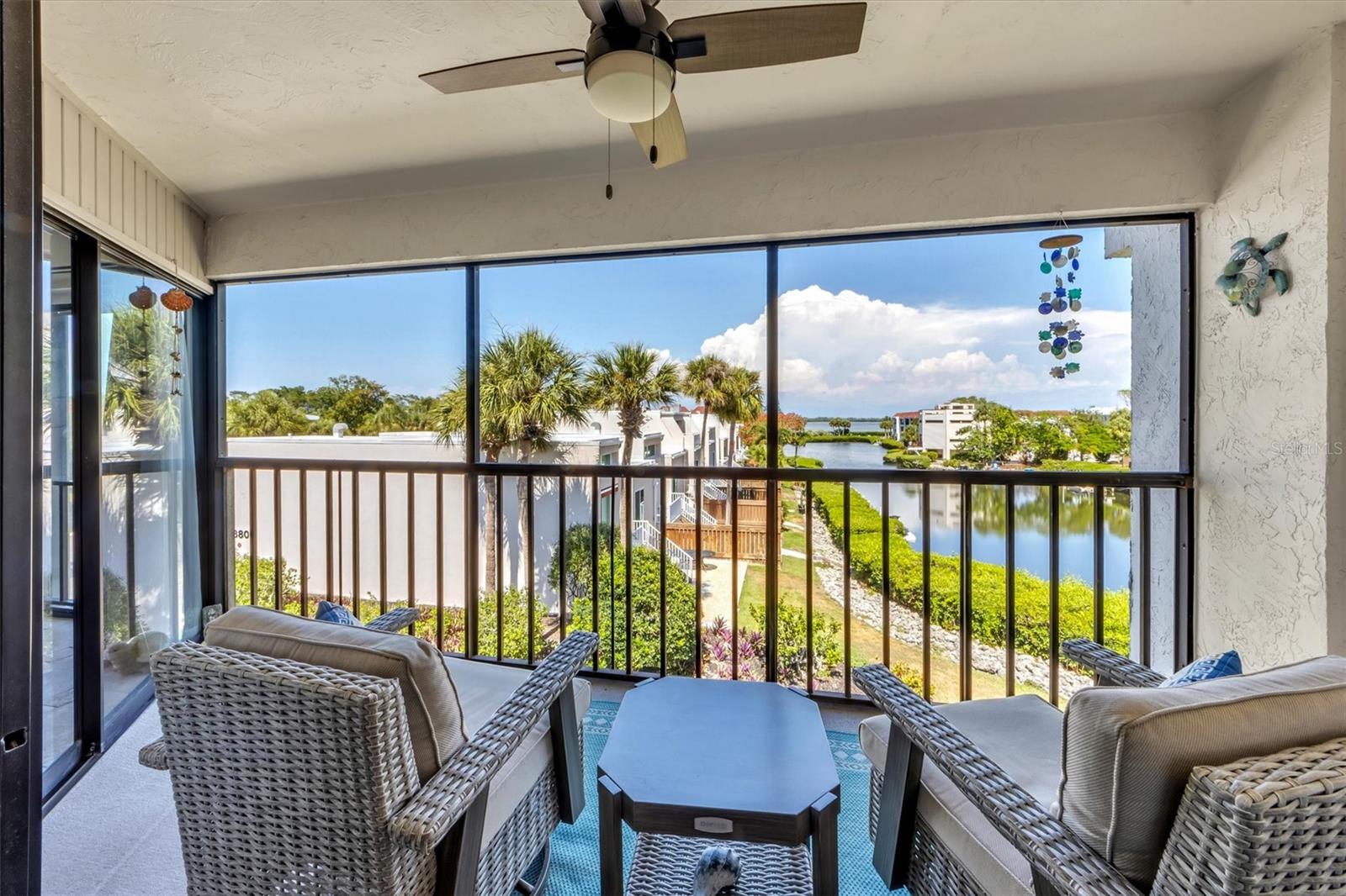 Welcome to Bay Bliss in Sunbow Bay. The condominium is a two-bedroom, two-bathroom condominium on the top floor. When you enter the home and walk into the living room you are greeted by one of the best water views in the building. The wall-to-wall patio doors from the living room all overlook the secluded lagoon where you can launch paddle boards or kayaks from the community dock. This lagoon is home to manatees and dolphins throughout the year. Beyond that you look across the mangroves out to the intercoastal waterway. You will also be greeted by gorgeous sunrises most of the year. Bay Bliss has been completely updated from the original. The kitchen has new Shaker cabinets and new quartz countertops. All the appliances are less than three years old, including a new full-sized washer and dryer that have replaced the old compact stackable. The original enclosed galley kitchen has been opened to the living room with a breakfast bar. The entire condominium has gorgeous tile floors for easy maintenance. The primary bedroom with a king-sized bed also has wall to wall patio doors leading out to Lanai with the same gorgeous view. The second bedroom at the front of the unit has two double beds. It is bright and airy due to the ceiling skylight. This skylight has a custom shade to darken the room should you need to. Both the primary and hallway bathrooms have been updated with newer vanities, toilets, and tile work. The large front balcony has room for furniture. All the units have seats out front to enjoy the sunsets to the west. The unit has an assigned parking space, a lockable storage room and outside storage for kayaks and bicycles. The lagoon behind the home provides access for kayaks and paddleboards out to the Inter-coastal. The building has elevator access from the center of the ground floor parking area to each floor. There are also stairs at each end of the building, The community is right at the intersection of SR64 and E Bay Dr allowing easy access on and off the island. The present owners and family members use it regularly. However, they do rent it seasonally: 2023-$37,101, 2024-$26,817 The building had a new roof and skylights installed 12/2024 and there was no damage to the condominium. However, the elevator and swimming pools are out of service and should be operational as soon as the end of February. Do not let this gem get away!!!!