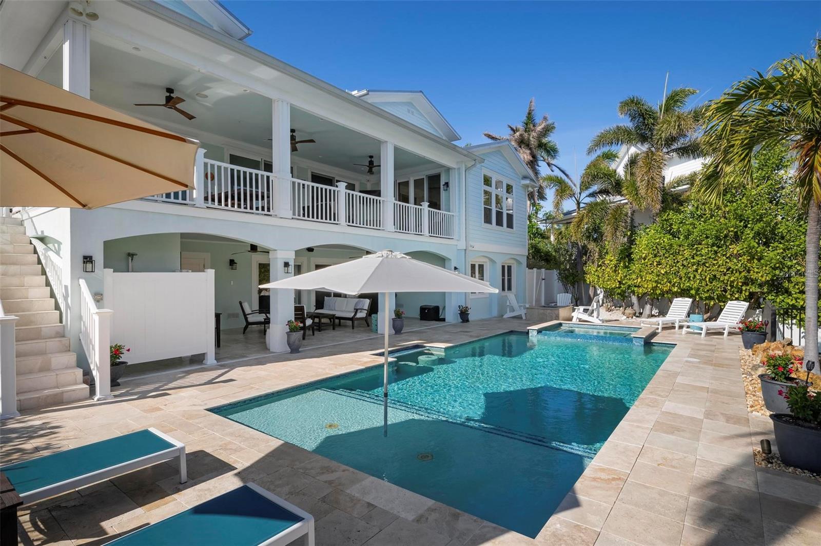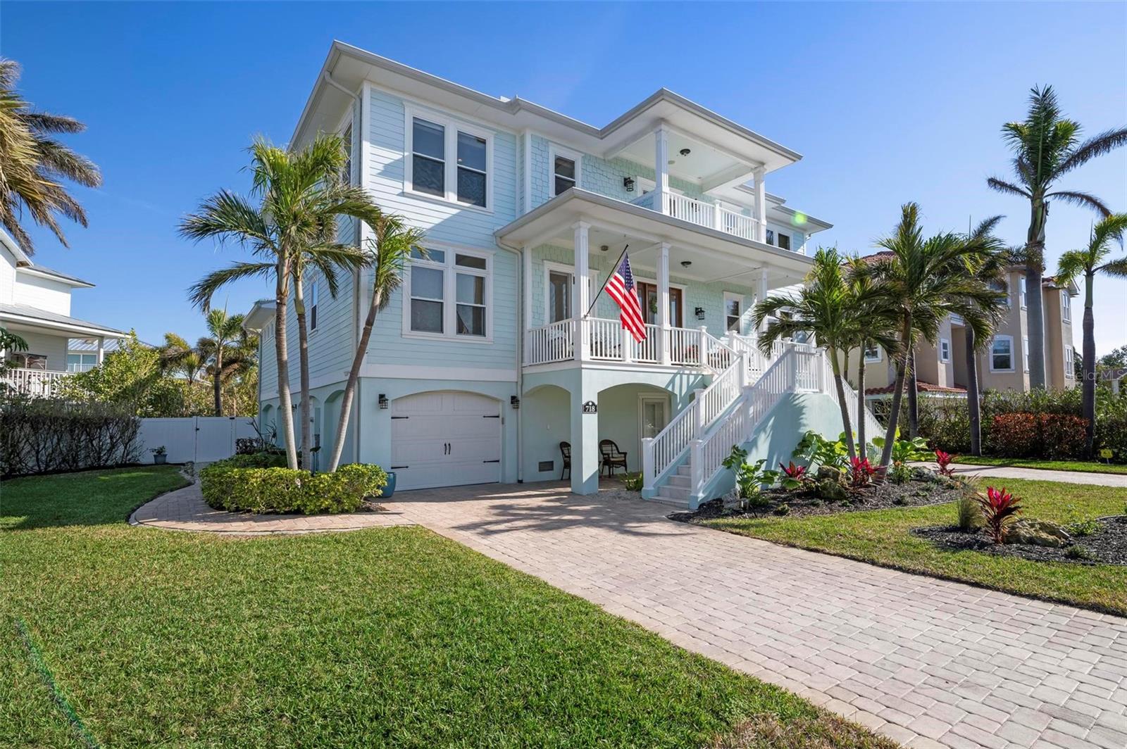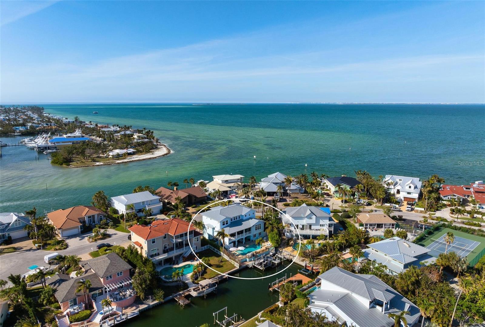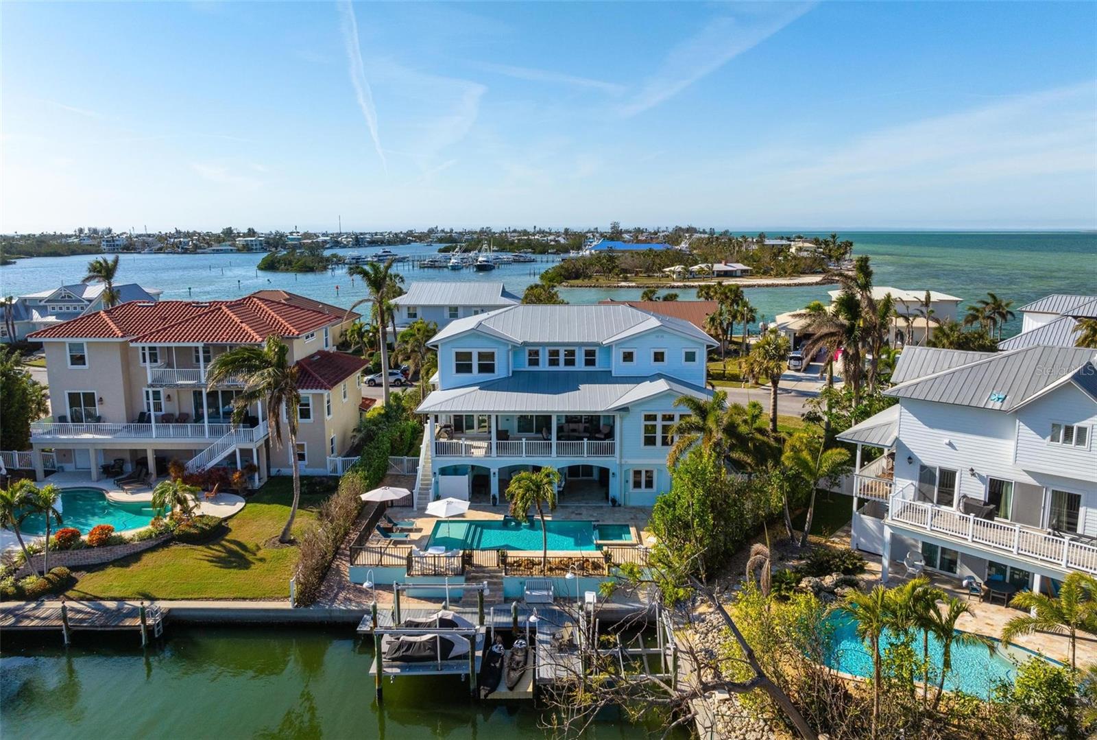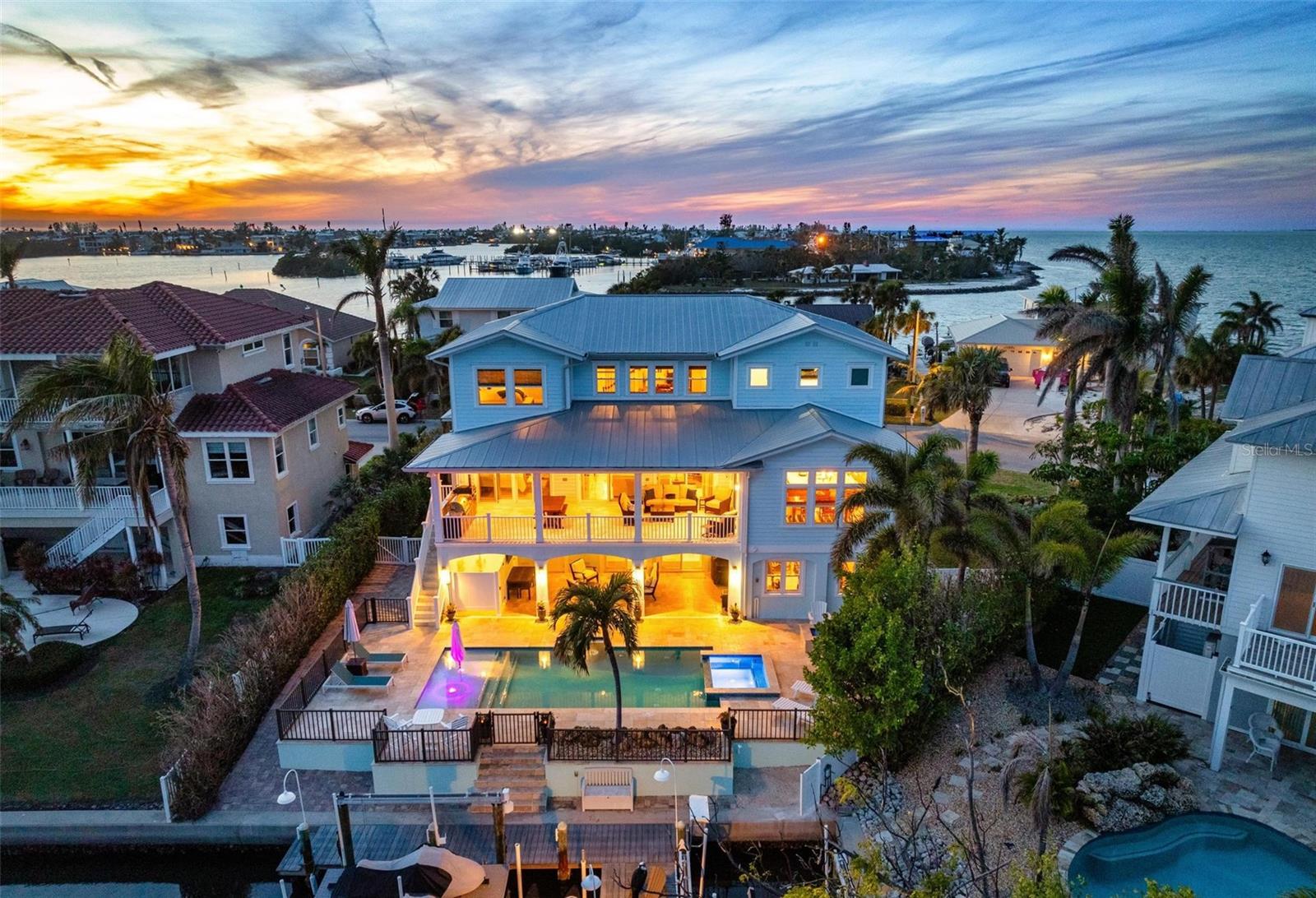 WATERFRONT LUXURY HOME ON ANNA MARIA ISLAND! This elevated home in the coveted Key Royale community had no flood, roof, or soffit damage from the recent storms. This beautiful coastal retreat has multiple balconies which provide stunning views of Bimini Bay and Tampa Bay where you can enjoy your morning coffee or admire the breathtaking sunsets. Ideally located in the North Point Harbour community of Key Royale (which has one of the highest elevations on Anna Maria Island) residents have exclusive access to tennis, pickleball, swimming, and social events and just 2 blocks from the private Key Royale Golf Club. This furnished home offers a relaxed coastal lifestyle perfect for a quiet get-away or for hosting family and friends. The natural light-filled home provides flexibility and comfort with 4 bedrooms, 3 full bathrooms + 2 half bathrooms, an office, and a spacious bonus room with wet bar. Wake up to spectacular Bay views from your upper-level primary suite then revitalize in the serene en-suite bath. Or retreat to the secondary primary en-suite on the main level for ease of access. The gourmet kitchen is a chef’s dream, featuring Wolf/Thermador/Bosch appliances, custom cabinetry, 10-foot marble island, and a bar/pantry complete with a wine chiller and beverage fridge. Ideal for entertaining or relaxing, the spacious living areas include a great room with a fireplace and dining areas with 9.5-foot ceilings and extensive detailed trim. Several large sliding doors open to the expansive rear covered balcony featuring an outdoor kitchen which is perfect for BBQs and watching the manatees and dolphins who are frequent visitors in the canal. Additional outdoor luxuries include another large covered living/dining area adjacent to the heated saltwater pool with sun shelf and waterfall spa, a dock with lift, a floating dock, an outdoor shower, and a gas fire pit. An elevator shaft to all levels, a fishing tackle room, exterior storage room for pool toys or beach gear, versatile lower-level areas, and an expanded garage for your golf cart and bikes make this the ultimate island home. Being on the nearest canal to Tampa Bay through the Bimini Bay channel, you have the easiest access for all your water activities. This home is the perfect blend of elegance and relaxation as your full-time residence or your seasonal tranquil escape. Call for a private showing today.