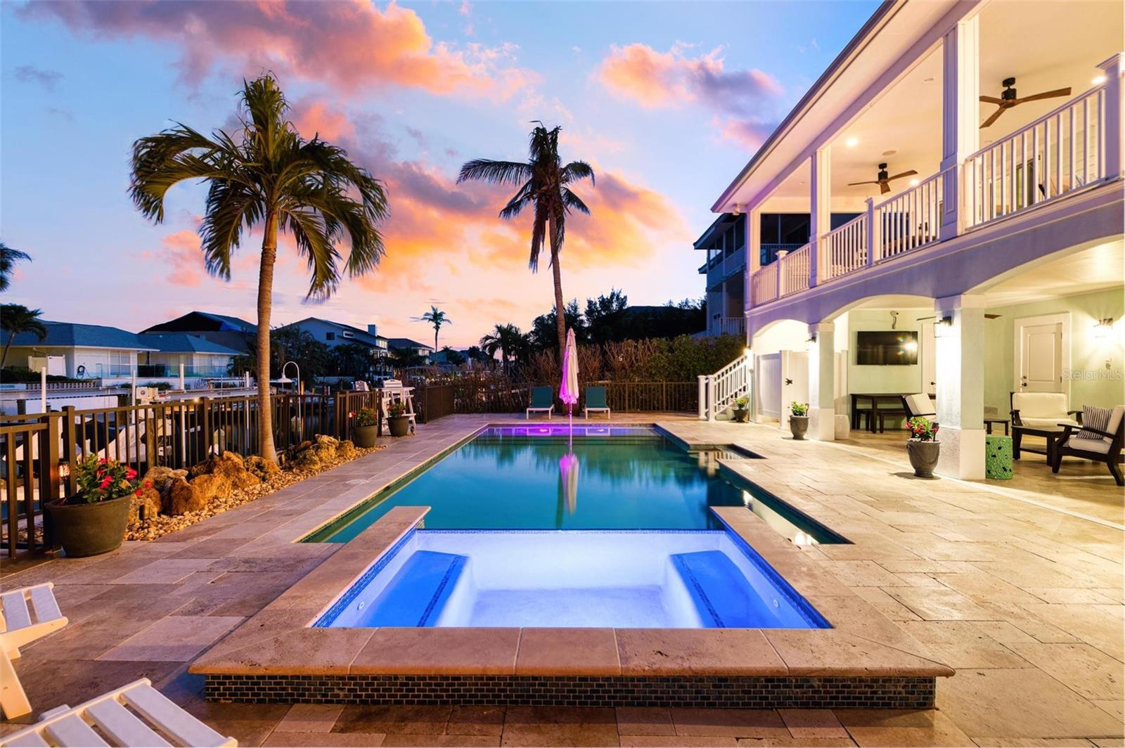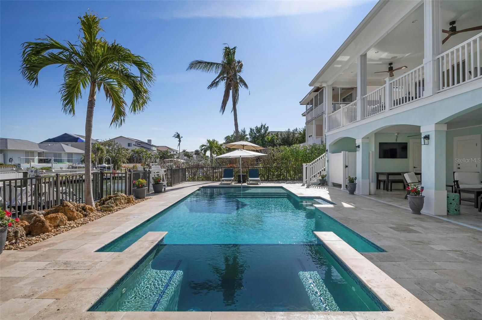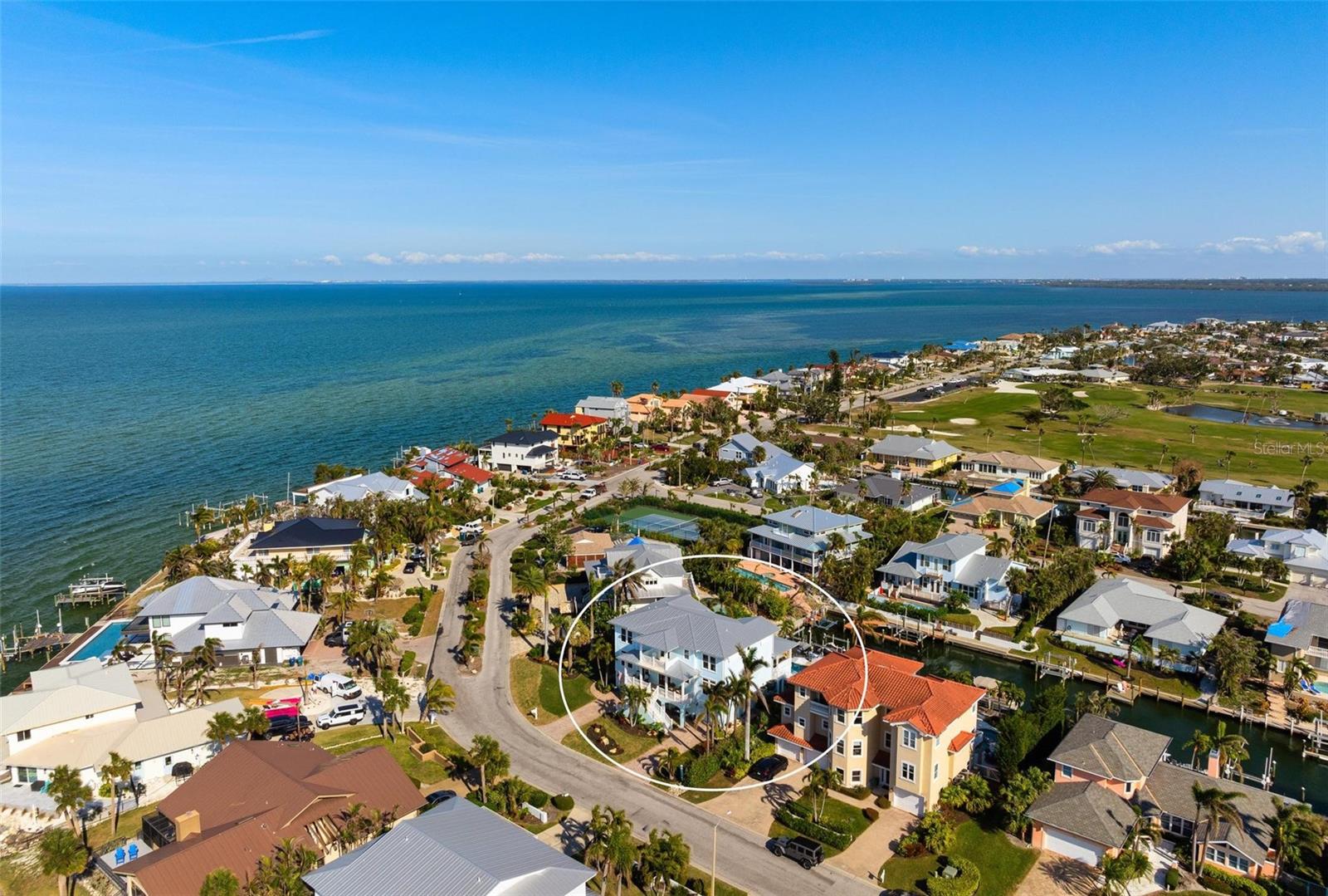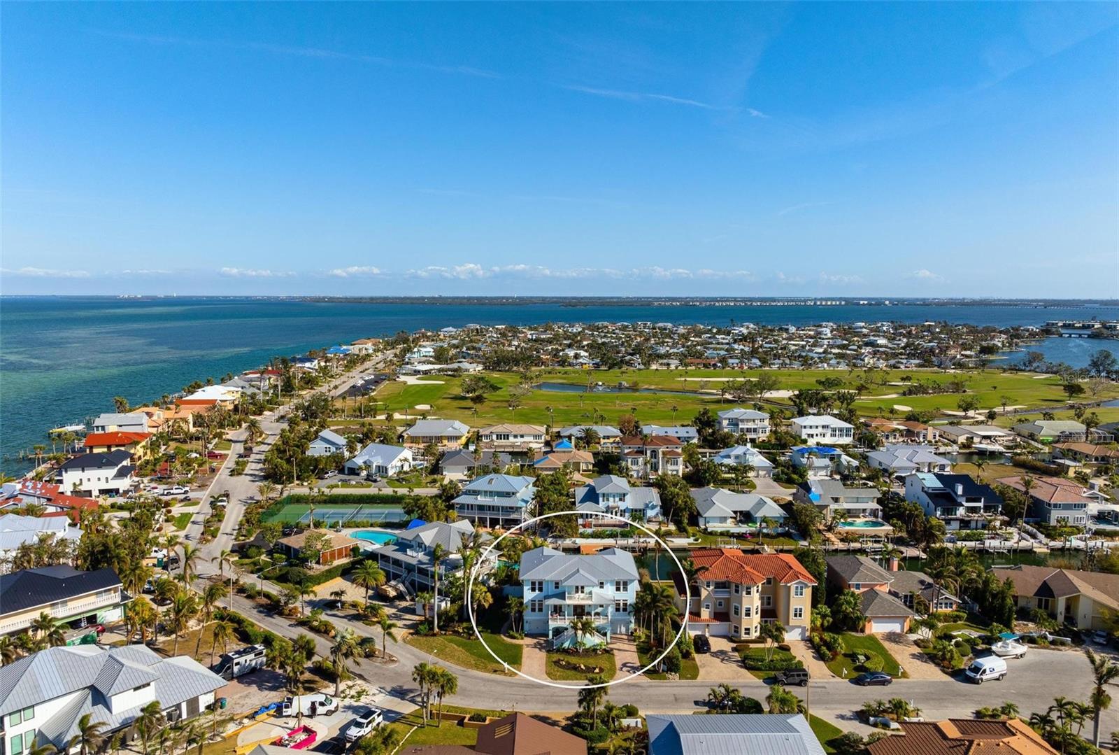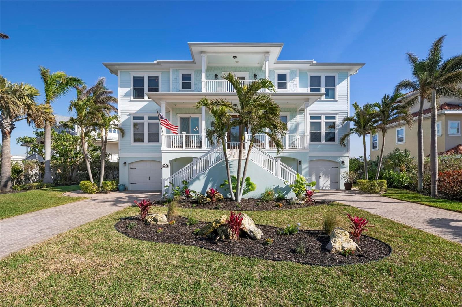 WATERFRONT LUXURY HOME ON ANNA MARIA ISLAND! This elevated home in the coveted Key Royale community had no flood, roof, or soffit damage from the recent storms. This beautiful coastal retreat has multiple balconies which provide stunning views of Bimini Bay and Tampa Bay where you can enjoy your morning coffee or admire the breathtaking sunsets. Ideally located in the North Point Harbour community of Key Royale (which has one of the highest elevations on Anna Maria Island) residents have exclusive access to tennis, pickleball, swimming, and social events and just 2 blocks from the private Key Royale Golf Club. This furnished home offers a relaxed coastal lifestyle perfect for a quiet get-away or for hosting family and friends. The natural light-filled home provides flexibility and comfort with 4 bedrooms, 3 full bathrooms + 2 half bathrooms, an office, and a spacious bonus room with wet bar. Wake up to spectacular Bay views from your upper-level primary suite then revitalize in the serene en-suite bath. Or retreat to the secondary primary en-suite on the main level for ease of access. The gourmet kitchen is a chef’s dream, featuring Wolf/Thermador/Bosch appliances, custom cabinetry, 10-foot marble island, and a bar/pantry complete with a wine chiller and beverage fridge. Ideal for entertaining or relaxing, the spacious living areas include a great room with a fireplace and dining areas with 9.5-foot ceilings and extensive detailed trim. Several large sliding doors open to the expansive rear covered balcony featuring an outdoor kitchen which is perfect for BBQs and watching the manatees and dolphins who are frequent visitors in the canal. Additional outdoor luxuries include another large covered living/dining area adjacent to the heated saltwater pool with sun shelf and waterfall spa, a dock with lift, a floating dock, an outdoor shower, and a gas fire pit. An elevator shaft to all levels, a fishing tackle room, exterior storage room for pool toys or beach gear, versatile lower-level areas, and an expanded garage for your golf cart and bikes make this the ultimate island home. Being on the nearest canal to Tampa Bay through the Bimini Bay channel, you have the easiest access for all your water activities. This home is the perfect blend of elegance and relaxation as your full-time residence or your seasonal tranquil escape. Call for a private showing today.