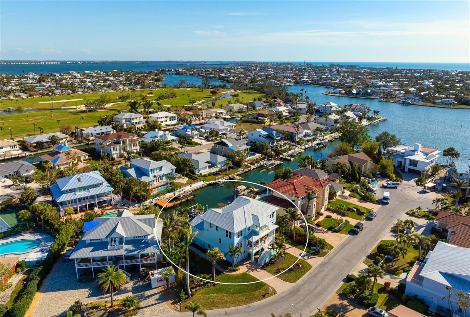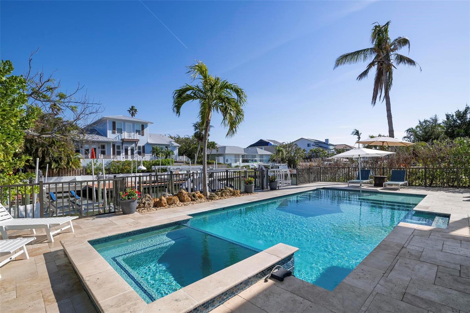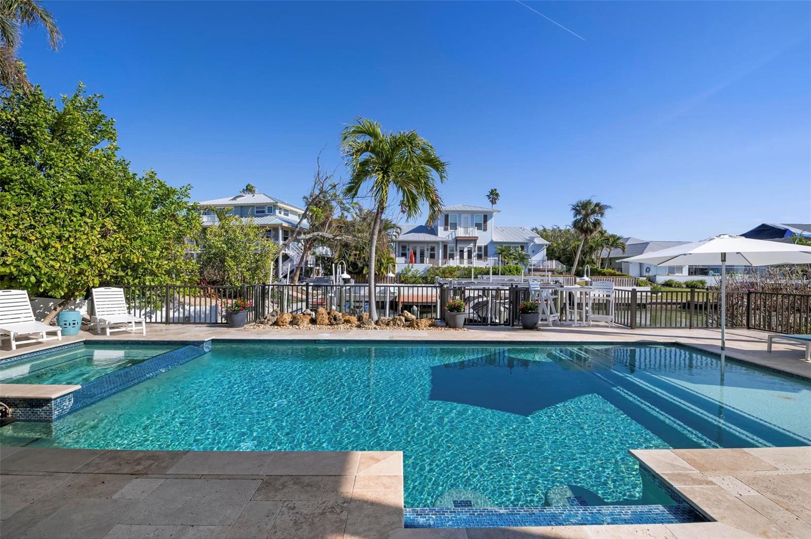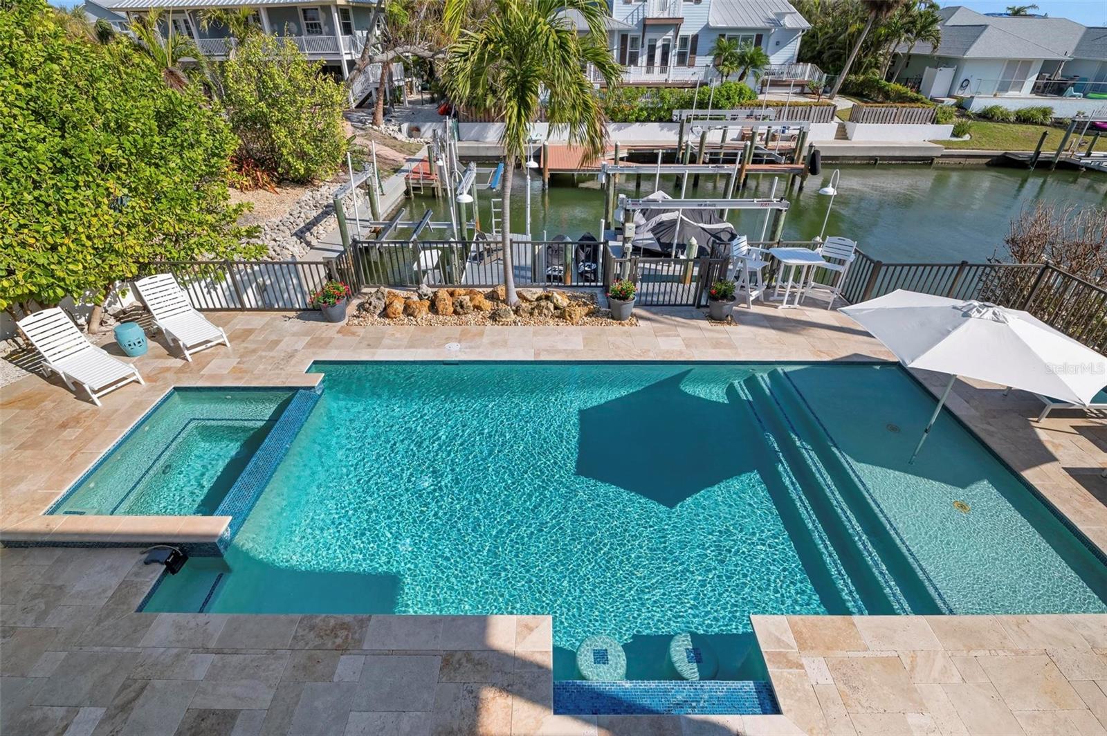 WATERFRONT LUXURY HOME ON ANNA MARIA ISLAND! This elevated home in the coveted Key Royale community had no flood, roof, or soffit damage from the recent storms. This beautiful coastal retreat has multiple balconies which provide stunning views of Bimini Bay and Tampa Bay where you can enjoy your morning coffee or admire the breathtaking sunsets. Ideally located in the North Point Harbour community of Key Royale (which has one of the highest elevations on Anna Maria Island) residents have exclusive access to tennis, pickleball, swimming, and social events and just 2 blocks from the private Key Royale Golf Club. This furnished home offers a relaxed coastal lifestyle perfect for a quiet get-away or for hosting family and friends. The natural light-filled home provides flexibility and comfort with 4 bedrooms, 3 full bathrooms + 2 half bathrooms, an office, and a spacious bonus room with wet bar. Wake up to spectacular Bay views from your upper-level primary suite then revitalize in the serene en-suite bath. Or retreat to the secondary primary en-suite on the main level for ease of access. The gourmet kitchen is a chef’s dream, featuring Wolf/Thermador/Bosch appliances, custom cabinetry, 10-foot marble island, and a bar/pantry complete with a wine chiller and beverage fridge. Ideal for entertaining or relaxing, the spacious living areas include a great room with a fireplace and dining areas with 9.5-foot ceilings and extensive detailed trim. Several large sliding doors open to the expansive rear covered balcony featuring an outdoor kitchen which is perfect for BBQs and watching the manatees and dolphins who are frequent visitors in the canal. Additional outdoor luxuries include another large covered living/dining area adjacent to the heated saltwater pool with sun shelf and waterfall spa, a dock with lift, a floating dock, an outdoor shower, and a gas fire pit. An elevator shaft to all levels, a fishing tackle room, exterior storage room for pool toys or beach gear, versatile lower-level areas, and an expanded garage for your golf cart and bikes make this the ultimate island home. Being on the nearest canal to Tampa Bay through the Bimini Bay channel, you have the easiest access for all your water activities. This home is the perfect blend of elegance and relaxation as your full-time residence or your seasonal tranquil escape. Call for a private showing today.