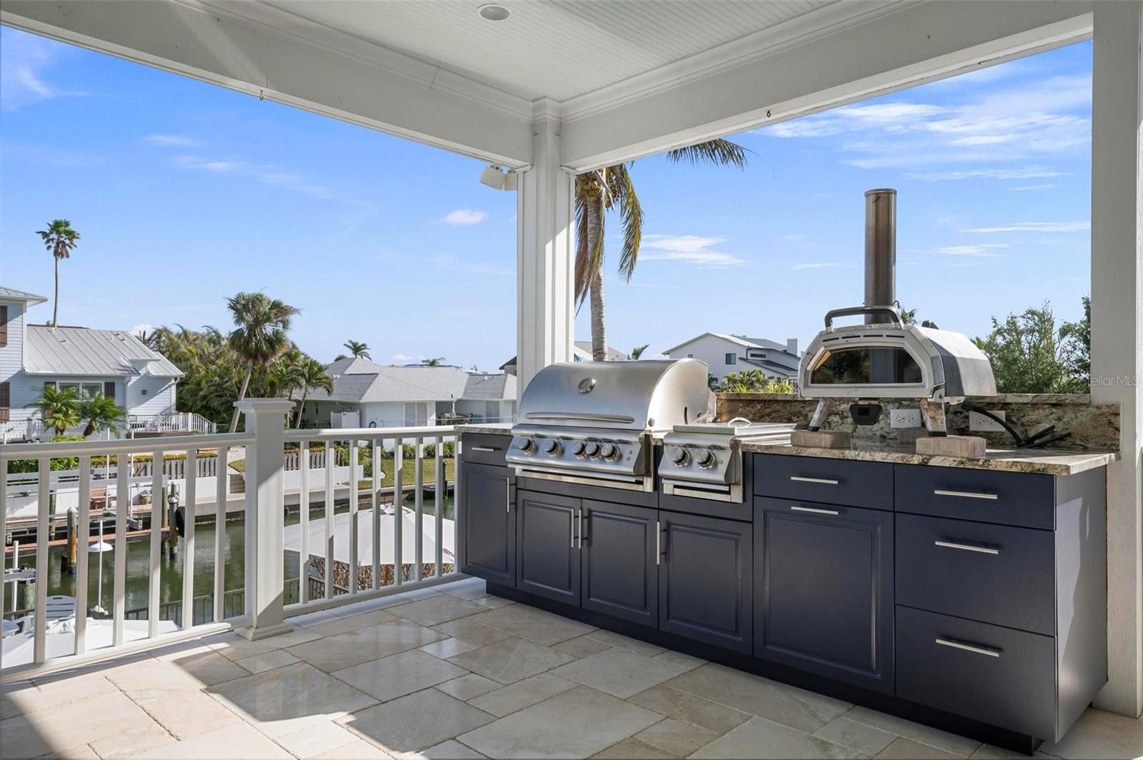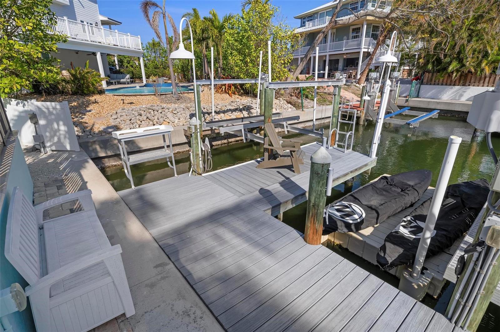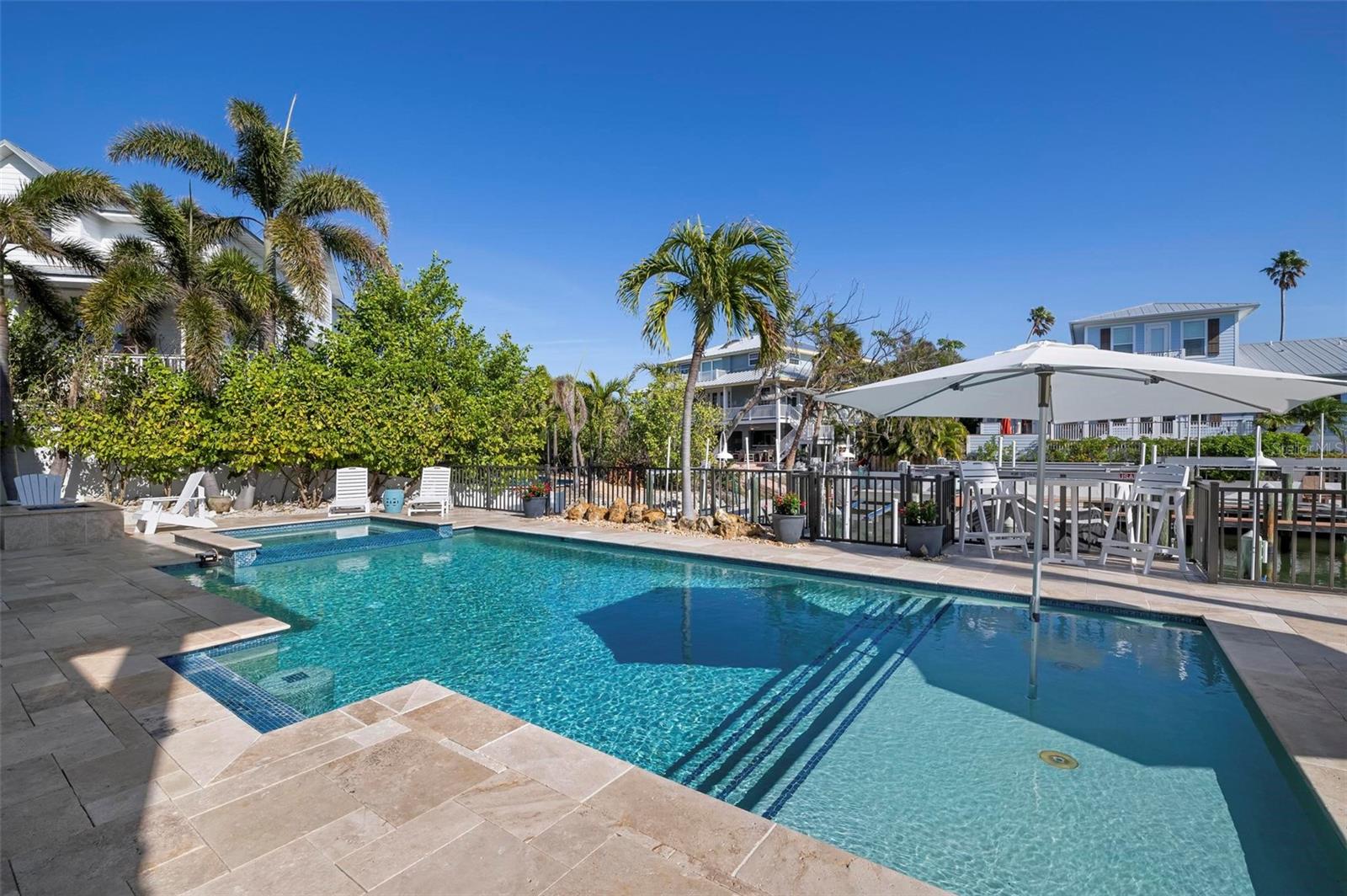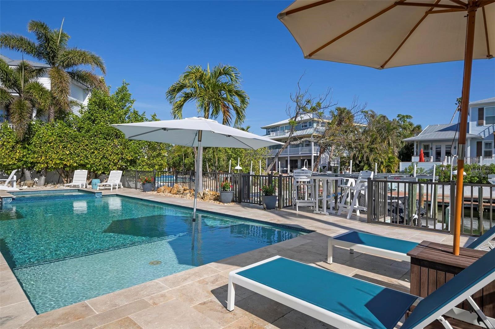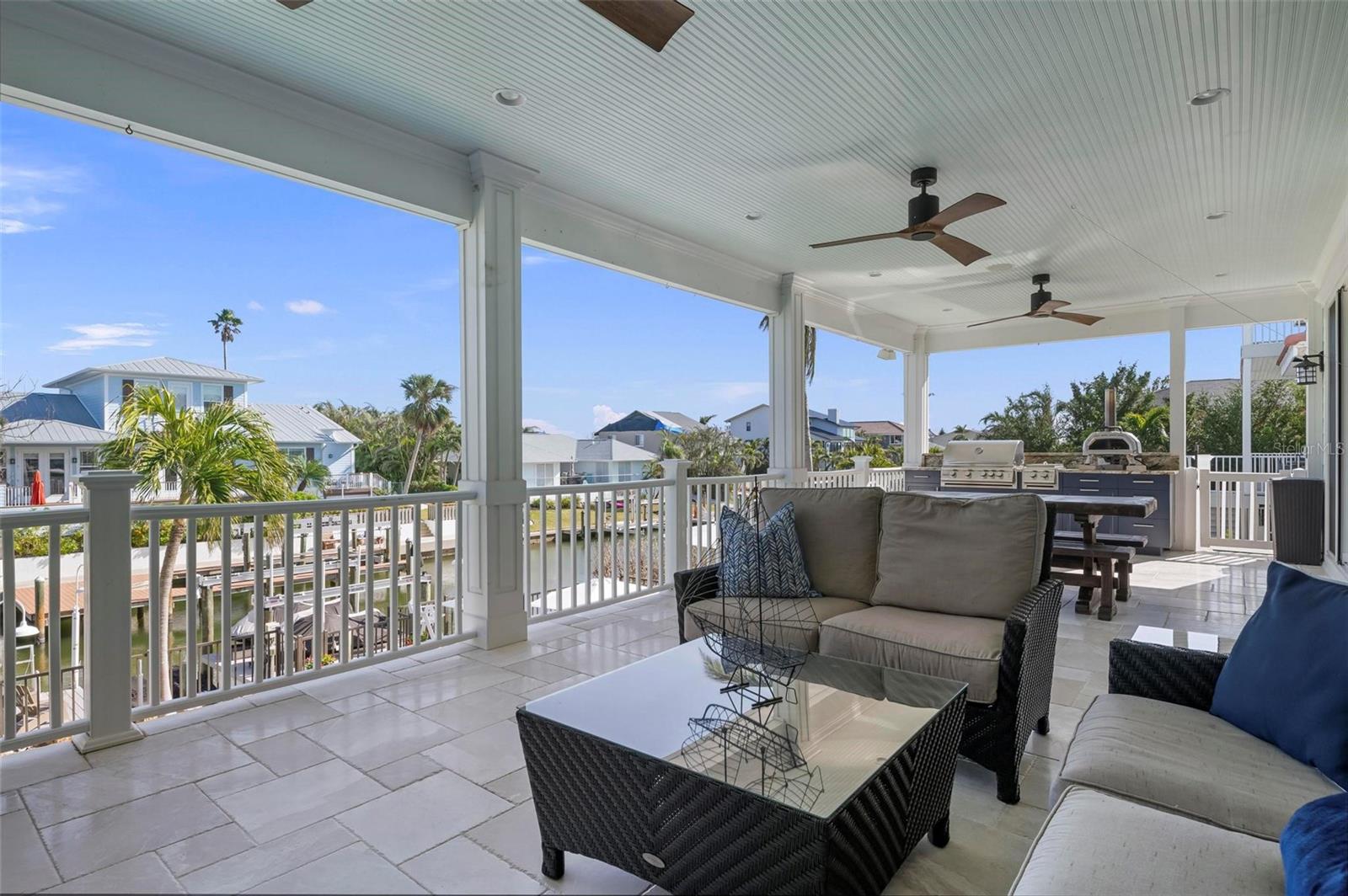 WATERFRONT LUXURY HOME ON ANNA MARIA ISLAND! This elevated home in the coveted Key Royale community had no flood, roof, or soffit damage from the recent storms. This beautiful coastal retreat has multiple balconies which provide stunning views of Bimini Bay and Tampa Bay where you can enjoy your morning coffee or admire the breathtaking sunsets. Ideally located in the North Point Harbour community of Key Royale (which has one of the highest elevations on Anna Maria Island) residents have exclusive access to tennis, pickleball, swimming, and social events and just 2 blocks from the private Key Royale Golf Club. This furnished home offers a relaxed coastal lifestyle perfect for a quiet get-away or for hosting family and friends. The natural light-filled home provides flexibility and comfort with 4 bedrooms, 3 full bathrooms + 2 half bathrooms, an office, and a spacious bonus room with wet bar. Wake up to spectacular Bay views from your upper-level primary suite then revitalize in the serene en-suite bath. Or retreat to the secondary primary en-suite on the main level for ease of access. The gourmet kitchen is a chef’s dream, featuring Wolf/Thermador/Bosch appliances, custom cabinetry, 10-foot marble island, and a bar/pantry complete with a wine chiller and beverage fridge. Ideal for entertaining or relaxing, the spacious living areas include a great room with a fireplace and dining areas with 9.5-foot ceilings and extensive detailed trim. Several large sliding doors open to the expansive rear covered balcony featuring an outdoor kitchen which is perfect for BBQs and watching the manatees and dolphins who are frequent visitors in the canal. Additional outdoor luxuries include another large covered living/dining area adjacent to the heated saltwater pool with sun shelf and waterfall spa, a dock with lift, a floating dock, an outdoor shower, and a gas fire pit. An elevator shaft to all levels, a fishing tackle room, exterior storage room for pool toys or beach gear, versatile lower-level areas, and an expanded garage for your golf cart and bikes make this the ultimate island home. Being on the nearest canal to Tampa Bay through the Bimini Bay channel, you have the easiest access for all your water activities. This home is the perfect blend of elegance and relaxation as your full-time residence or your seasonal tranquil escape. Call for a private showing today.