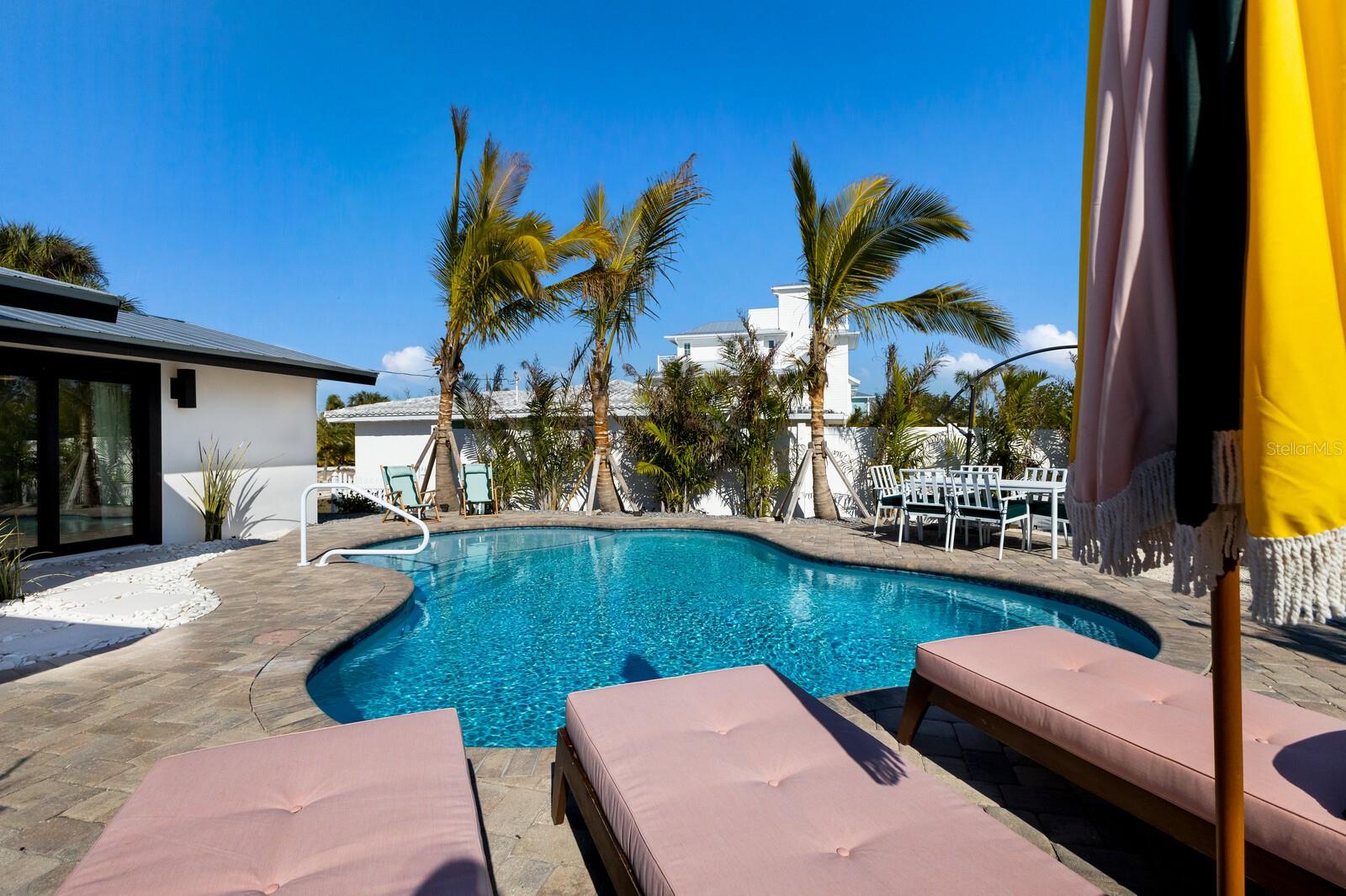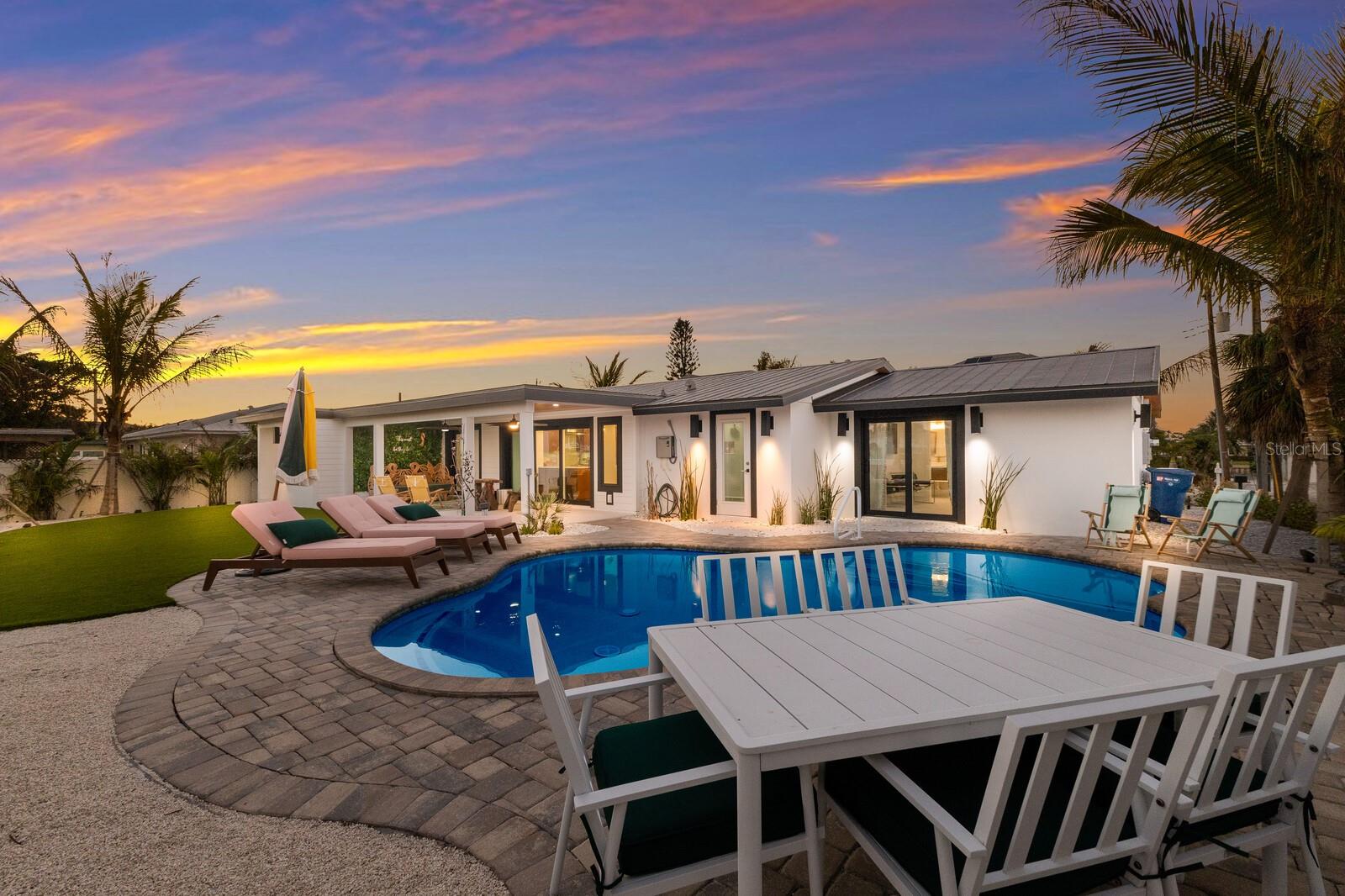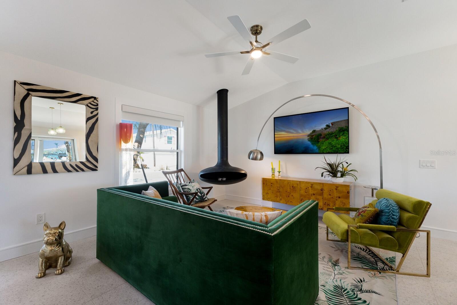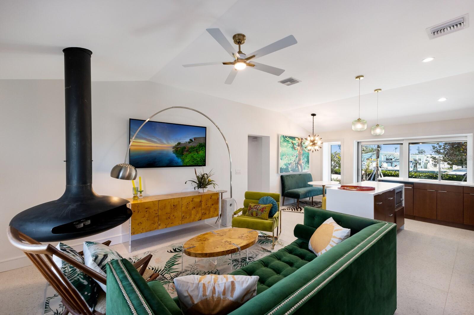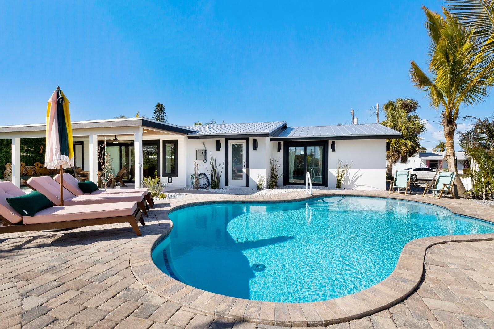 Step into this stunning, brand-new Moss built home, where every detail has been carefully crafted to create a modern, luxury retreat. The spacious living room greets you with oversized terrazzo tiles, flowing seamlessly throughout the entire home, exuding a Palm Springs vibe. A floating fireplace, designed for both wood or decorative candles, serves as a striking focal point. The dining area is beautifully designed with a wall of storage, leading into the custom kitchen outfitted with Eurotech cabinetry, a work island, top-of-the-line appliances, and a pot filler. The coordinating tile backsplash ties together the home’s aesthetic, mirroring the tiles used in the three pristine bathrooms. The primary bedroom suite is a true highlight, featuring a wet bar with a refrigerator, ample storage, and an elegant lighted alabaster countertop. Enjoy the luxury of a walk-in closet and a fabulous en-suite bath with a soaking tub, double vanities, and a large walk-in shower with direct access to the open-air outdoor shower and pool area. On the opposite side of the home, a spacious second bedroom offers an en-suite bath and sliders leading out to the outdoors. The third bedroom, located just across the hall from a convenient pool bath, includes a washer/dryer and an exterior door, perfect for guests enjoying the pool. Newly constructed with everything from under-house plumbing to the new electric service, insulation, walls, and floors, this home has been designed for the ultimate comfort and convenience. Outside, enjoy tropical landscaping by Lancaster Design, featuring pavers and turf, along with a sandy area. The brand-new Trex deck, with water and electricity, is perfect for relaxing by the canal, and the 10,000 lb. boat lift provides easy access to the water for boating adventures. This home is being sold turnkey furnished, with a custom golf cart and a 2022 Carolina Skiff included, making it the ultimate Anna Maria Island getaway. Located on a cul-de-sac and just minutes from shops, restaurants, and the beach, this property offers the perfect combination of luxury living and island charm. Don’t miss the chance to make this dream home yours—schedule a showing today!
