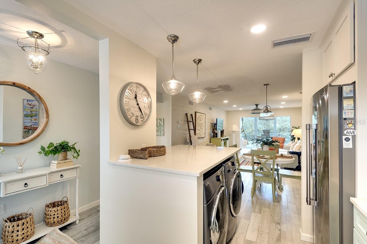 This modern and COMPLETELY REMODELED 2bed/2bath island retreat is conveniently located mid island just steps to the public beach and miles of sugar sand beach. Tucked away in a quiet enclave the property is MOVE-IN READY. The décor is a relaxing beach casual and was meticulously maintained and renovated with modern updates including: New AC in 2024, high-impact "HURRICANE RESISTANT" WINDOWS & SLIDERS, durable wood grain tile throughout (NO CARPET), plantation shutters, Wi-FI enabled front door lock & thermostat, upgraded light fixtures and LED recessed lighting, ceiling fans, wood plank accent wall, new furniture, custom bathrooms and painted throughout. The well-equipped modern kitchen, central to all activities, has also lovingly updated with solid wood cabinets, quartz countertops with breakfast bar, glass tile backsplash, and upgraded stainless steel appliances. Also, the unit’s TOP FLOOR location means no neighbors above for quiet enjoyment. Take in the amazing sunsets from the extended lanai oriented with the coveted WEST EXPOSURE overlooking the pool and tropical landscaping. Outdoor spaces include heated pool with color coordinated brick pavers, BBQ grilling area, shuffleboard courts and storage for beach chairs and bicycles. Cayman Cay also has a progressive monthly rental policy if generating income is on your radar when not occupying the home yourself. The convenience of this LOCATION cannot be overstated as it’s ideally situated just minutes from popular restaurants for casual and fine dining, Publix grocery (1/2 mile), CVS Pharmacy (1/3 mile), Ace hardware (2/3 mile) and Sarasota/Bradenton International Airport (16 miles) as well as the many attractions of Bradenton and Sarasota including, multiple performing arts venues, galleries, world class dining, golf courses and so much more…just minutes away. You’ll enjoy EASY, RELAXED AND CONVENIENT LIVING…… Just bring your suitcase and immerse yourself in the coveted laid-back Island lifestyle!