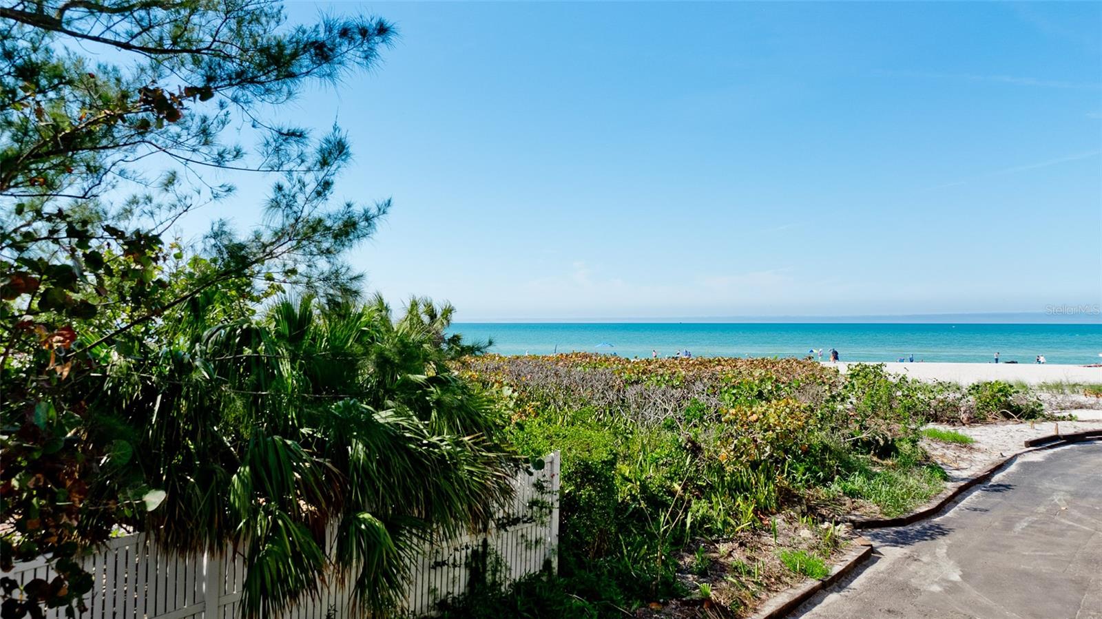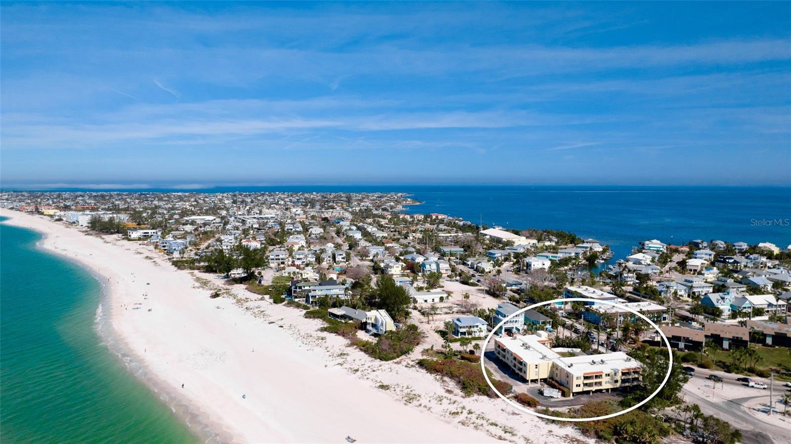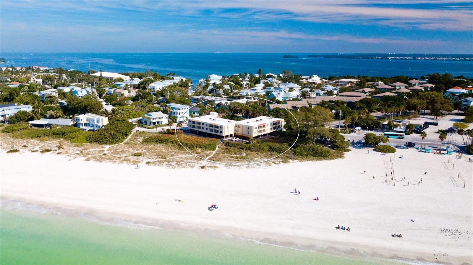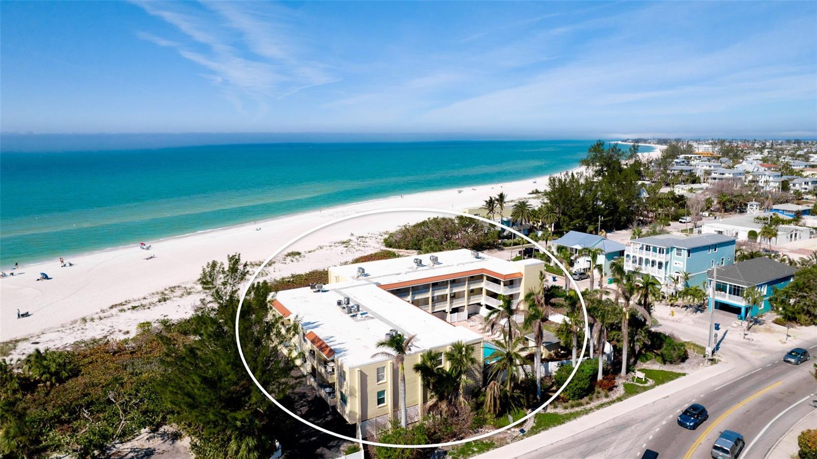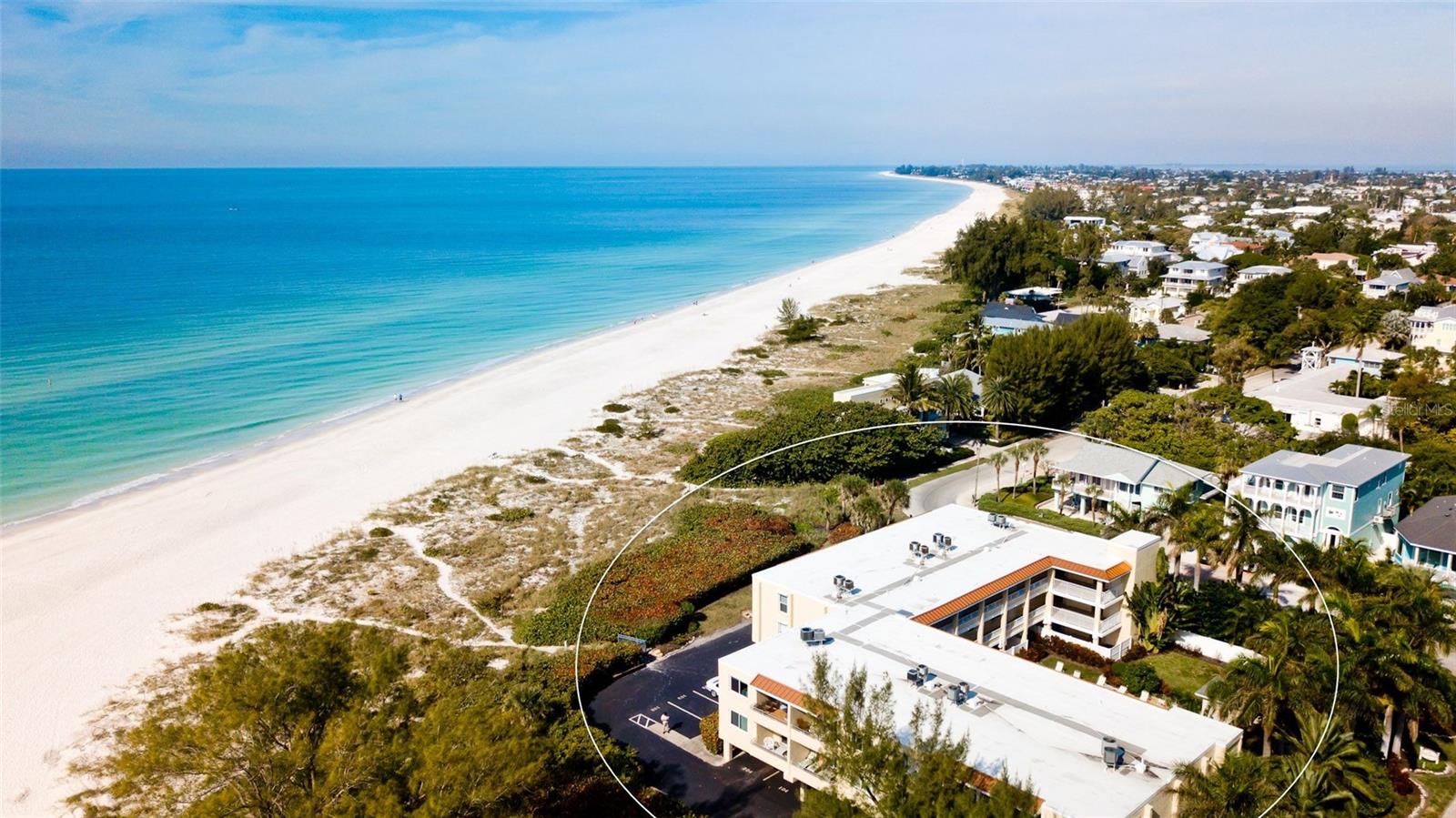 Gulfsands is an elevated direct beach front condominium over looking the beautiful Gulf waters and sandy beaches. This 2 bedroom 2 bath open floor plan is being sold turn key furnished. The complex has a large heated swimming pool, elevator, private beach access, and mature lush landscaping. Conveniently located in the heart of Holmes Beach adjacent to the public beach for added amenities and lifeguard protected beaches. Just a short walk or bike ride to stores, and restaurants. This end unit has 2 reserved covered parking spaces and a private beach storage closet. The primary bedroom has king bed, the 2nd bedroom has queen bed and both rooms have walk in closets. Ceramic tile throughout the unit with a well equipped kitchen. The lanai provides a partial Gulf view and will provide a wonderful gathering place for your morning coffee and afternoon relaxation. Weekly rentals are allowed.