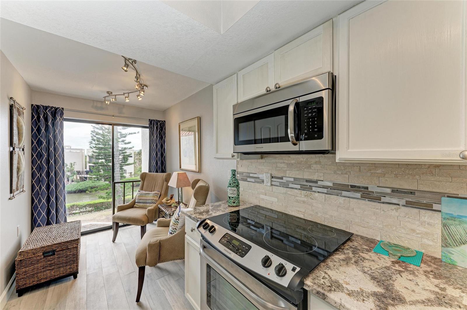 Rare condo that shows better in person that in photos! Beautifully updated 917 SF one bedroom condo (larger than some 2 BR condos) with lagoon views plus views of a pool and peaks of the bay. This unit is TURNKEY FURNISHED with a coastal flair and everything you need to live the island life! Features a light upgraded kitchen with granite counters, stainless appliances and a pantry. A seating area in the rear of the kitchen (or could be an Eat-In area) with views of the lagoon. Light tile plank floors throughout. Open plan with kitchen opening to dining room and living room. Screened porch off living room and bedroom. Bathroom has dual sinks with access to living room and bedroom. Building has BRAND NEW ROOF. There are two community pools, tennis courts, pickle-ball & inside storage cages for each condo. 3805 is the only building with fitness room, meeting/party room, room for inside storage of bikes, workshop with shelf for each resident to store materials. There is a kayak rack in the parking garage. Sunbow Bay is one of the island’s hidden gems. The back of the complex is a waterfront oasis with beautiful grounds, a long fishing pier on the bay with places to dock a boat for the day and 4 kayak launches. Convenient location with Trolley stop at the street plus grocery, hardware & restaurants across the street. The fabulous gulf beach is just a couple of blocks away. Come join the fun of living on Anna Maria Island! Must see! (taxes are reflective of homestead & disabled veterans exemptions).